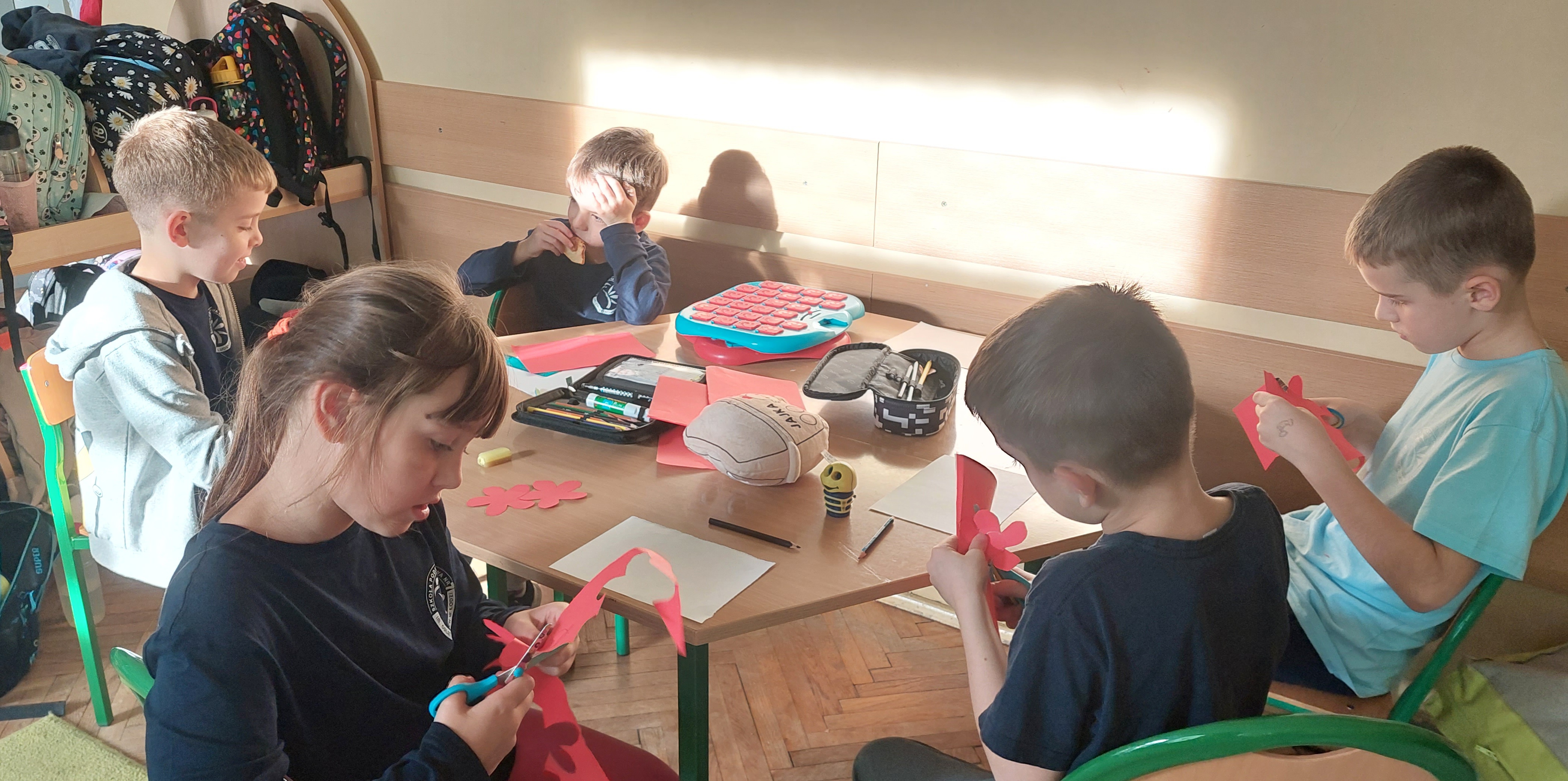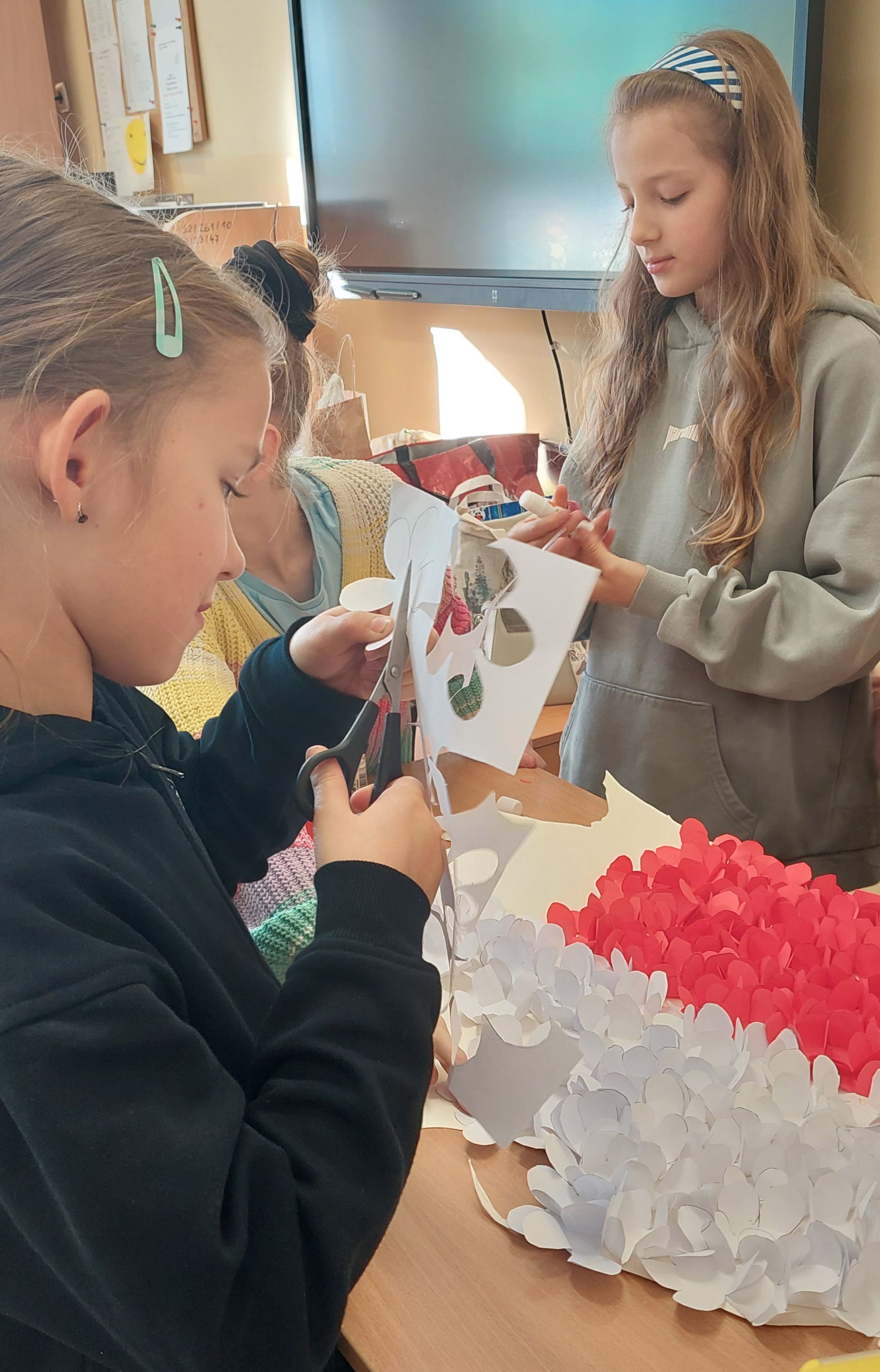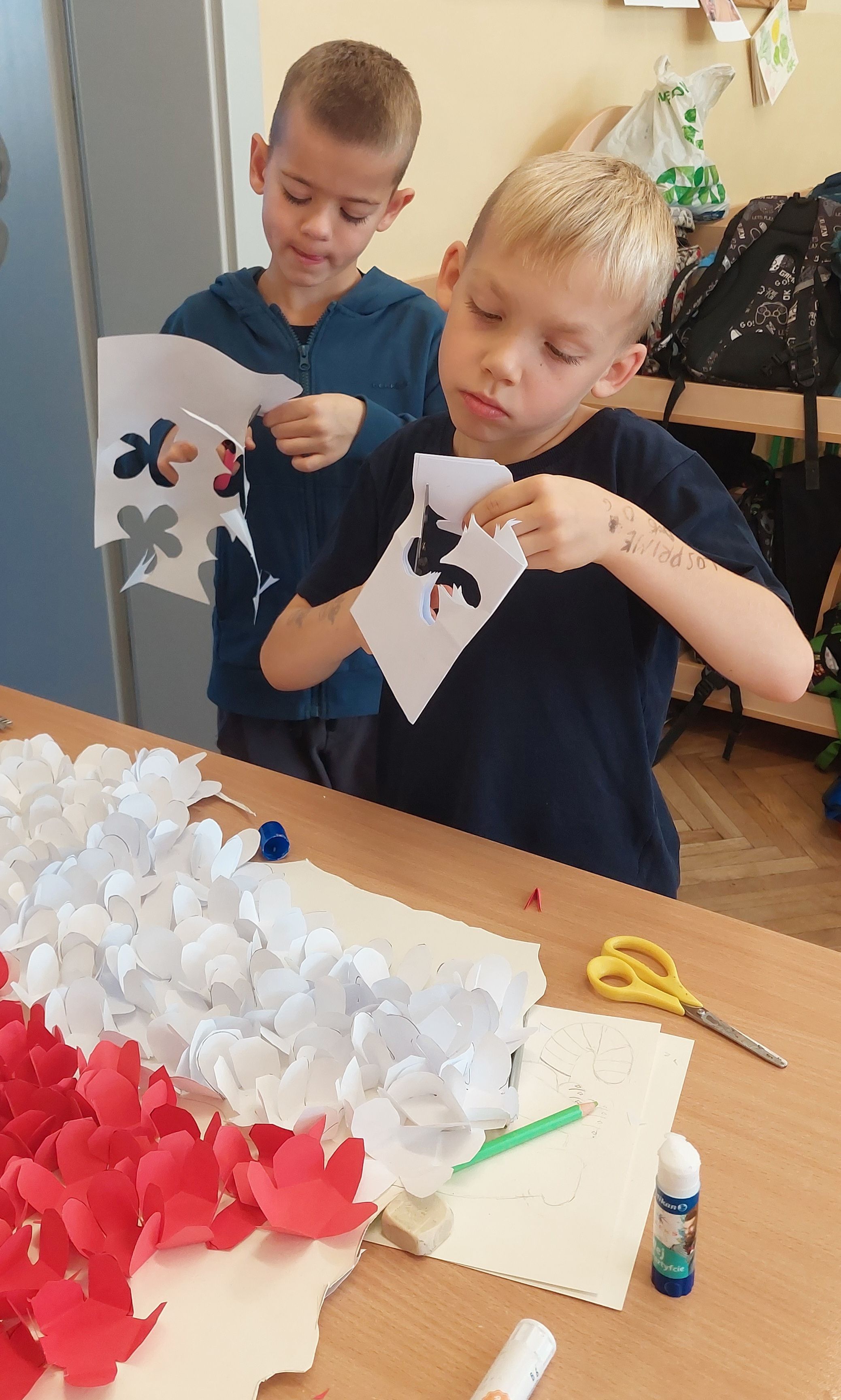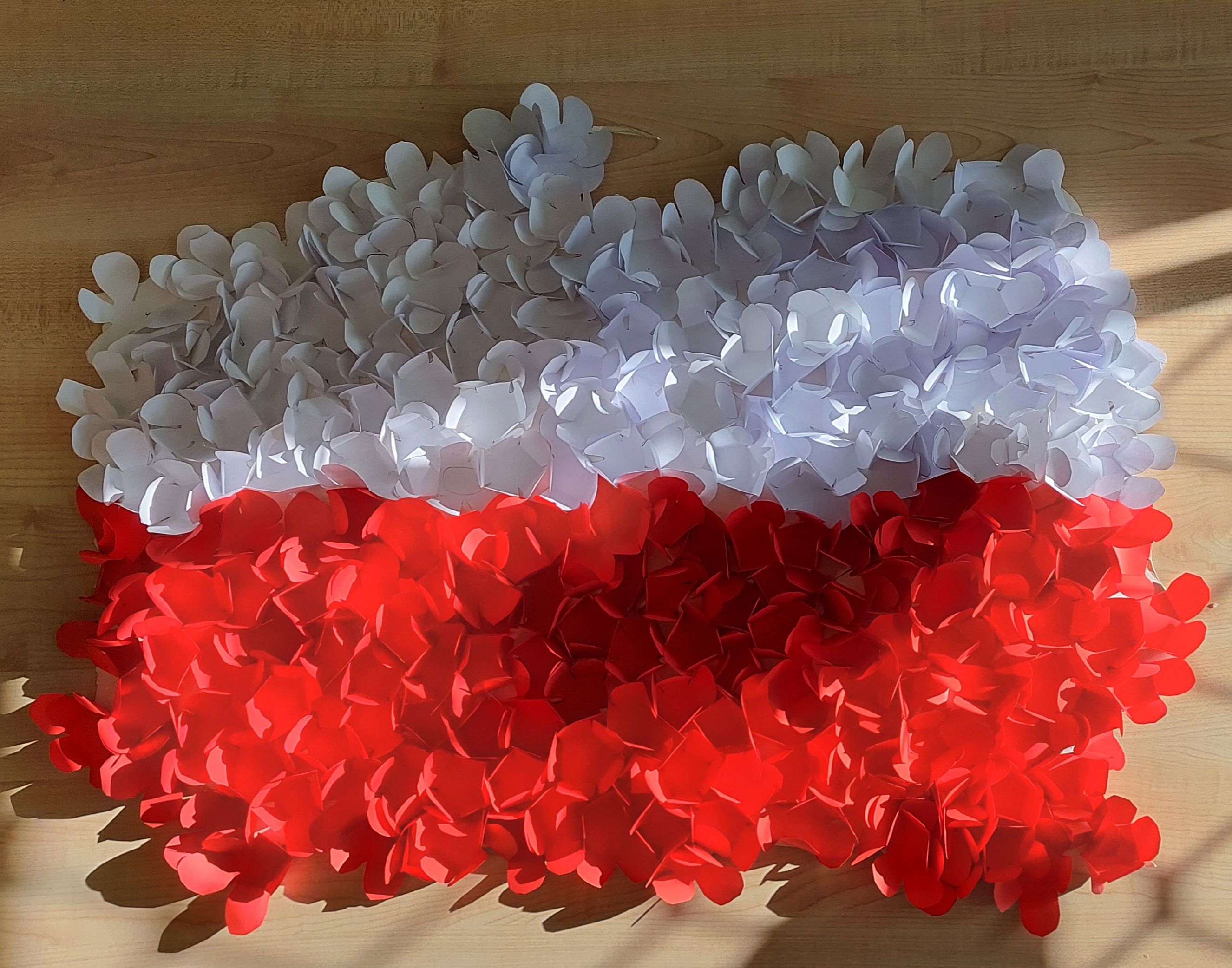 Podczas czwartkowych zajęć w świetlicy rozmawialiśmy o symbolach narodowych Polski. Dzieci wykazały się bardzo dobrą znajomością barw narodowych oraz ich znaczenia. Wspólnie odśpiewaliśmy fragment Hymnu Państwowego, pamiętając o zachowaniu odpowiedniej postawy i powagi. Następnie dzieci obejrzały krótki film edukacyjny o Mazurku Dąbrowskiego, z którego dowiedziały się m.in. kim był Józef Wybicki oraz gdzie powstał nasz Hymn. Na zakończenie zajęć wszyscy uczestnicy wzięli udział w tworzeniu mapy Polski, którą wyklejali kwiatami w barwach narodowych – białej i czerwonej. Powstała praca plastyczna ozdobiła drzwi naszej świetlicy, przypominając o patriotyzmie i miłości do ojczyzny.