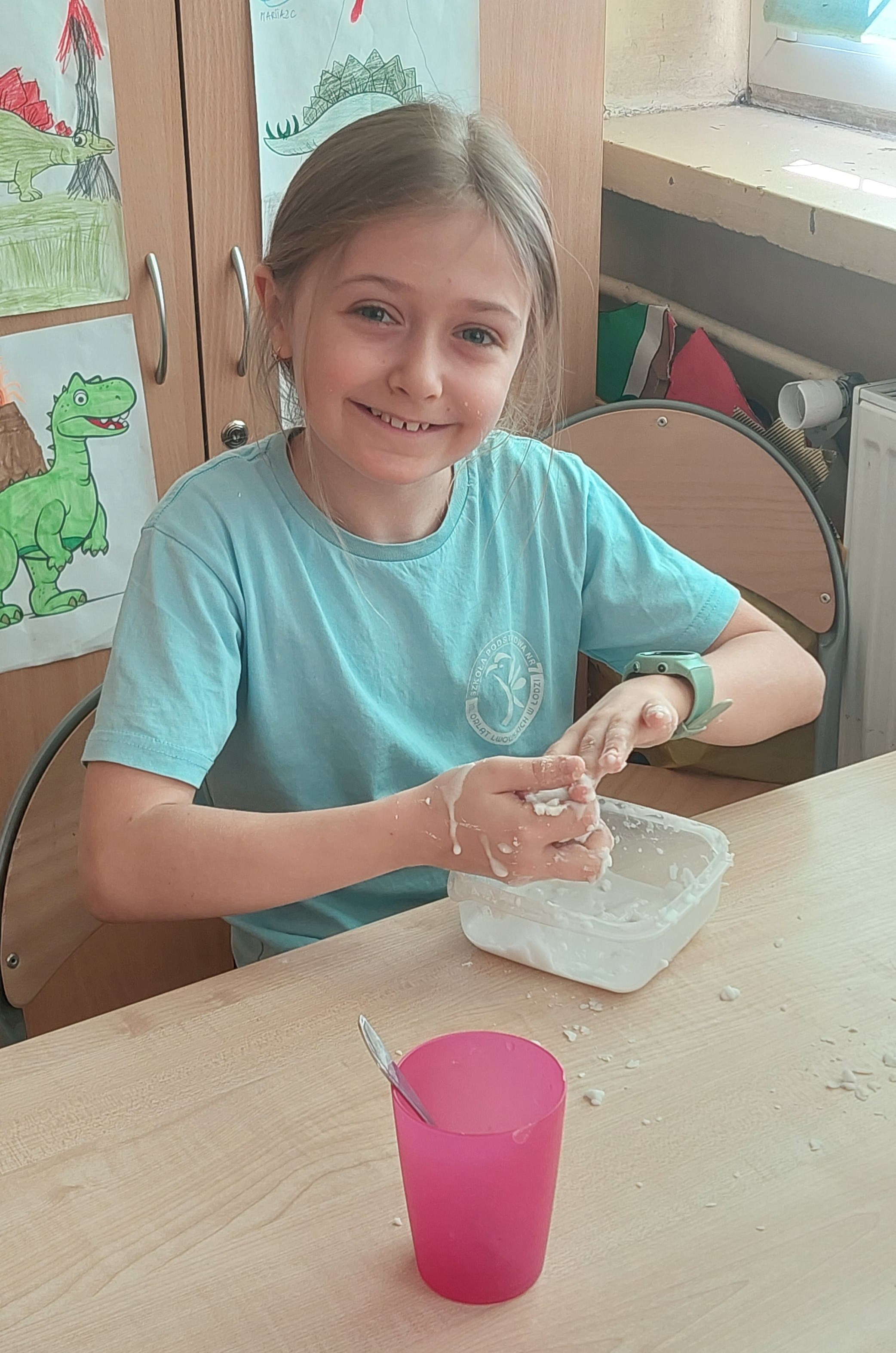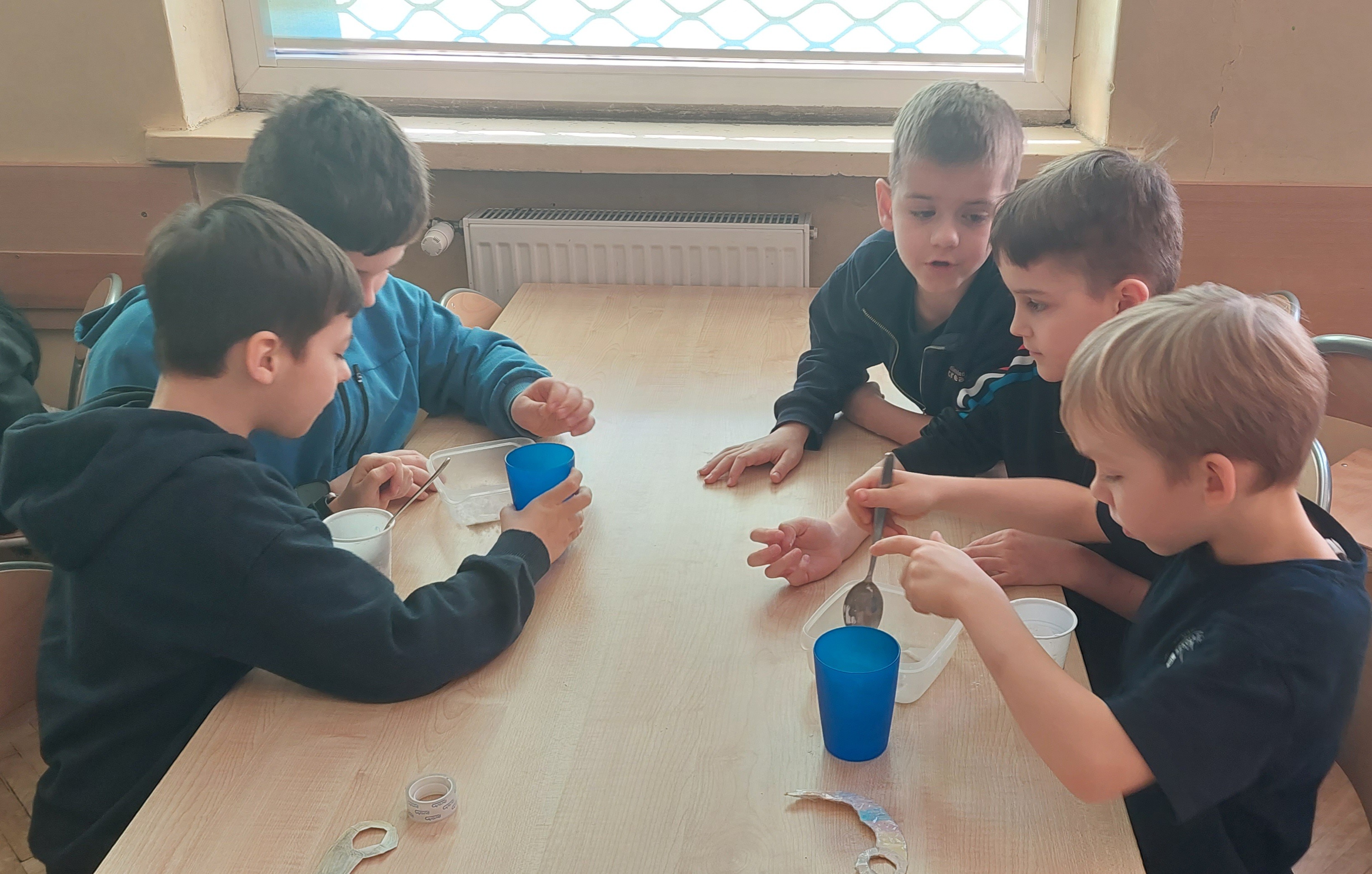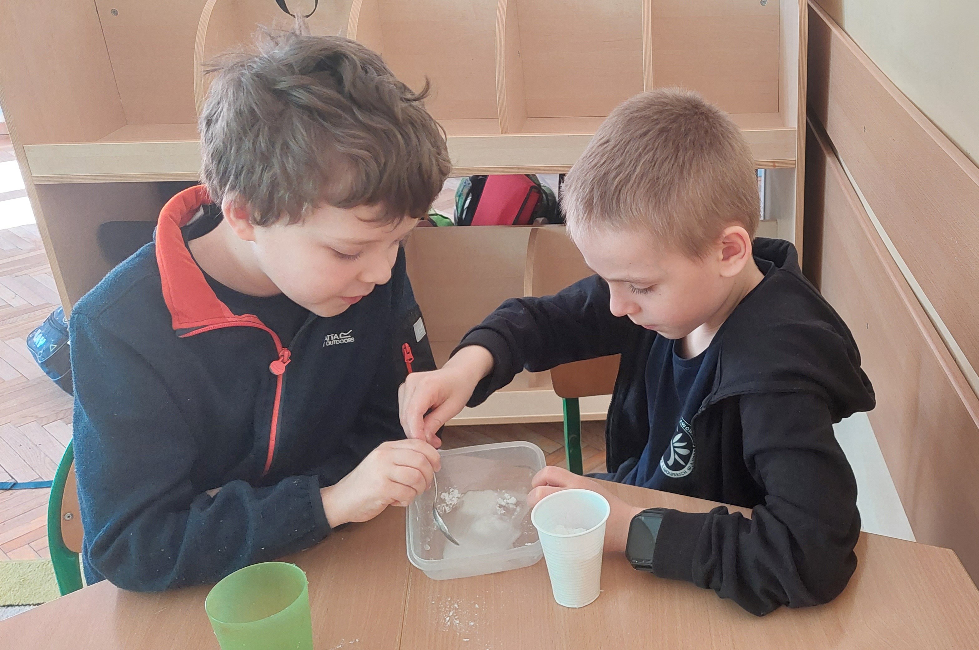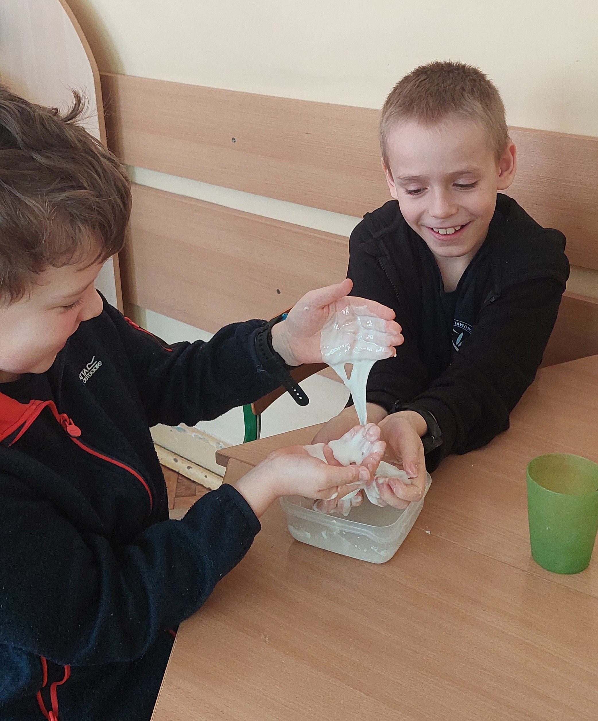 Na zakończenie dzieci stworzyły z tych składników ciecz nienewtonowską. Ta niezwykła substancja zmienia się pod wpływem działającej na nią siły. Pod naciskiem (uderzenie, ugniatanie) zachowuje się jak ciało stałe, a bez nacisku płynie jak ciecz. Eksperyment dostarczył mnóstwo radości i wywołał wiele uśmiechów. Była to nie tylko świetna zabawa, ale również wartościowe ćwiczenie sensoryczne, które pozwoliło dzieciom lepiej zrozumieć niezwykłe właściwości niektórych substancji.