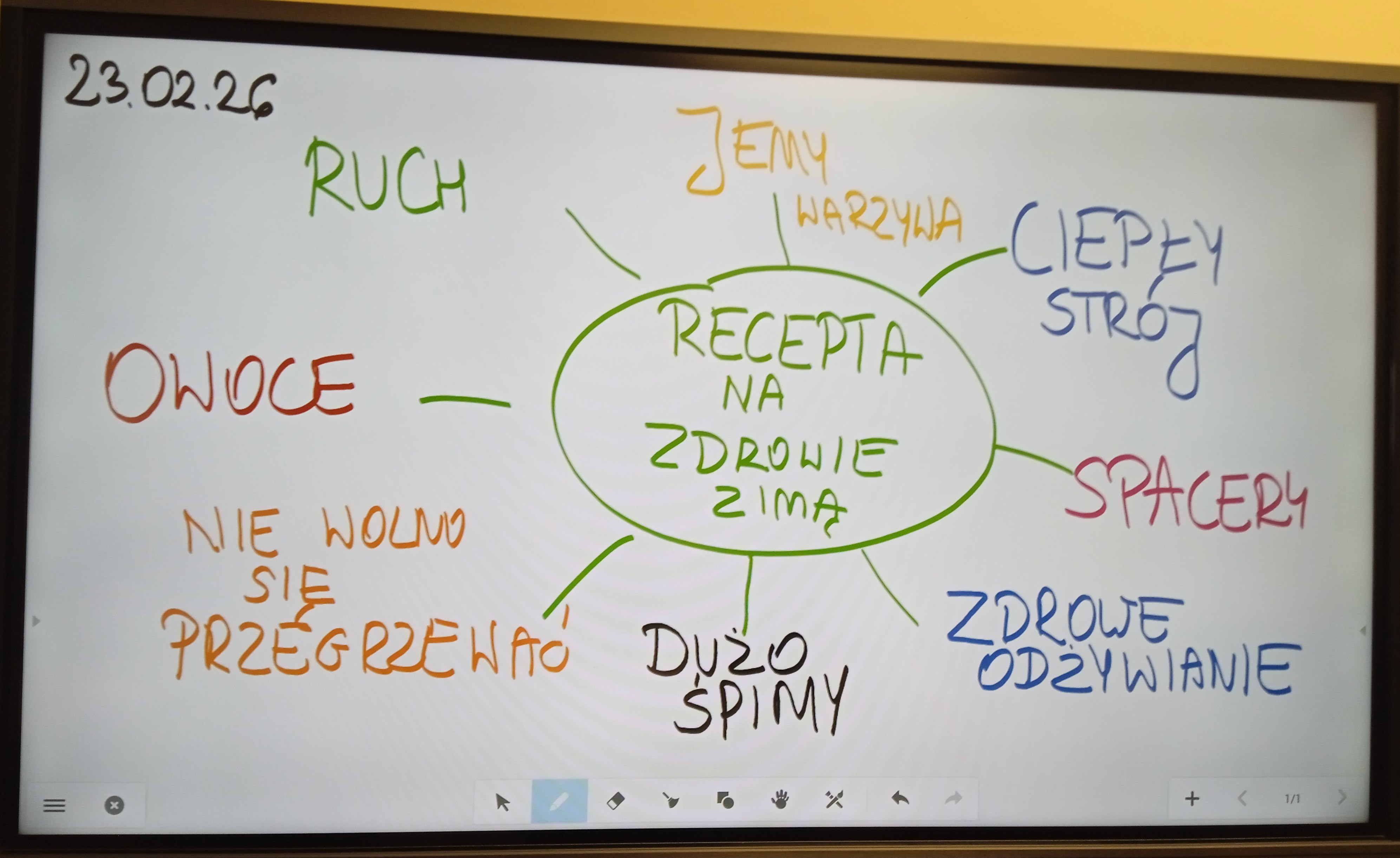 23.02.2026r. chętne dzieci z klasy 1a zastanawiały się nad tym, co trzeba zrobić, aby uniknąć przeziębień i być zdrowym zimą. Stworzyliśmy nasza wspólną zimową "receptę na zdrowie." Ważne jest zdrowe odżywianie, (w tym spożywanie owoców i warzyw), dużo wypoczynku, ruch na świeżym powietrzu, odpowiedni, ciepły strój.