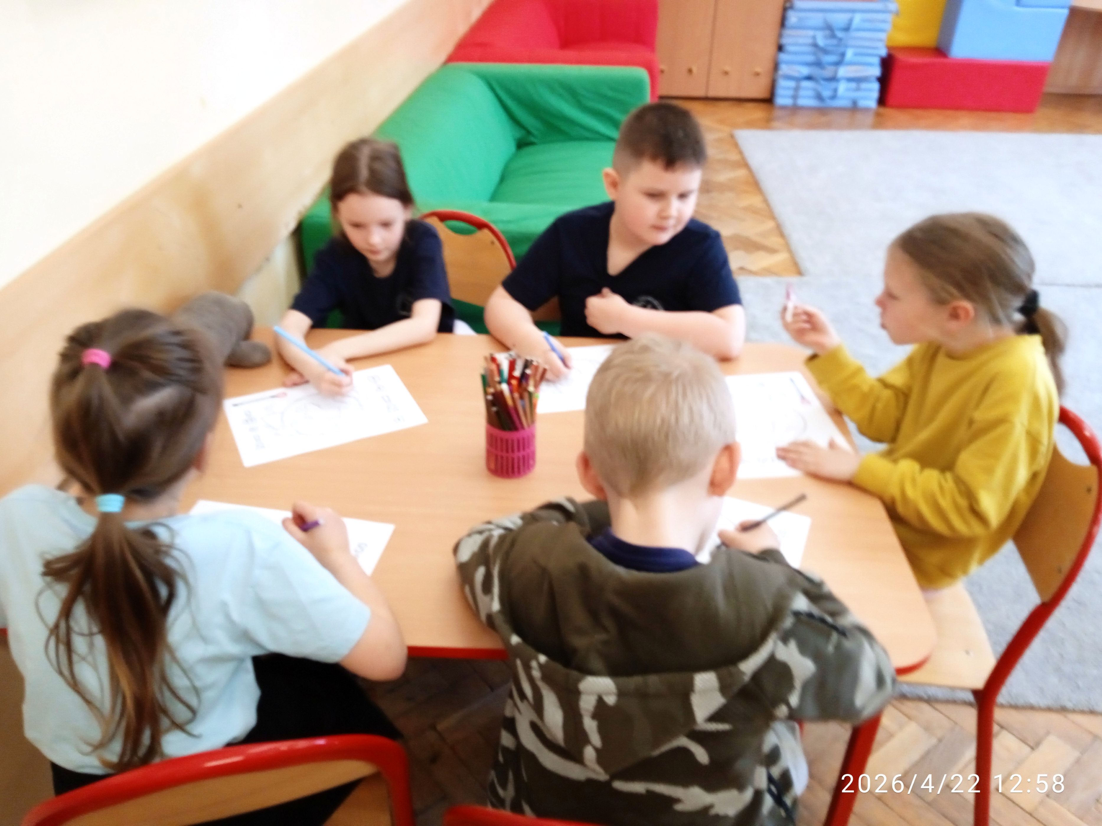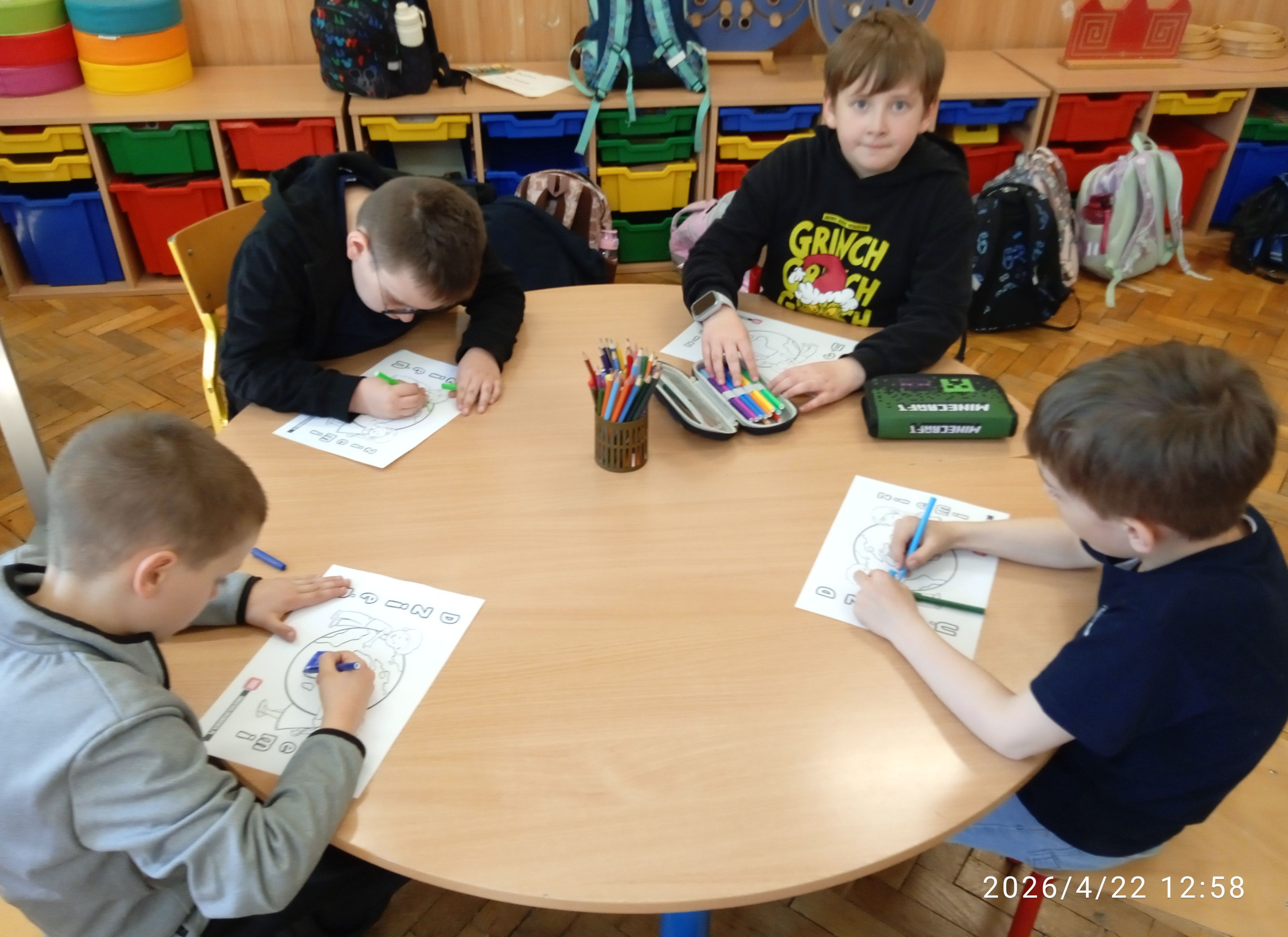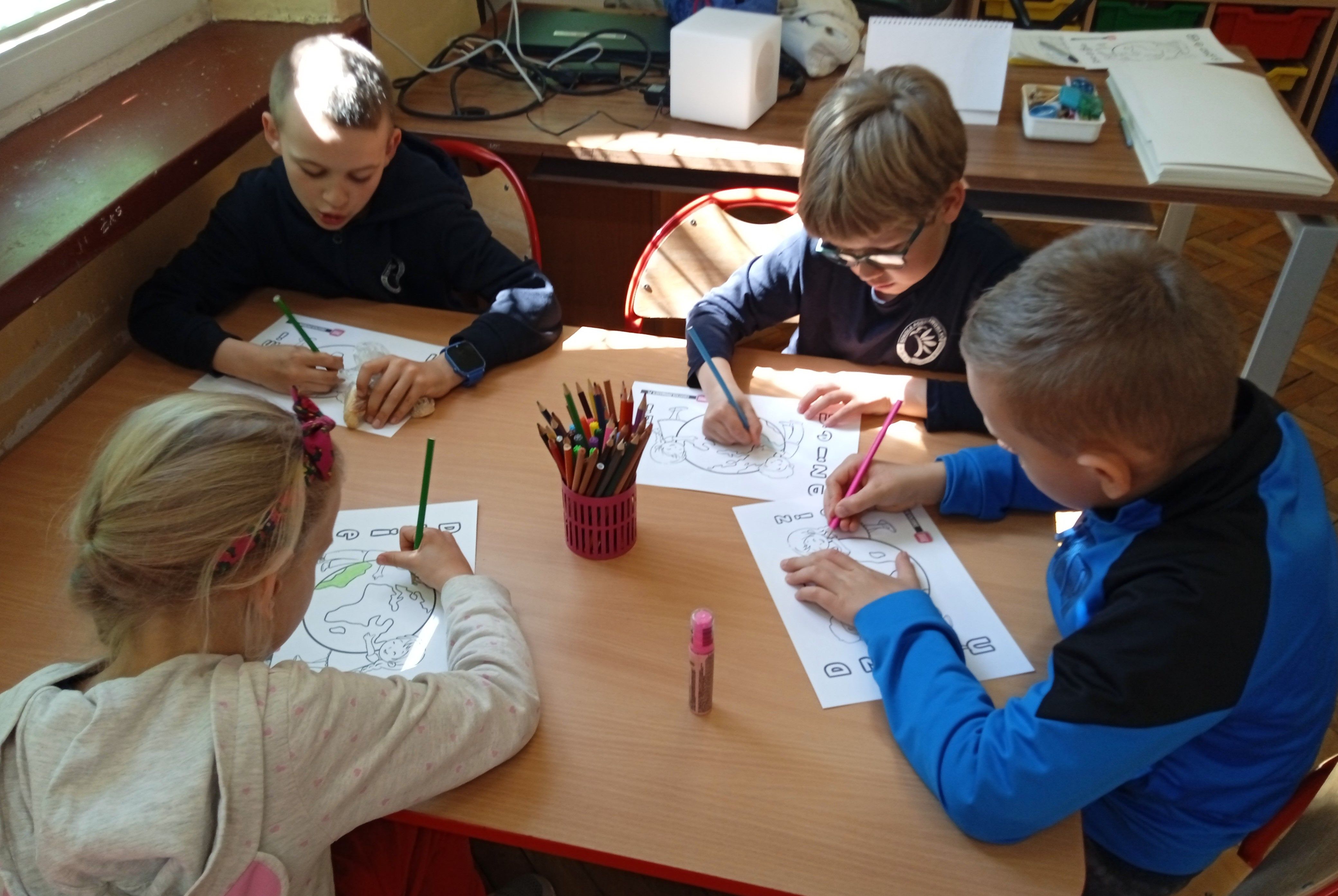 22.04.2026r. z okazji Międzynarodowego Dnia Ziemi klasa 1a zastanawiała się nad sposobami ochrony naszej planety i jej zasobów. Dzieci obejrzały edukacyjną bajkę z serii Karolek- "Dzień Ziemi". Stworzyły również piękne kolorowanki, które zdobią tablicę w naszej świetlicy.
