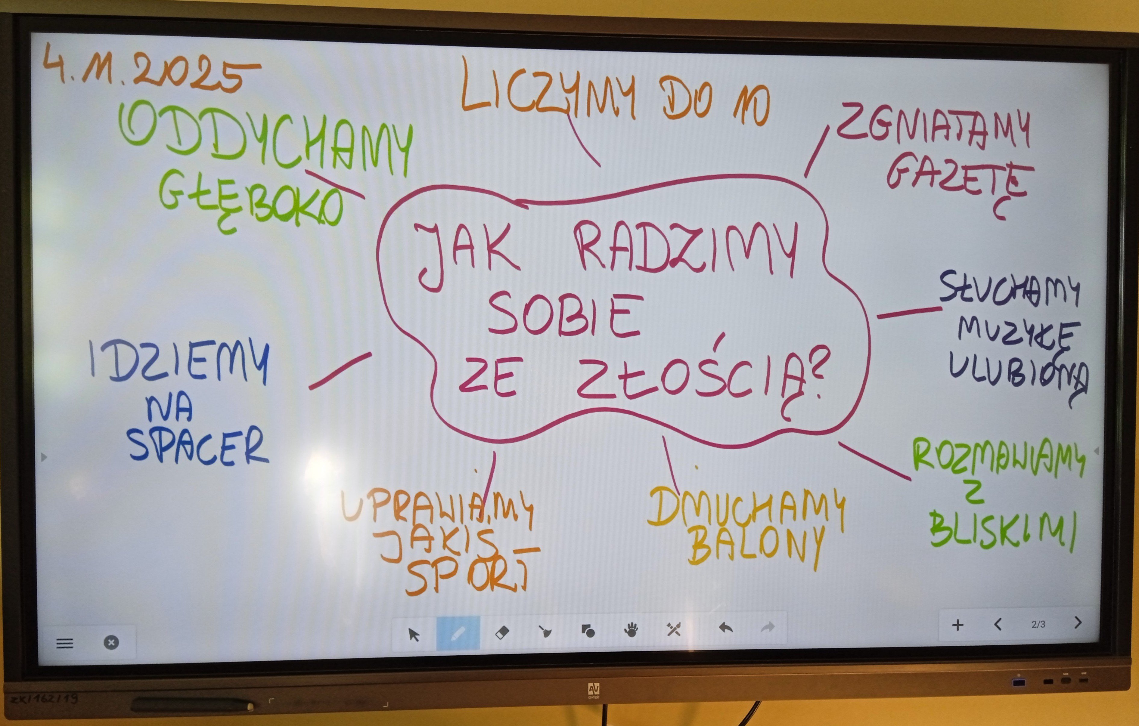 Jak radzić sobie ze złością? - zastanawiali się dziś chętni uczniowie z klas I. Zebrane pomysły zapisano na tablicy, a dzieci miały możliwość zastanowienia się co je złości i w jaki pozytywny, konstruktywny dla siebie i otoczenia sposób można sobie z tą emocją poradzić.