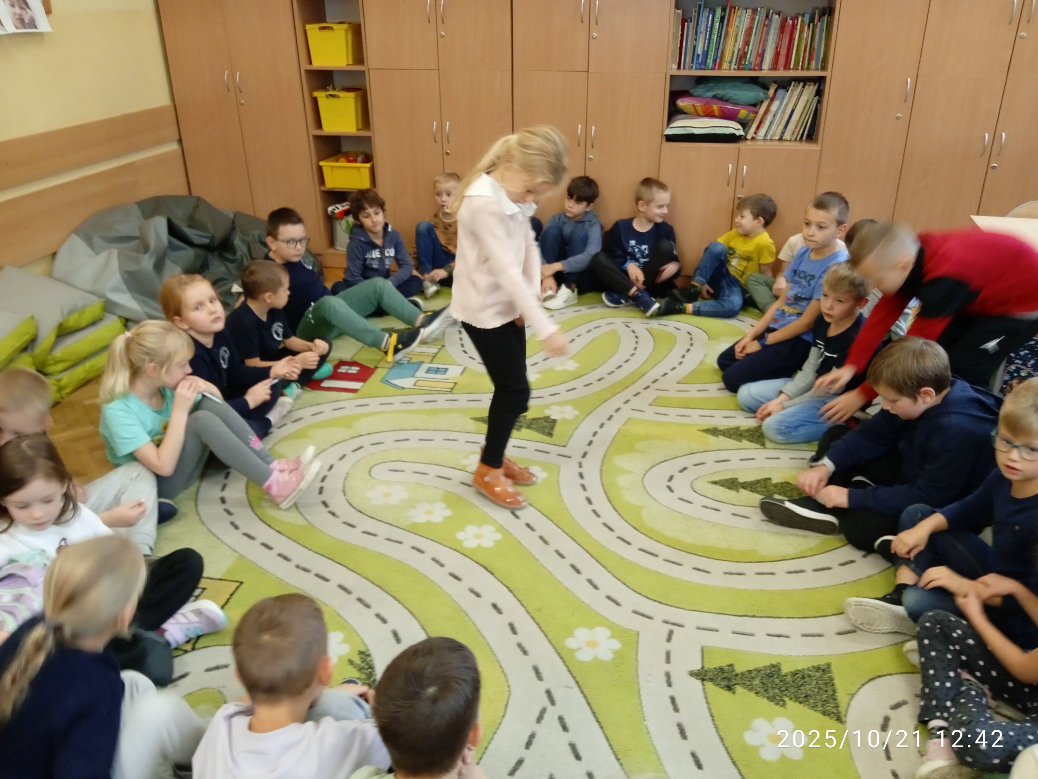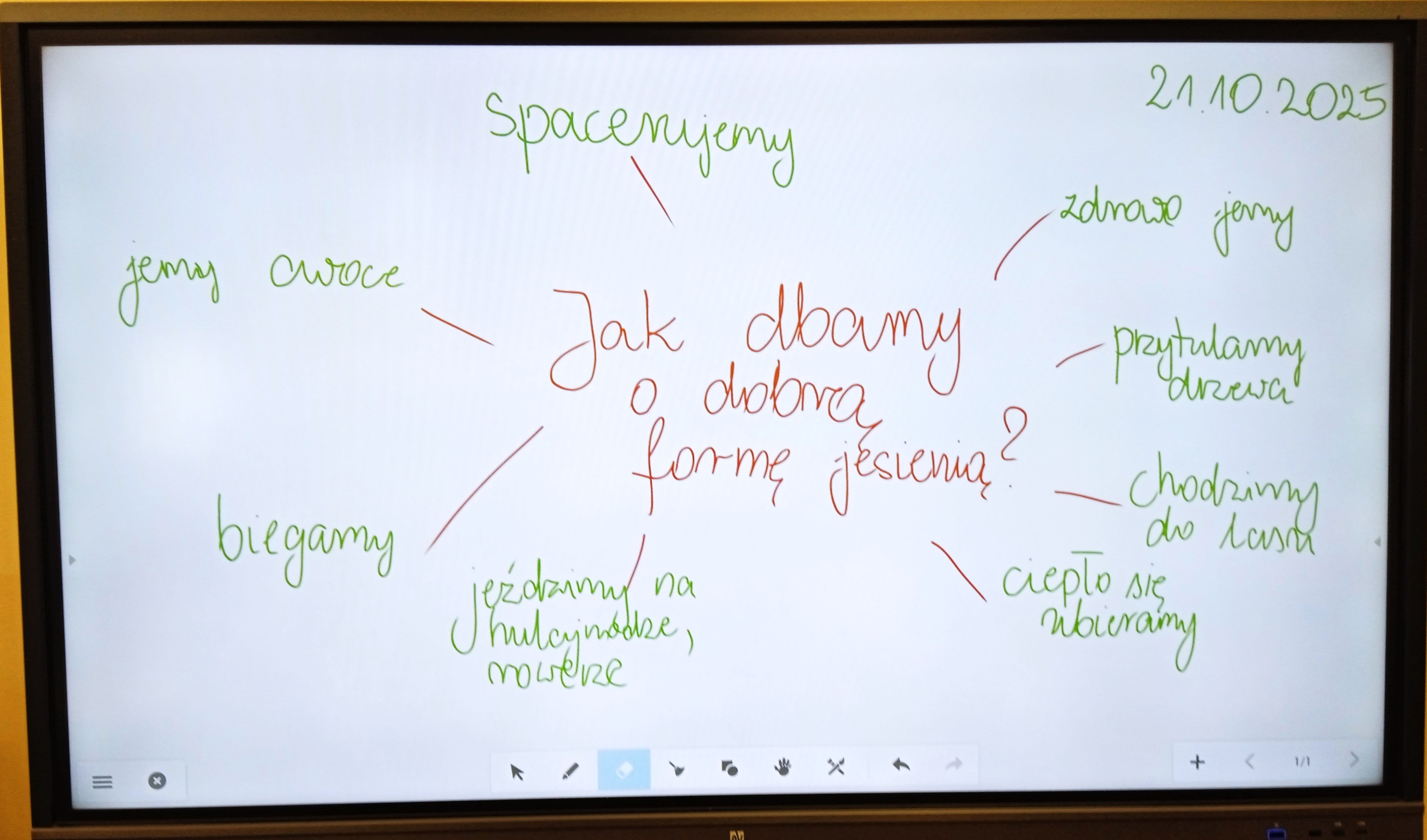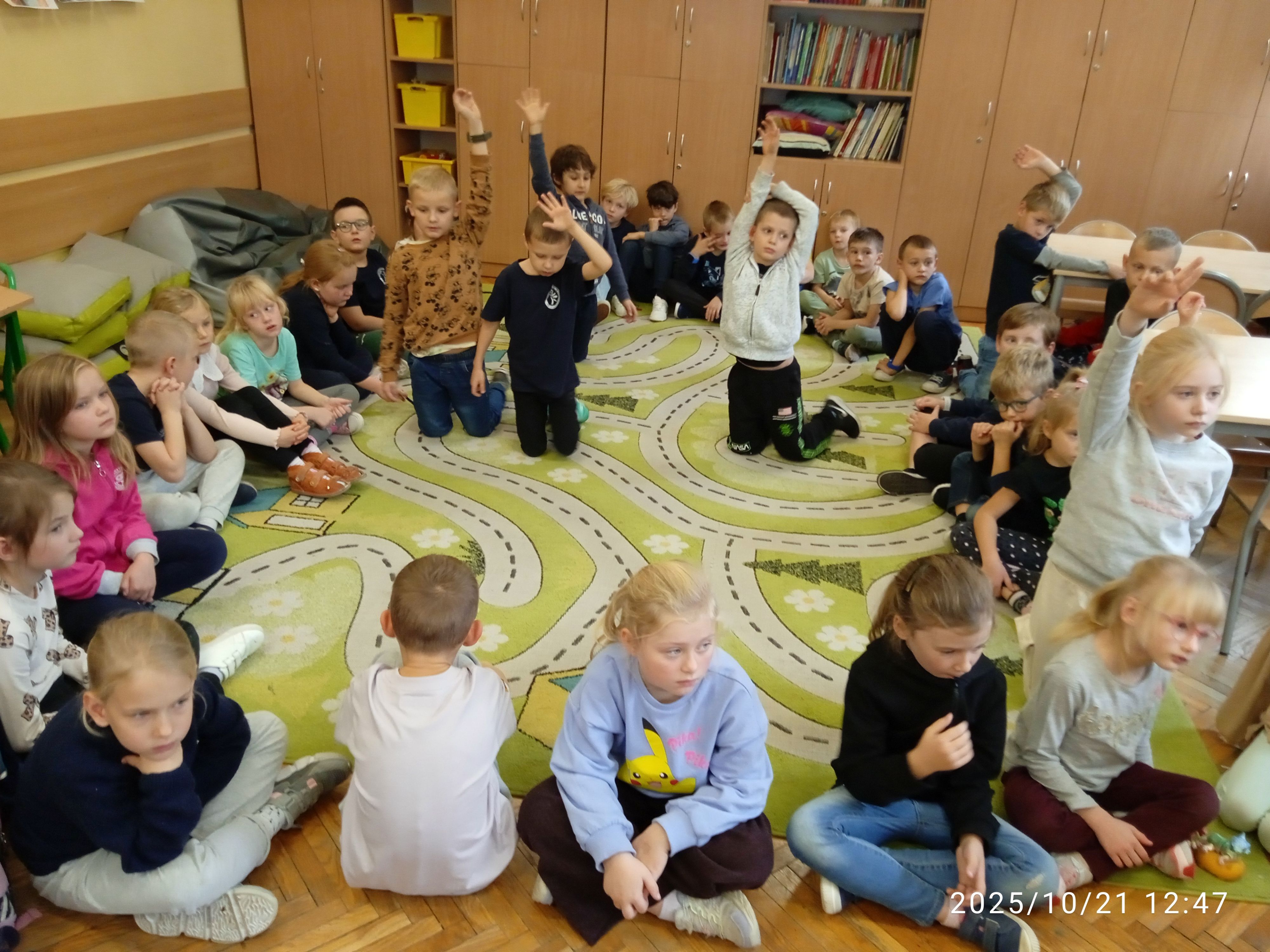 21.10.2025 chętne dzieci z klas pierwszych brały udział w zajęciach dotyczących sposobów dbania o dobrą formę jesienią. Podawały różne pomysły np. zdrowe odżywianie, spacery, ruch na świeżym powietrzu, ciepłe ubieranie się. Następnie udamy się na szkolny plac zabaw, aby zadbać o swoje zdrowie.