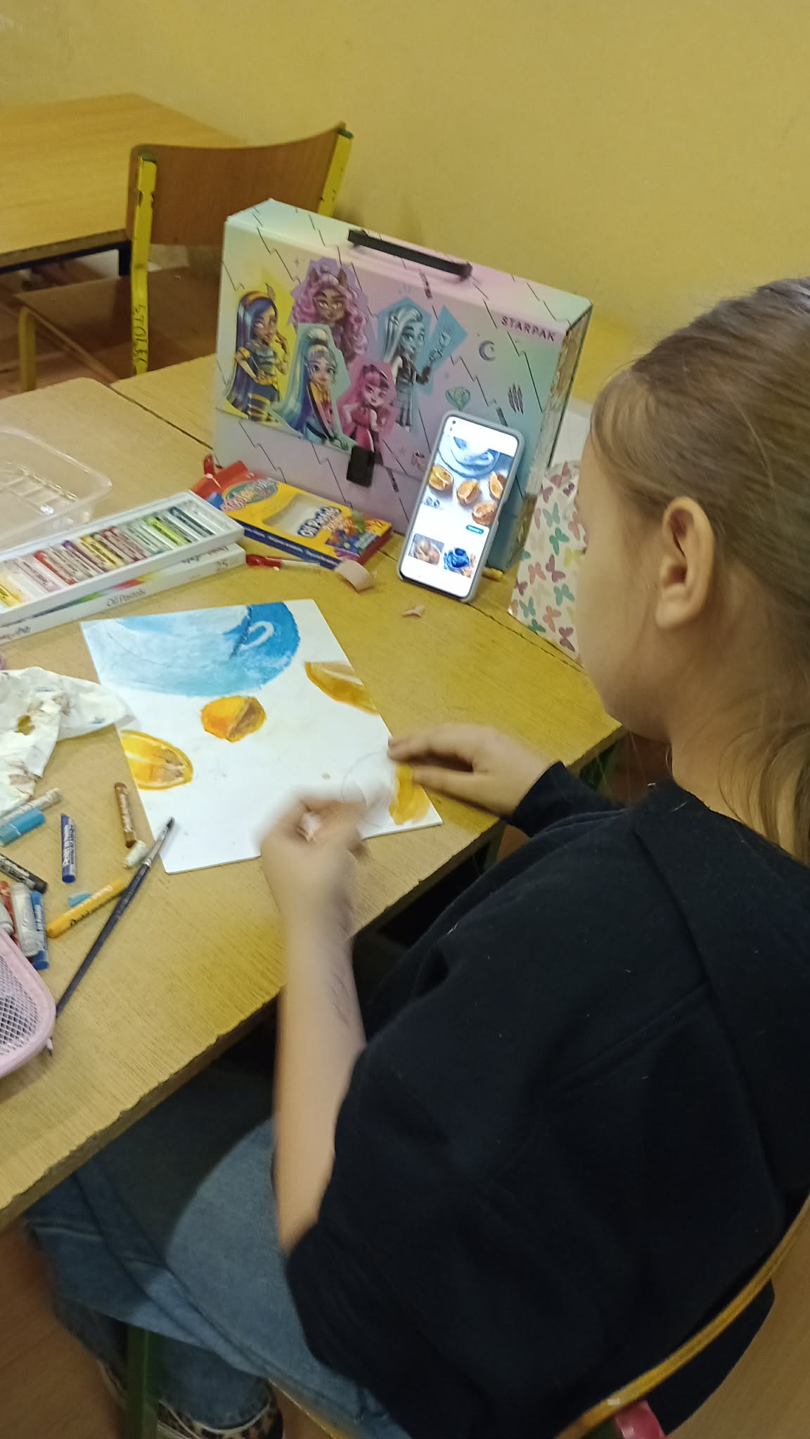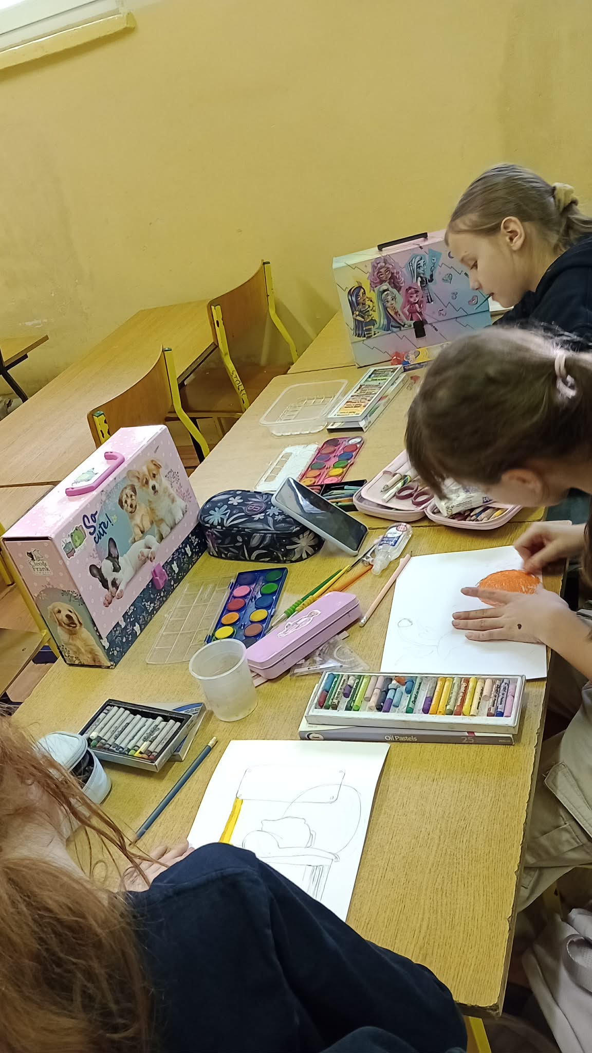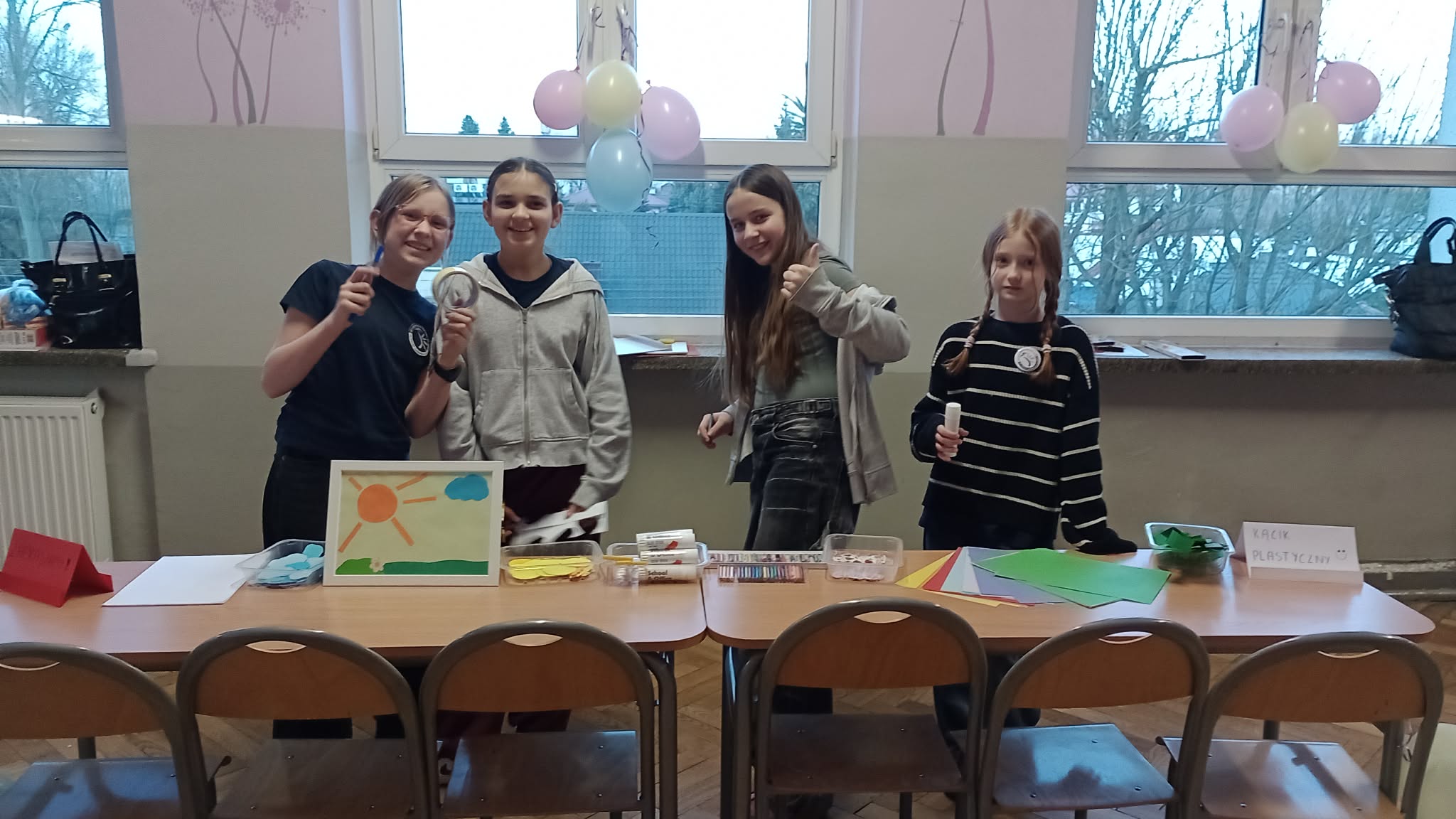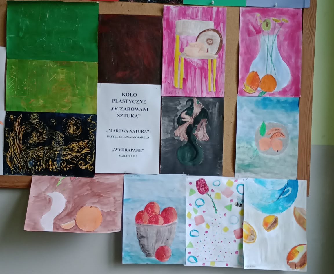 Koło plastyczne oczarowane sztuką tworzy cały czas: martwa natura w technice mieszanej czy sgraffito - to jest to. Prace powstałe na ostatnich zajęciach można podziwiać na tablicy na I piętrze. A uczestniczki zajęć plastycznych wsparły także kącik plastyczny podczas Dnia Otwartego i zarażały maluchy odwiedzające nasza szkołę miłością do działań twórczych.