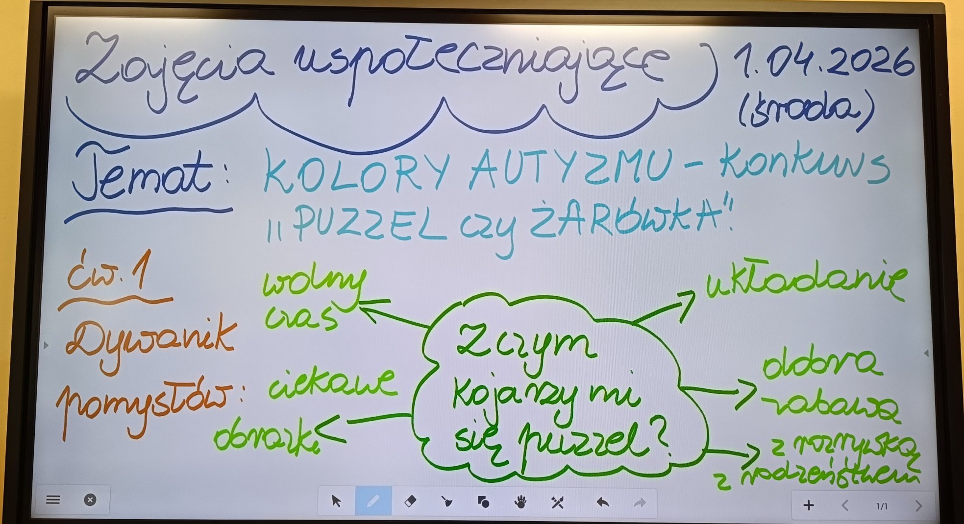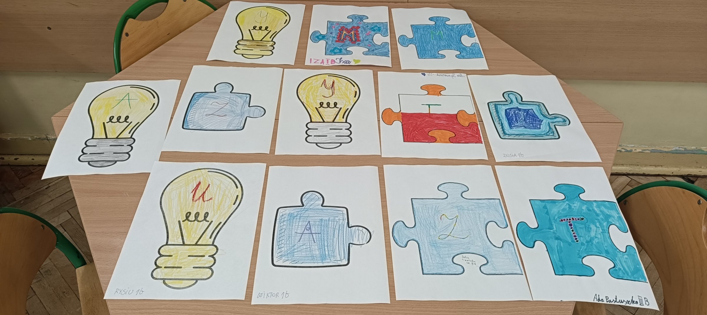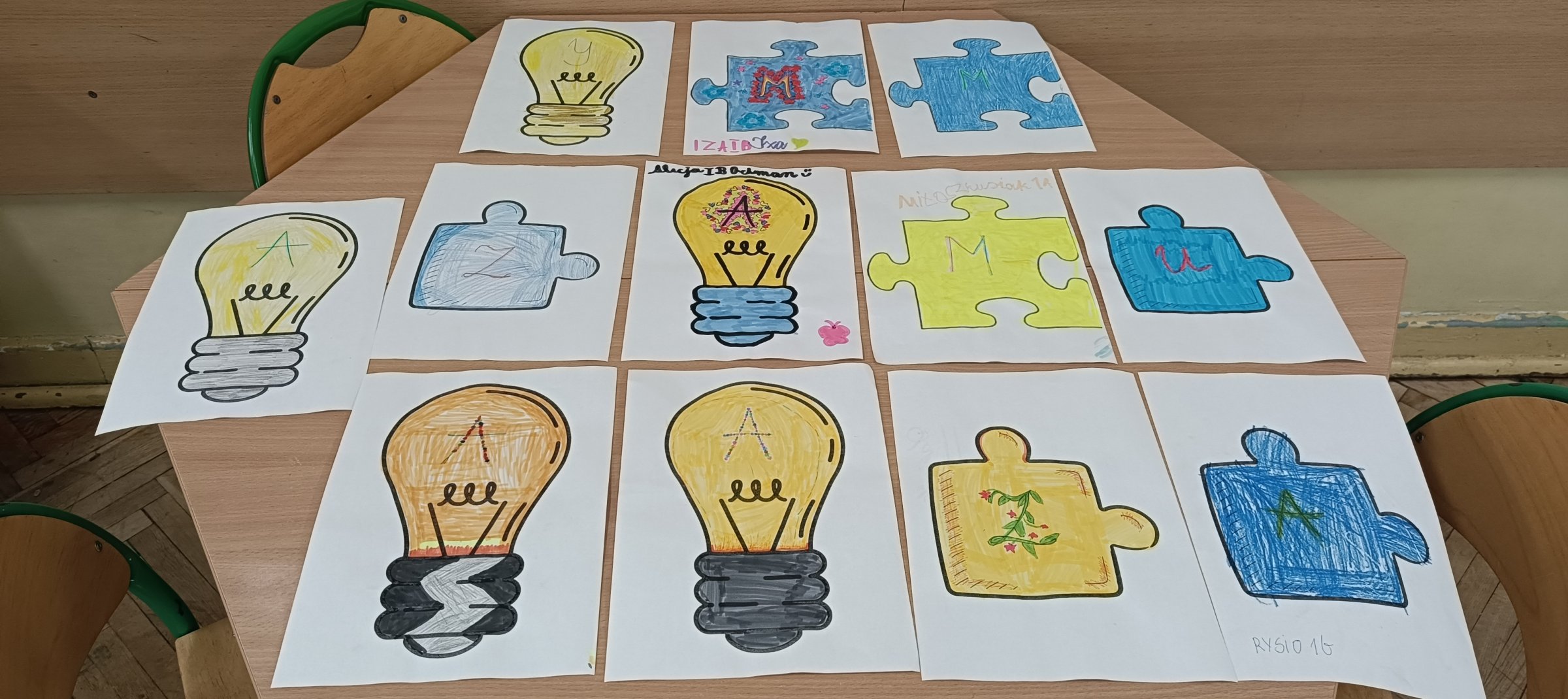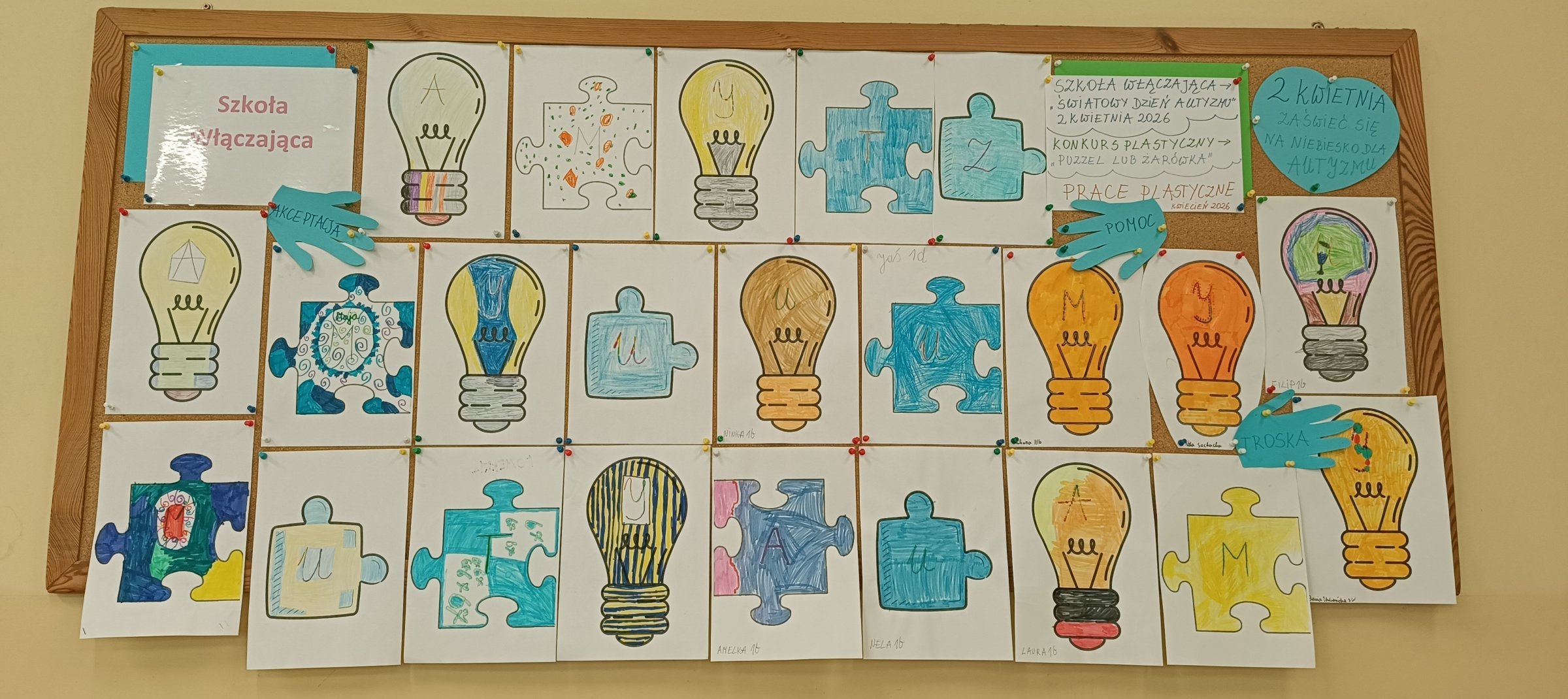 W dniu 31 marca 2026 roku w naszej szkolnej świetlicy odbyły się zajęcia uspołeczniające poświęcone tematyce osób z Zespołem Aspergera oraz Autyzmem z okazji Międzynarodowego Dnia Autyzmu w ramach działań szkoły włączającej. Uczniowie z klas 1 – 3 podczas zajęć psychoedukacyjnych zostali wprowadzeni w tematykę pojęcia „autyzm”, ”Zespół Aspergera”. Uczniowie z klas 1 – 3 podczas zajęć uczestniczyli w zabawie edukacyjnej polegającej na wcieleniu się w rolę osoby mającej kłopot ze zmysłami np. słuchu, wzroku, dotyku, smaku lub węchu. Uczniowie wcielając się w rolę osoby z autyzmem mieli za zadanie np.: odgadnąć za pomocą zmysłów między innymi dotyku i zapachu – rozpoznać i nazwać wylosowany przedmiot z magicznego pudełka, za pomocą węchu i smaku rozpoznać i nazwać wylosowane warzywo lub owoc w ramach zabawy w Masterchef. Dzieciom bardzo podobało się to ćwiczenie manualno – sensoryczne. Dzieci pokolorowały puzzel lub żarówkę w ramach udziału w konkursie plastyczny o tym właśnie tytule. Kolor niebieski jest symbolem autyzmu.