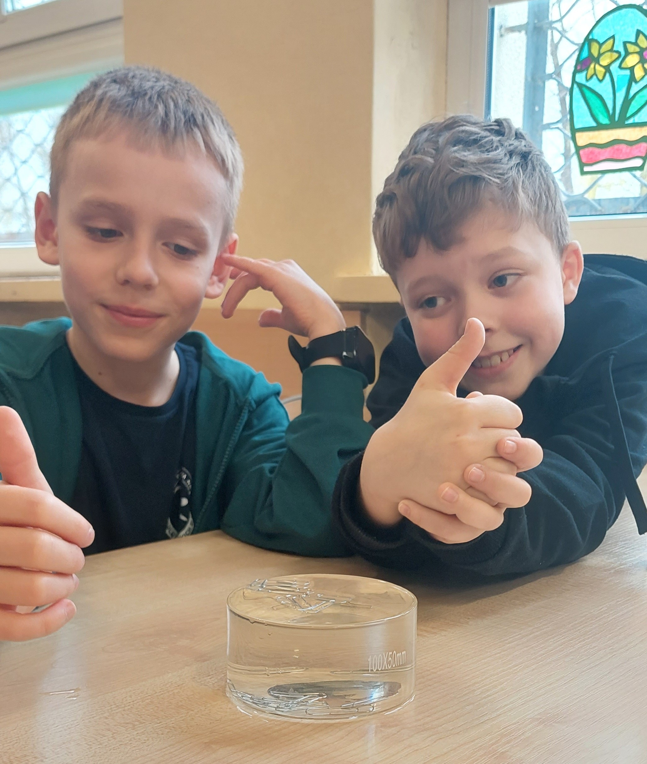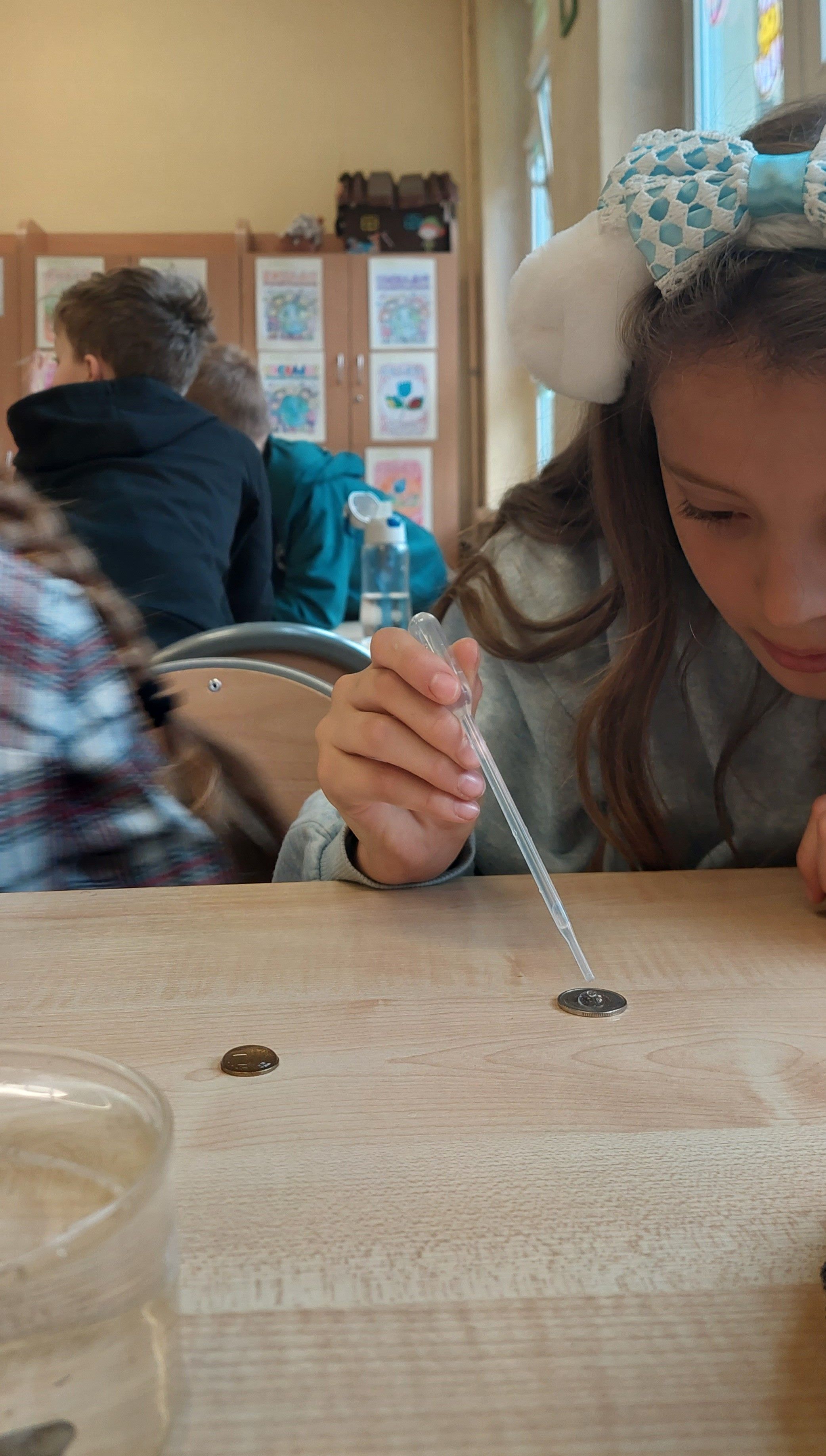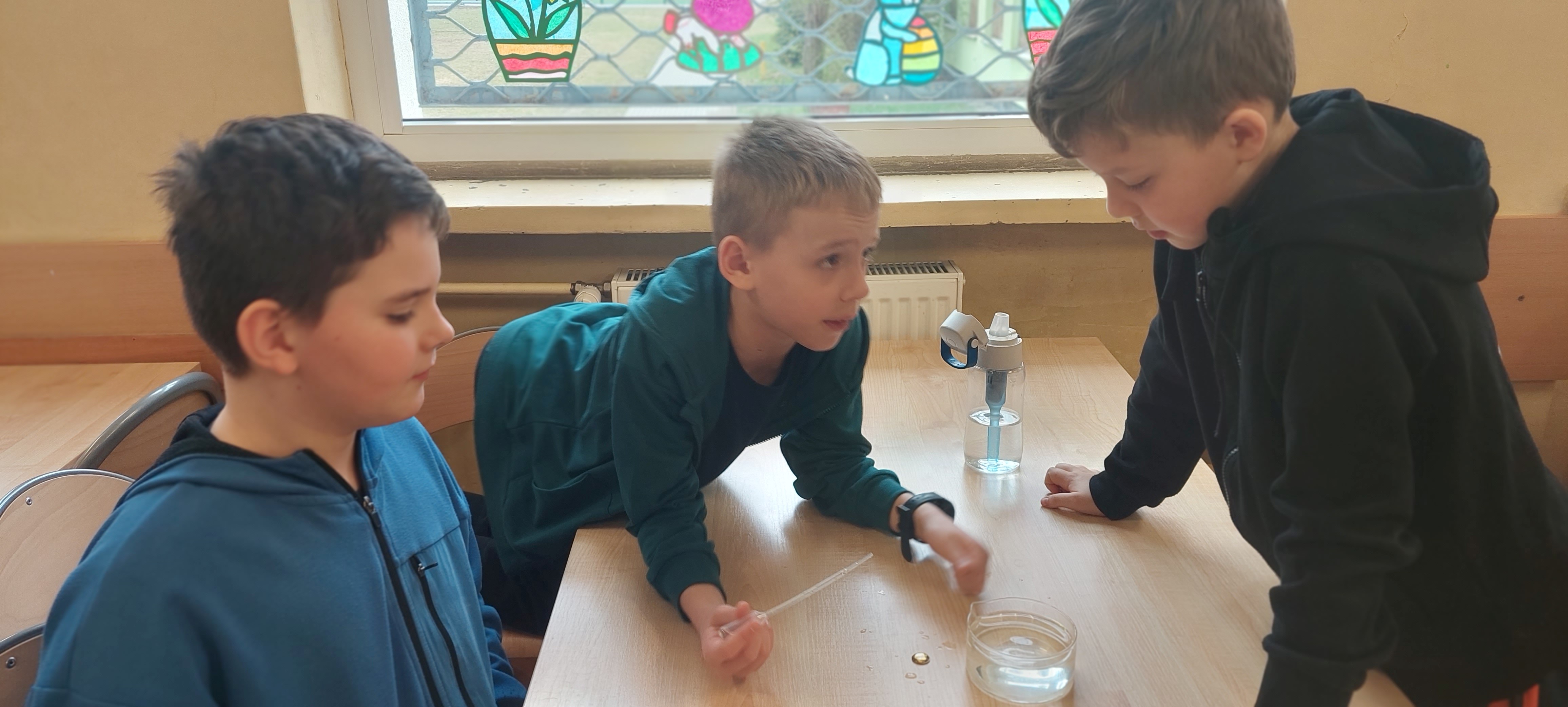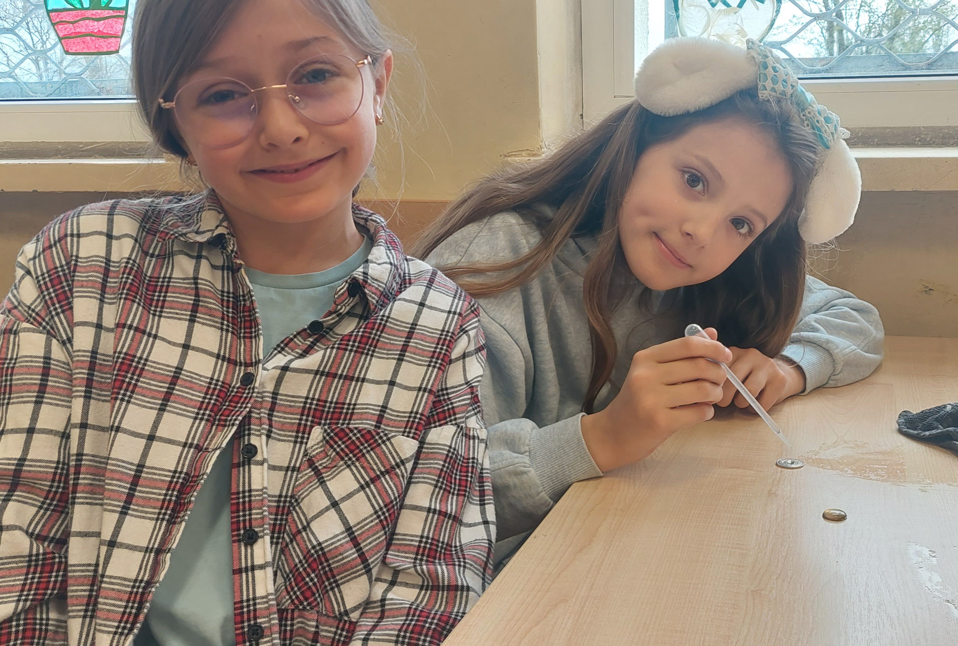 W kolejnym doświadczeniu uczniowie tworzyli „poduszki wodne” na powierzchni monet. Za pomocą pipety dodawali kolejne krople wody, a zajęcia urozmaiciliśmy elementem rywalizacji – sprawdzaliśmy, której drużynie uda się nałożyć ich najwięcej. Nad monetą tworzyła się wypukła „bańka” wodna, aż do momentu osiągnięcia punktu krytycznego, w którym kolejna kropla powodowała rozlanie wody. Doświadczenie to pozwoliło wprowadzić pojęcie menisku wypukłego.