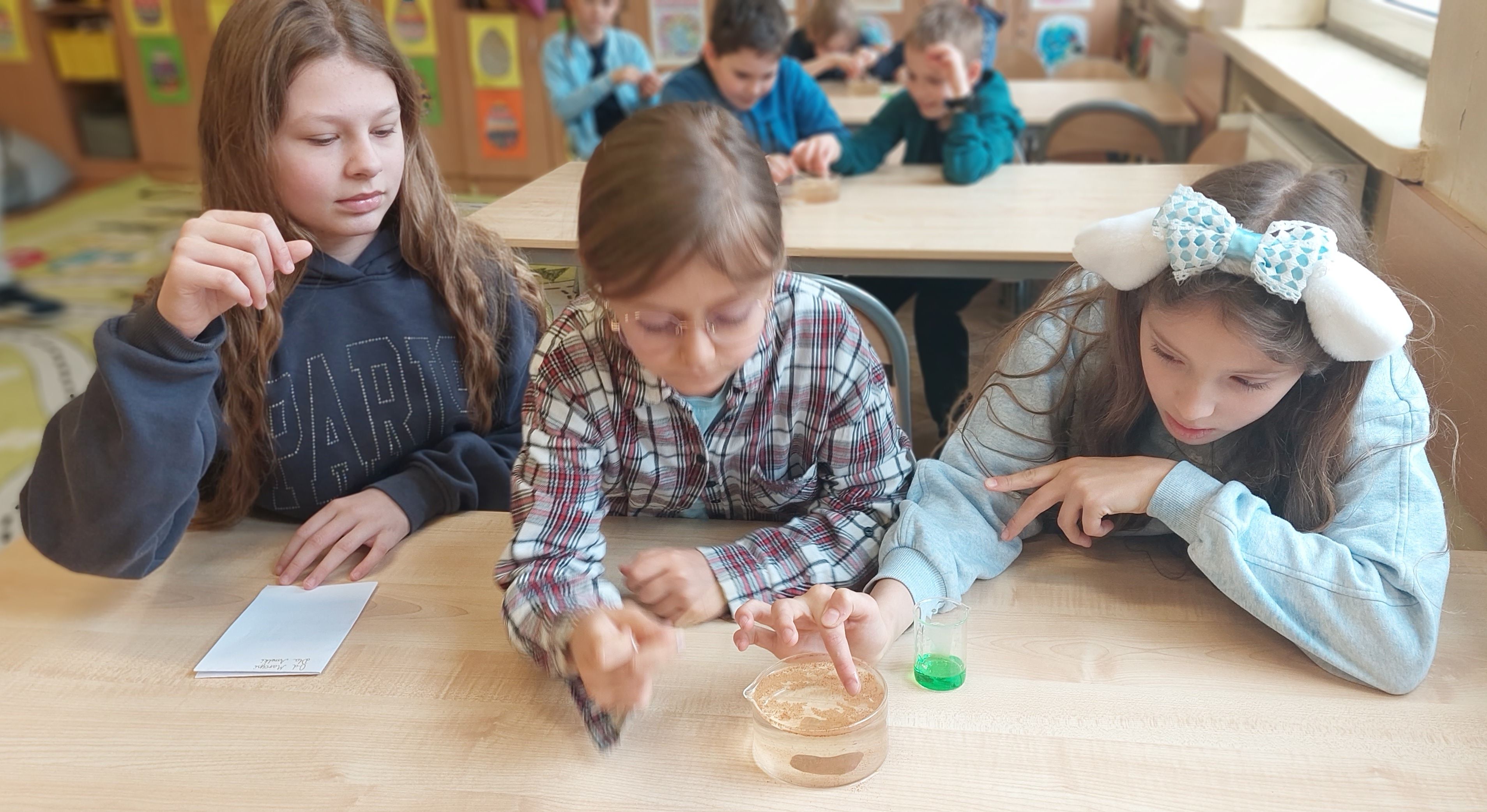 W ostatnim zadaniu uczniowie obserwowali zachowanie drobin cynamonu utrzymujących się na powierzchni wody. Po zanurzeniu palca wcześniej zwilżonego płynem do mycia naczyń zauważyli, że cynamon gwałtownie się odsuwa. Detergent zmniejsza napięcie powierzchniowe wody, osłabiając przyciąganie między cząsteczkami, co powoduje widoczny efekt „uciekania” drobin.