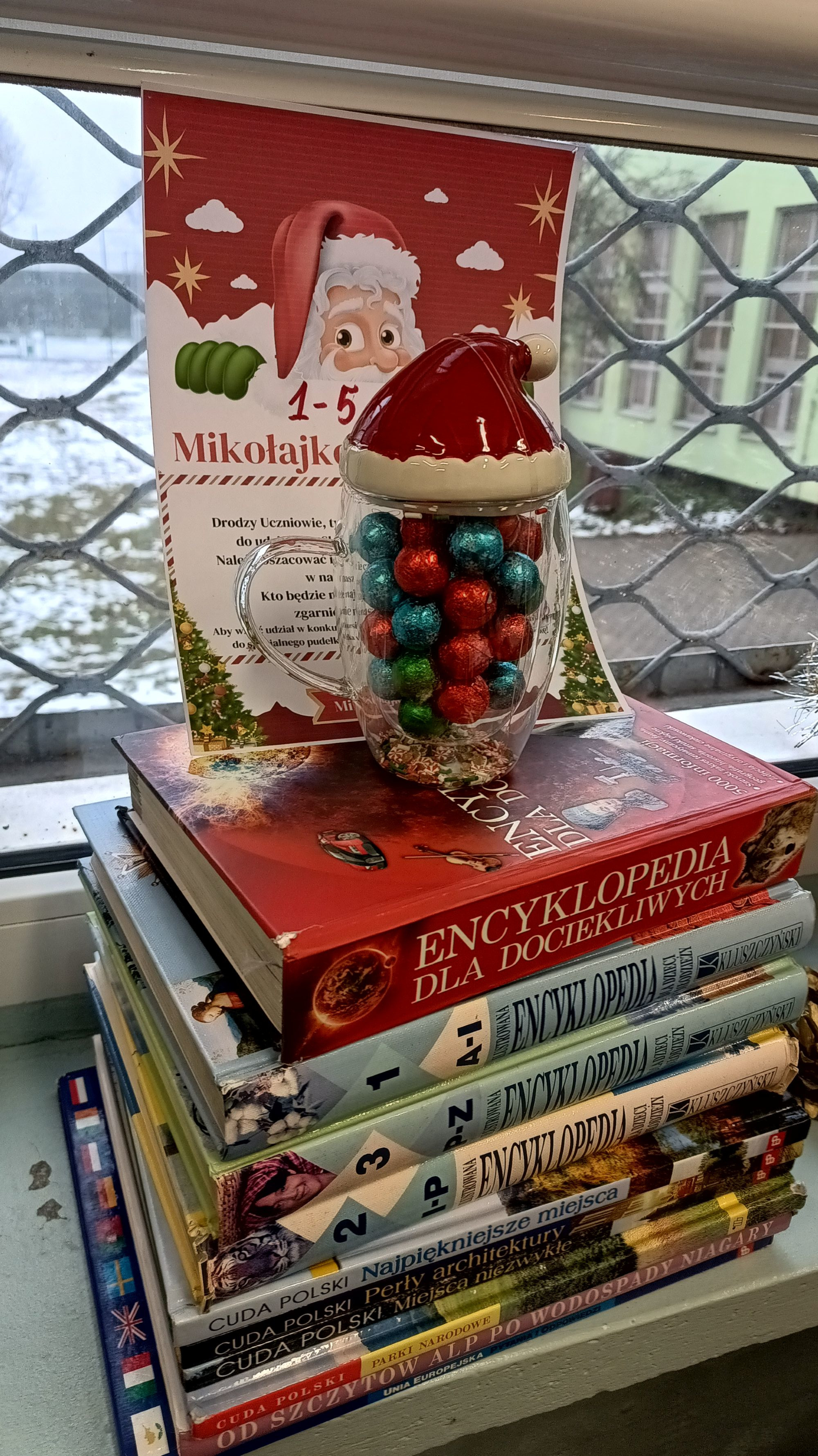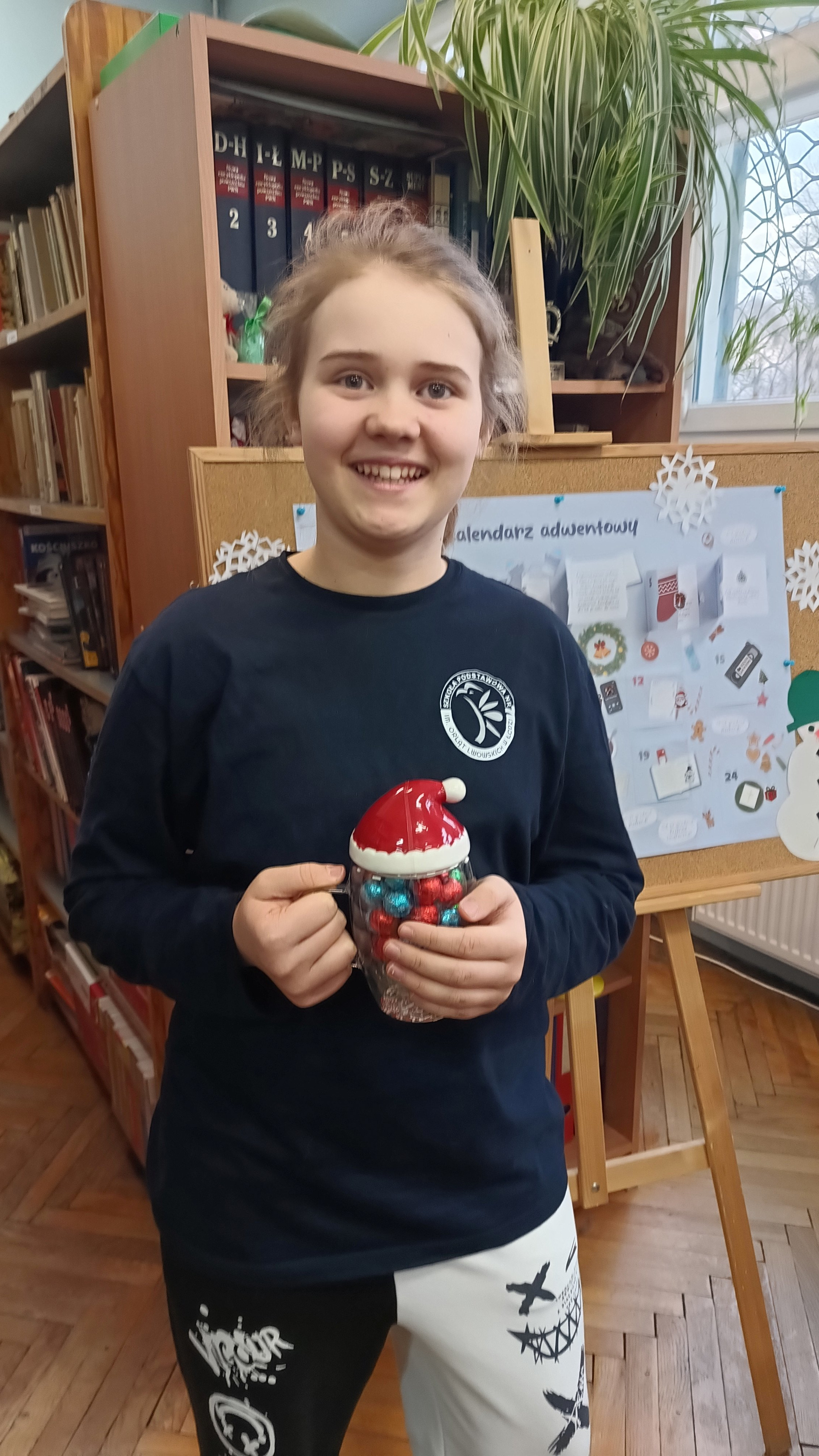W dniach 1 – 5 grudnia w naszej szkolnej bibliotece odbył się słodki mikołajkowy konkurs. Zadaniem uczniów było odgadnąć, ile cukierków-bombeczek znajduje się w świątecznym kubku. W sumie oddano 147 odpowiedzi, a w kubku znajdowały się 44 cukierki. Tylko jedna osoba trafiła dokładną liczbę – Zuzia Wawoczny z klasy V d, która tym samym zdobyła słodki kubek.