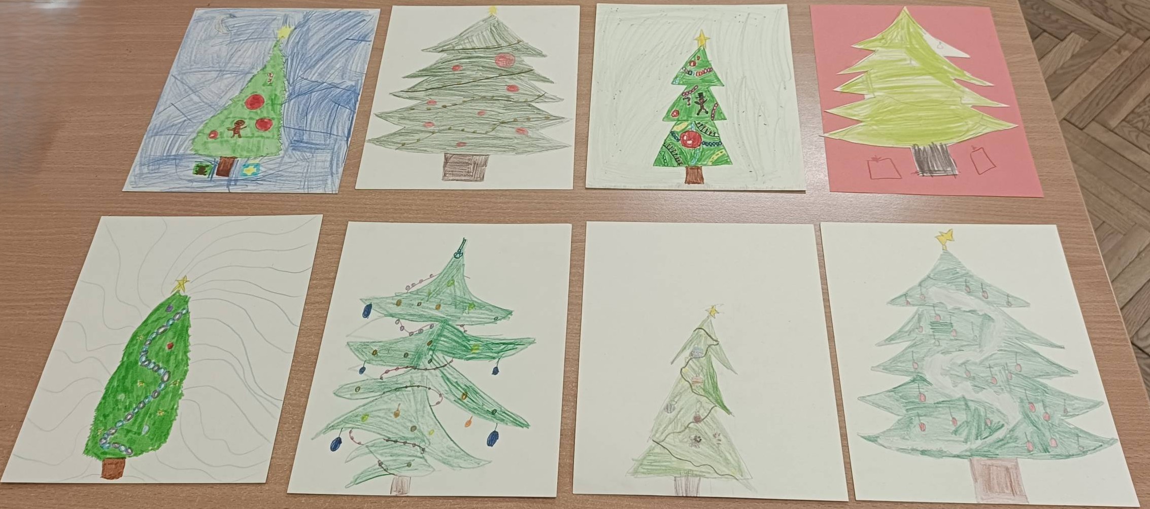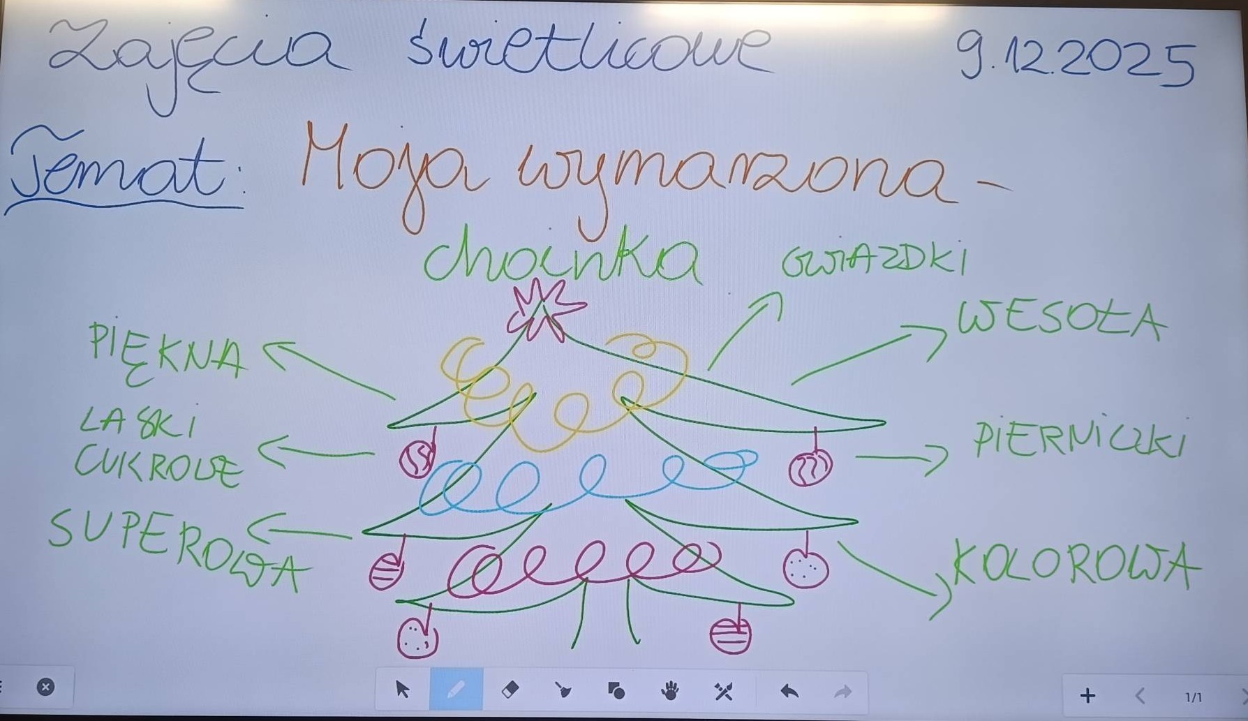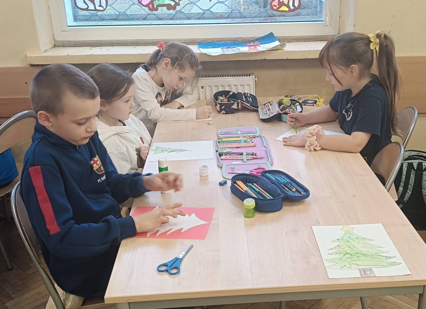 W dniu 9 grudnia 2025 roku (wtorek) w naszej szkole odbyły się zajęcia świetlicowe z okazji zbliżających się Świąt Bożego Narodzenia pt. „Moja wymarzona choinka”. Dzieci wykonywały ciekawe ćwiczenia na kreatywność i pomysłowość. Wykonując te ćwiczenia praktyczne dzieci słuchały wybranych utworów muzyki relaksacyjnej, która miała pobudzić ich wyobraźnie oraz kreatywność. Dzieci tworzyły mapę myśli do słowa – „choinka” podając własne skojarzenia. Uczniowie brali udział w zabawie pt. „Kto tak jak ja lubi choinkę …, to” wykonując gest lub ruch. Uczniom bardzo podobały się te ćwiczenia kreatywne. Zajęcia nie tylko miały uwrażliwić uczniów na tematykę ważności relacji w życiu człowieka, pobudzić ich kreatywność w działaniu praktycznym, ale przede wszystkim miały zwrócić ich uwagę na współpracę w grupie rówieśniczej. Uczniowie na zakończenie zabaw na pomysłowość wykonali pracę plastyczną ulubiona choinka ozdobiona w …..? To działanie bardzo je zaciekawiło.