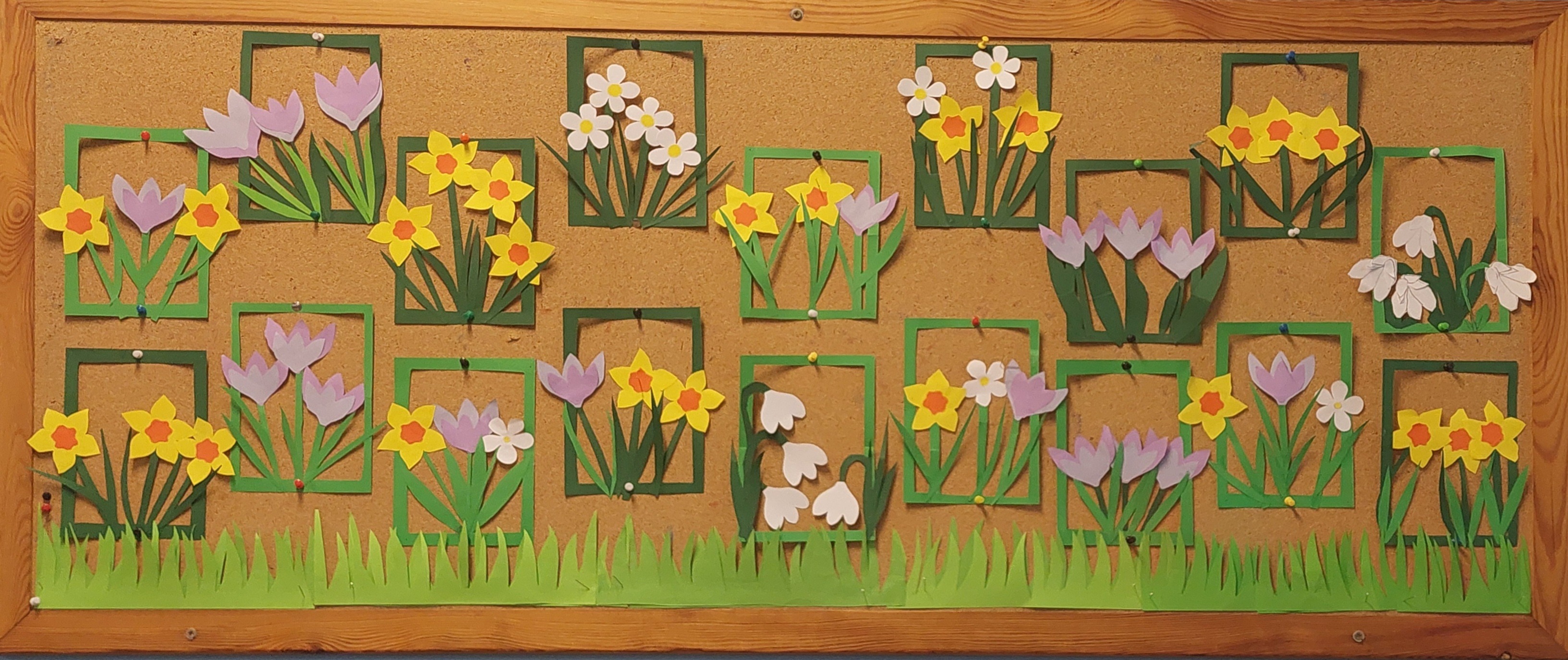 Następnie uczniowie przystąpili do pracy plastycznej. Wiele chętnych dzieci wykonało piękne kwiaty w ramkach. Wśród prac pojawiły się przebiśniegi, krokusy, żonkile oraz sasanki. Dzięki zaangażowaniu uczniów na naszej tablicy zawitała prawdziwa wiosna.
