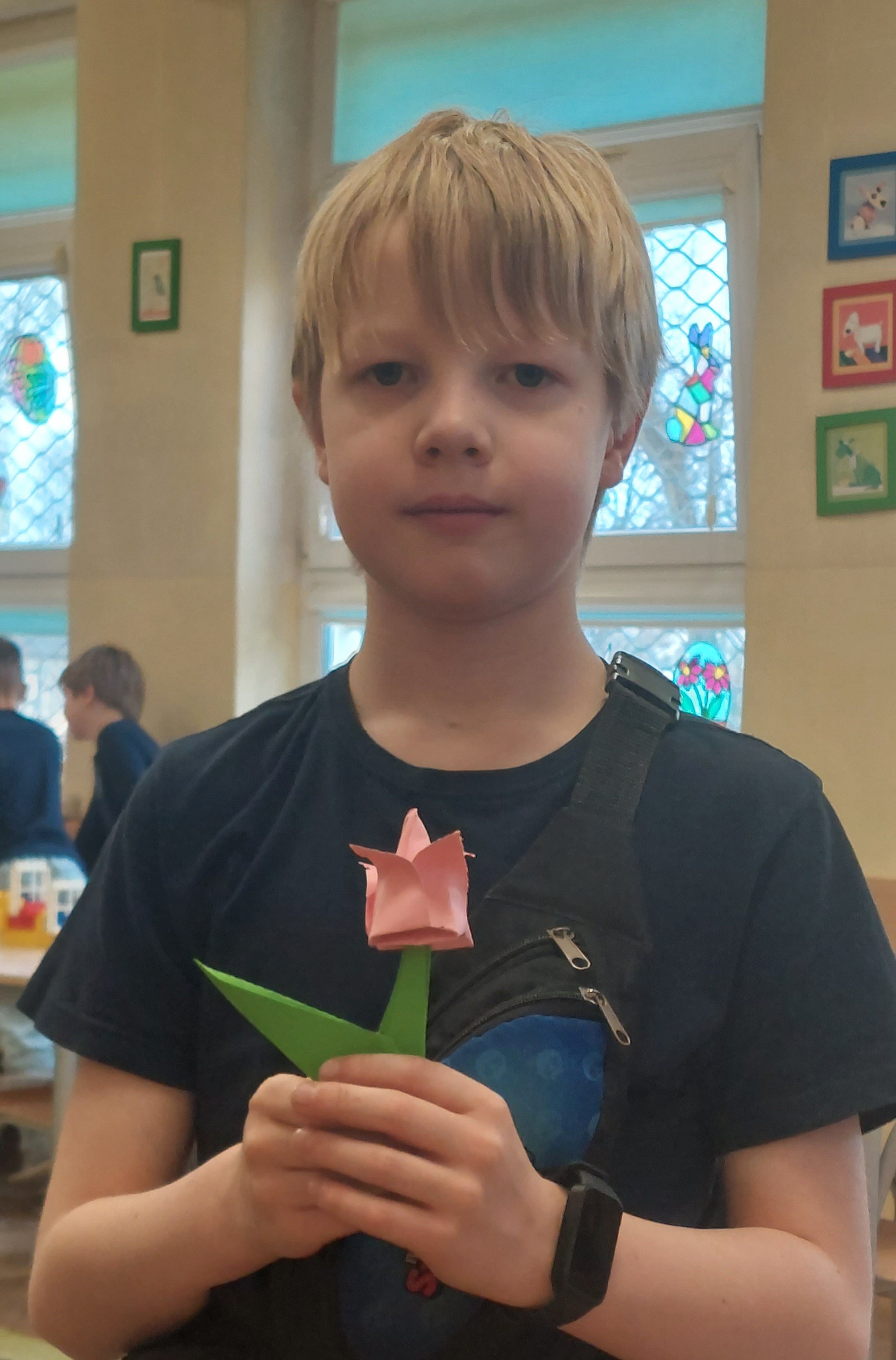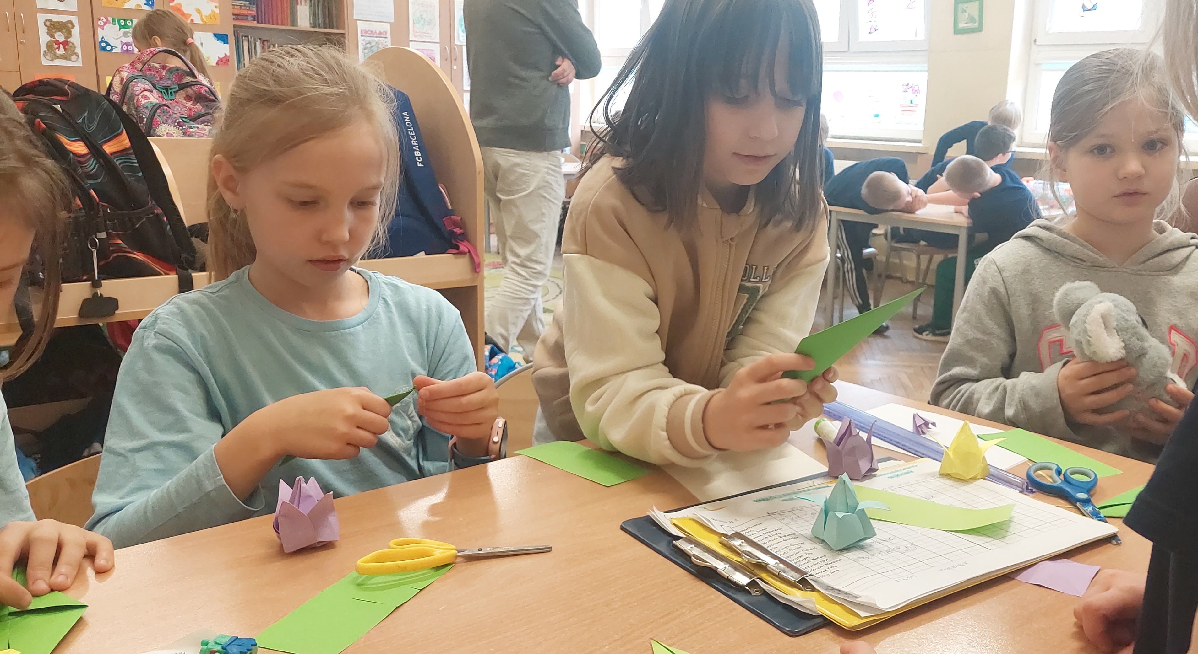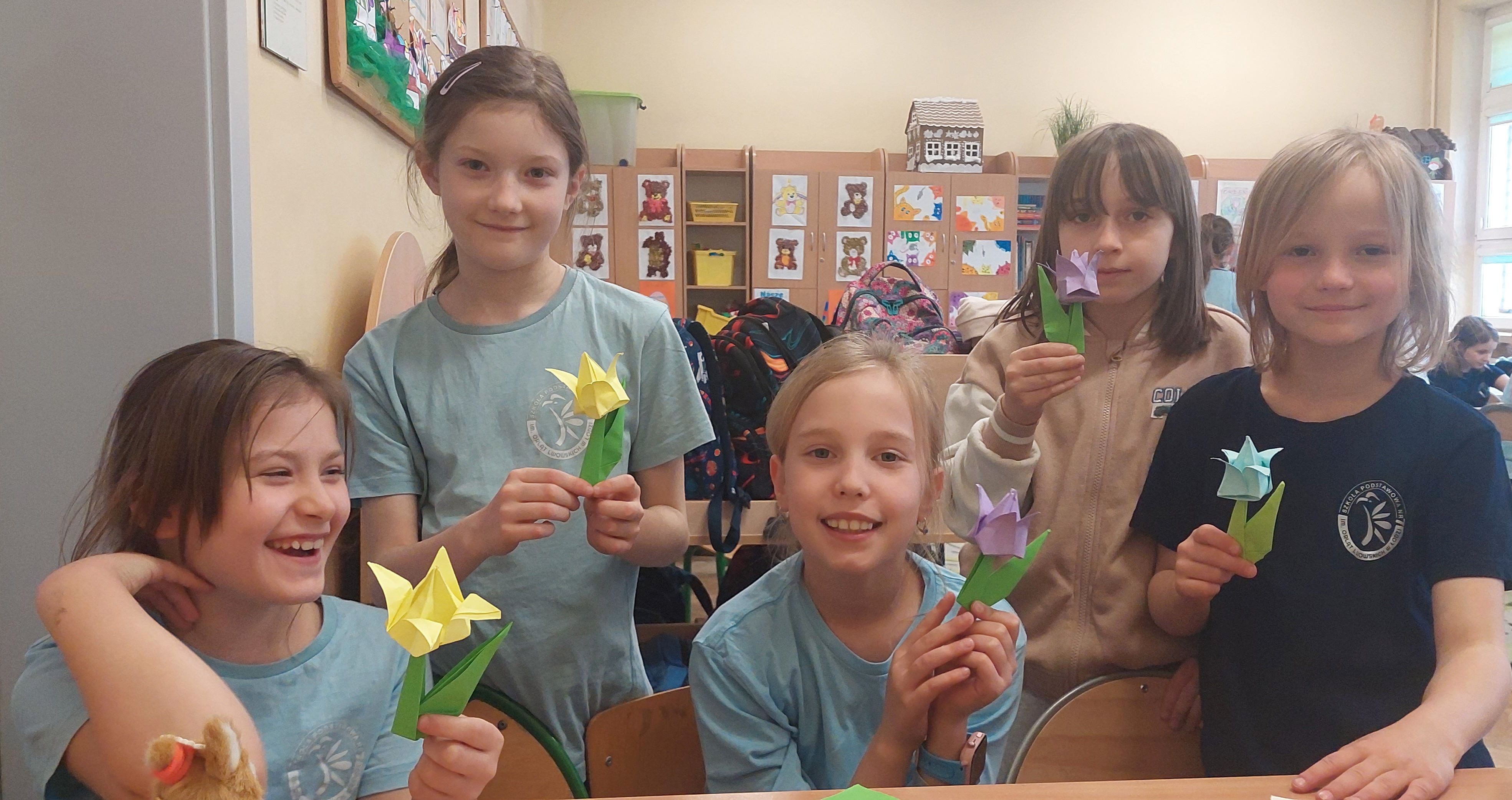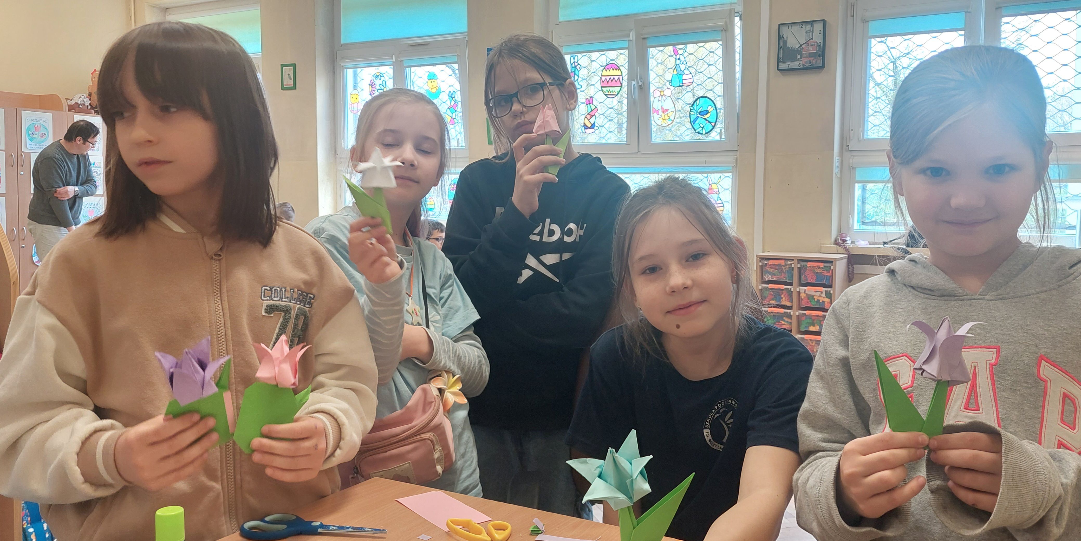 Na ostatnich zajęciach po raz kolejny wprowadziłam chętne dzieci w świat origami. Uczniowie mieli za zadanie złożyć tulipany. Wykonanie papierowych kwiatów wymagało od uczestników przede wszystkim cierpliwości, dokładności oraz umiejętności skupienia uwagi na kolejnych etapach składania papieru. Uczniowie wykonywali po dwa kwiaty, próbując drugi wykonać z pamięci. Zadanie nie było proste, ale powstałe prace wynagradzały włożony trud i wysiłek.