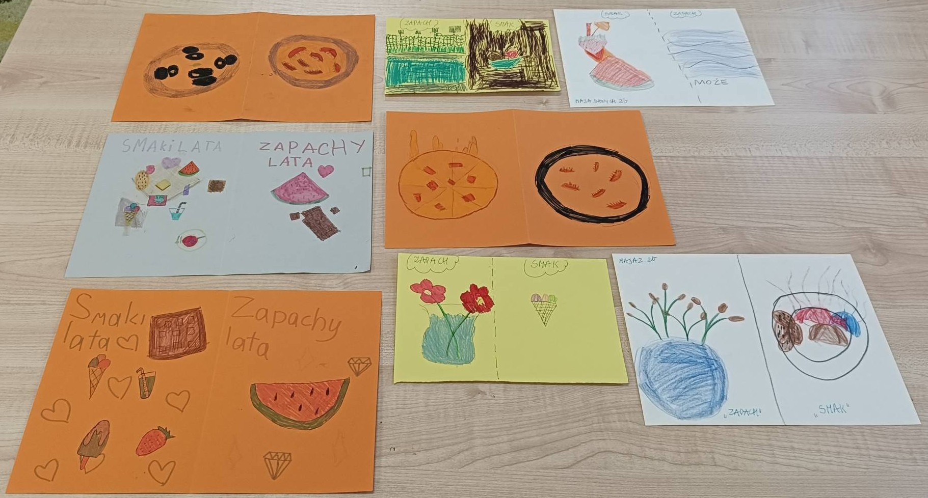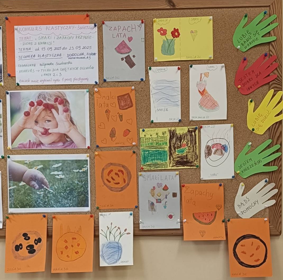 W miesiącu wrześniu 2025 nasza świetlica zorganizowała konkurs plastyczny pt. „Smaki i zapachy przywiezione z wakacji” dla uczniów z klas 2 – 3. Zostały wykonane kolorowe i ciekawe prac konkursowe. Każdy z uczestników wykonał jedną pracę plastyczną w formacie A5, techniką dowolną. Uczniowie mieli narysować jaki zapach lub smak przywieźli sobie z wakacji, co wspominają z wakacyjnych podróży najbardziej. Wszystkie dzieci wykazały się dużą pomysłowością i kreatywnością tworząc swoje małe dzieła plastyczne. Uczniowie wykorzystali swoją wyobraźnię do stworzenia pięknych, ciekawych i bardzo kolorowych prac plastycznych.