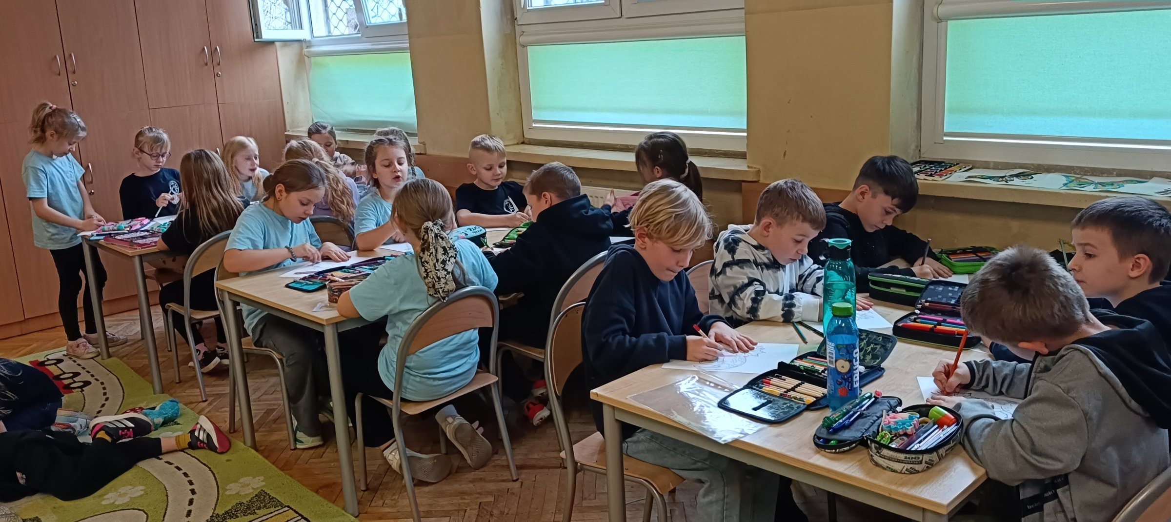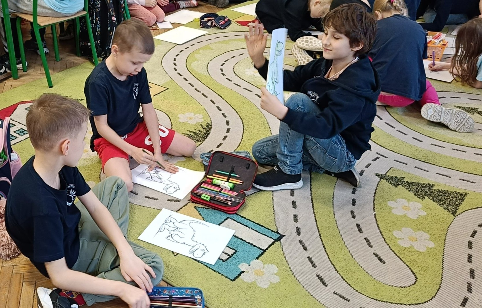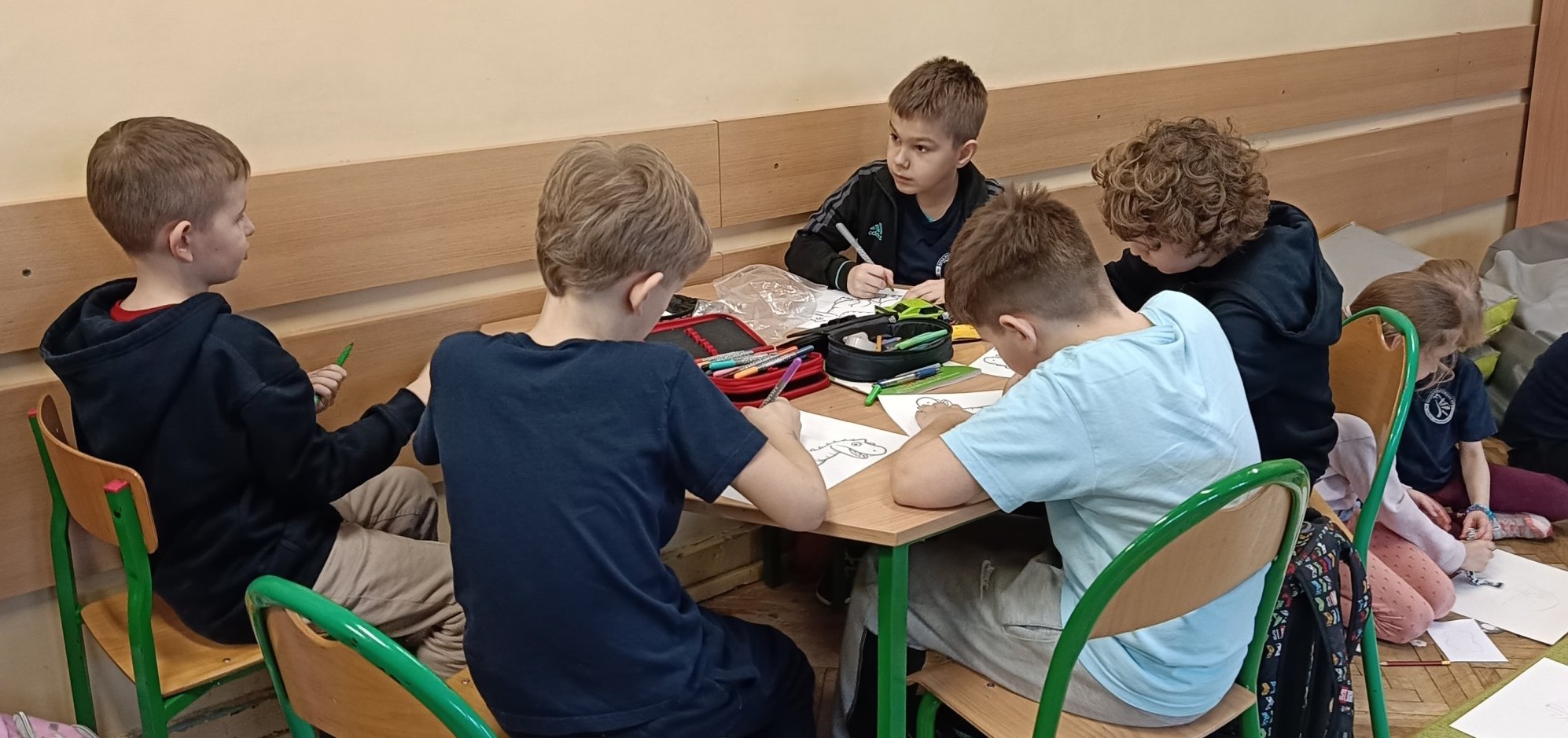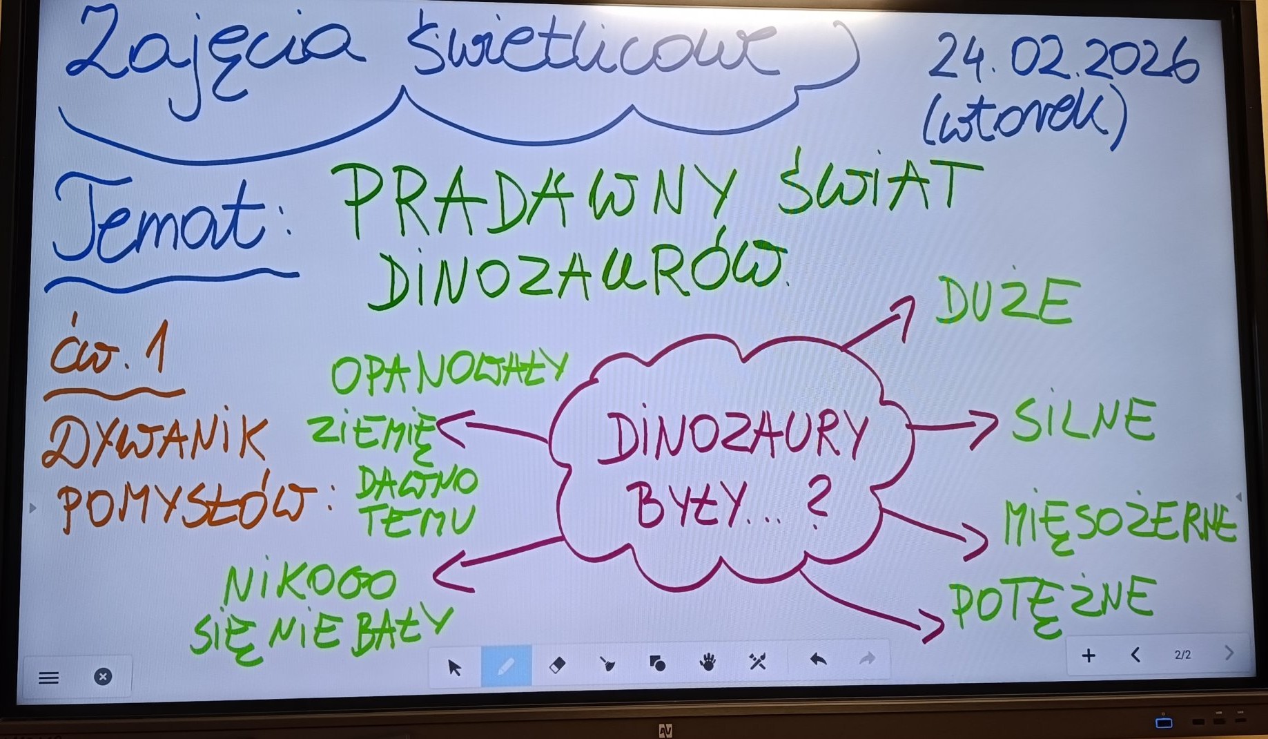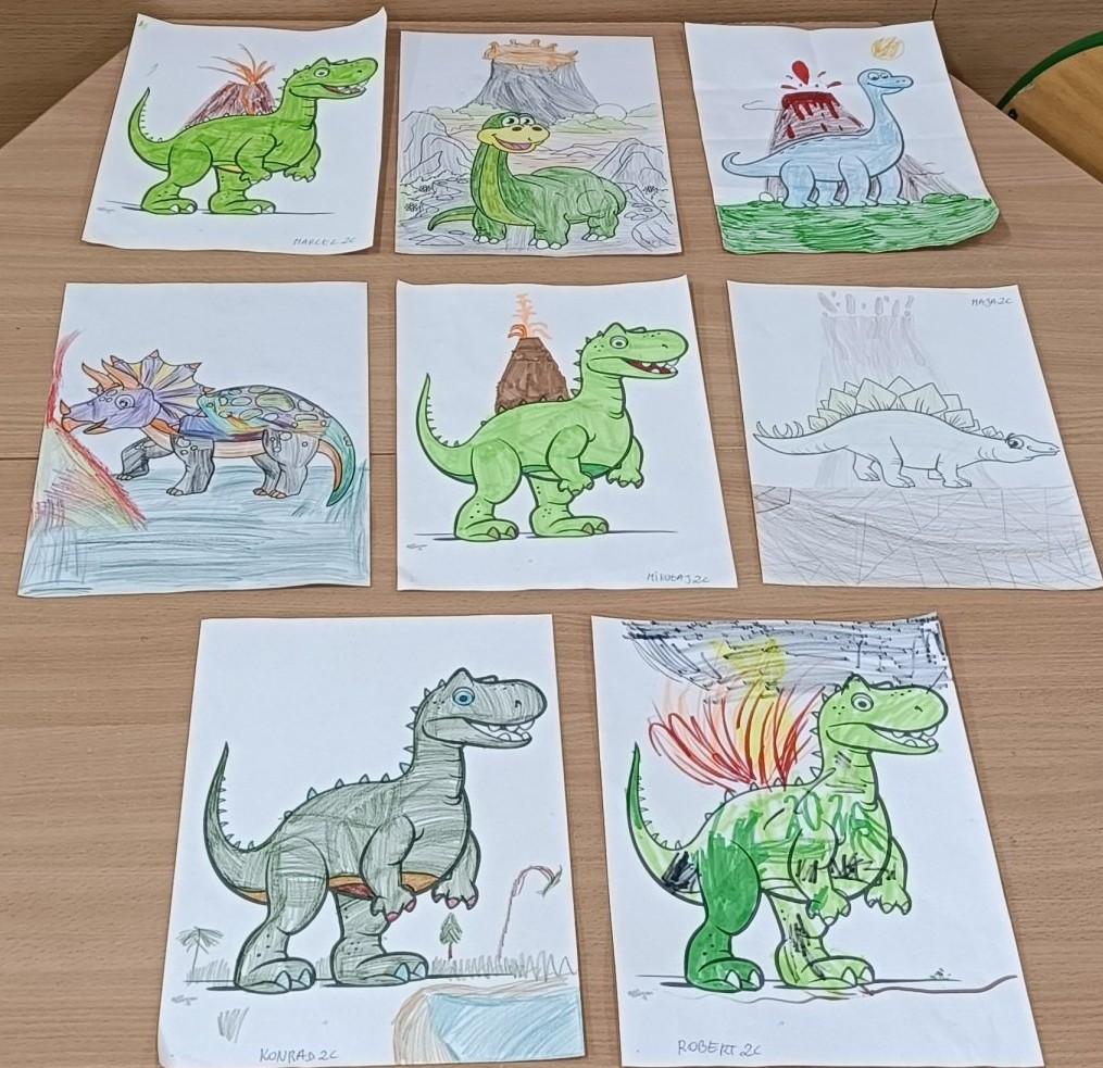 W dniu 24 lutego 2026 roku (wtorek) odbyły się zajęcia świetlicowe pt. „Pradawny świat Dinozaurów” dla uczniów z klas 1b i 2c odnoszące się do obchodów Światowego Dnia Dinozaurów, który obchodzimy 26 lutego. Uczniowie zostali wprowadzeni w tematykę historii pochodzenia dinozaurów, poznali zawód „paleontologa”. Utrwalali nazwy różnych dinozaurów, które żyły na Ziemi 65 milionów lat temu oraz uczyli się je rozpoznawać na obrazkach. Wykonując pracę plastyczne dzieci słuchały wybranych utworów muzyki relaksacyjnej, która miała pobudzić ich wyobraźnie oraz kreatywność, wyciszyć emocje. Uczniom bardzo podobały się te ćwiczenia kreatywne. Uczniowie mieli za zadanie plastyczne pokolorować szablon wylosowanego dinozaura (kredki, pastele, mazaki).