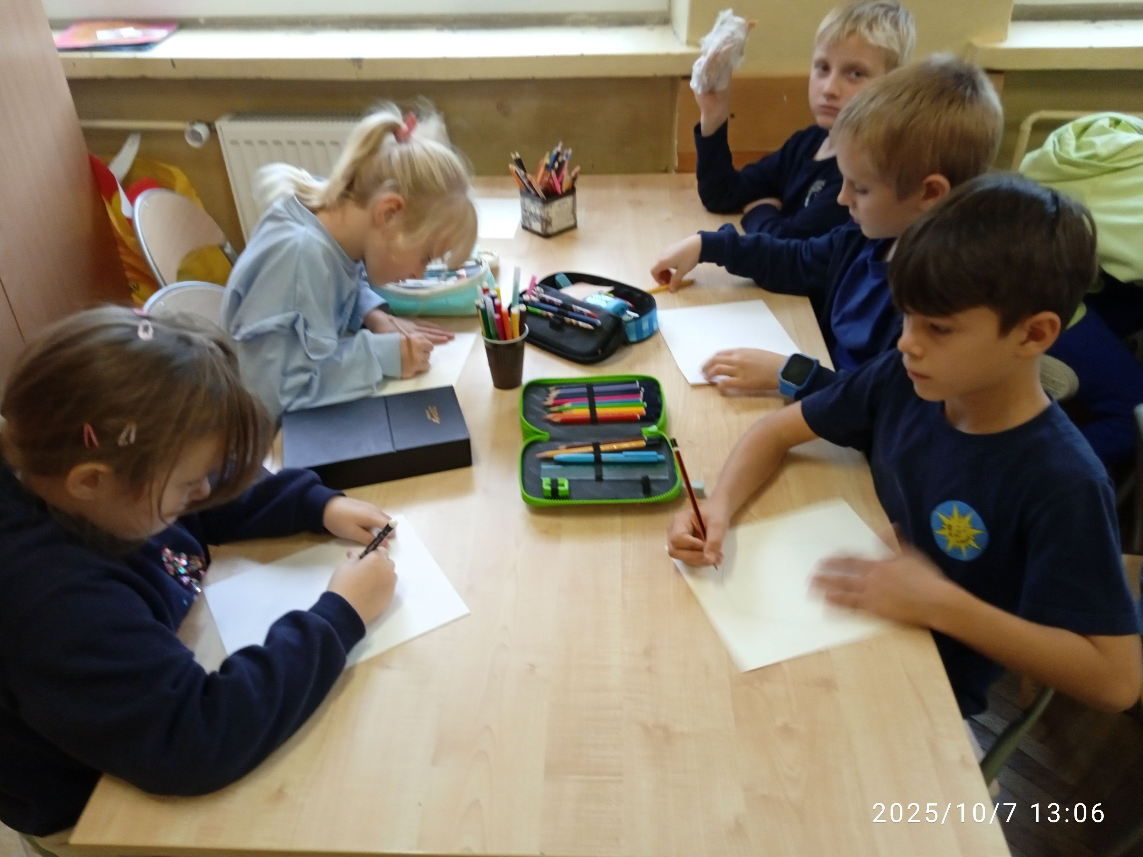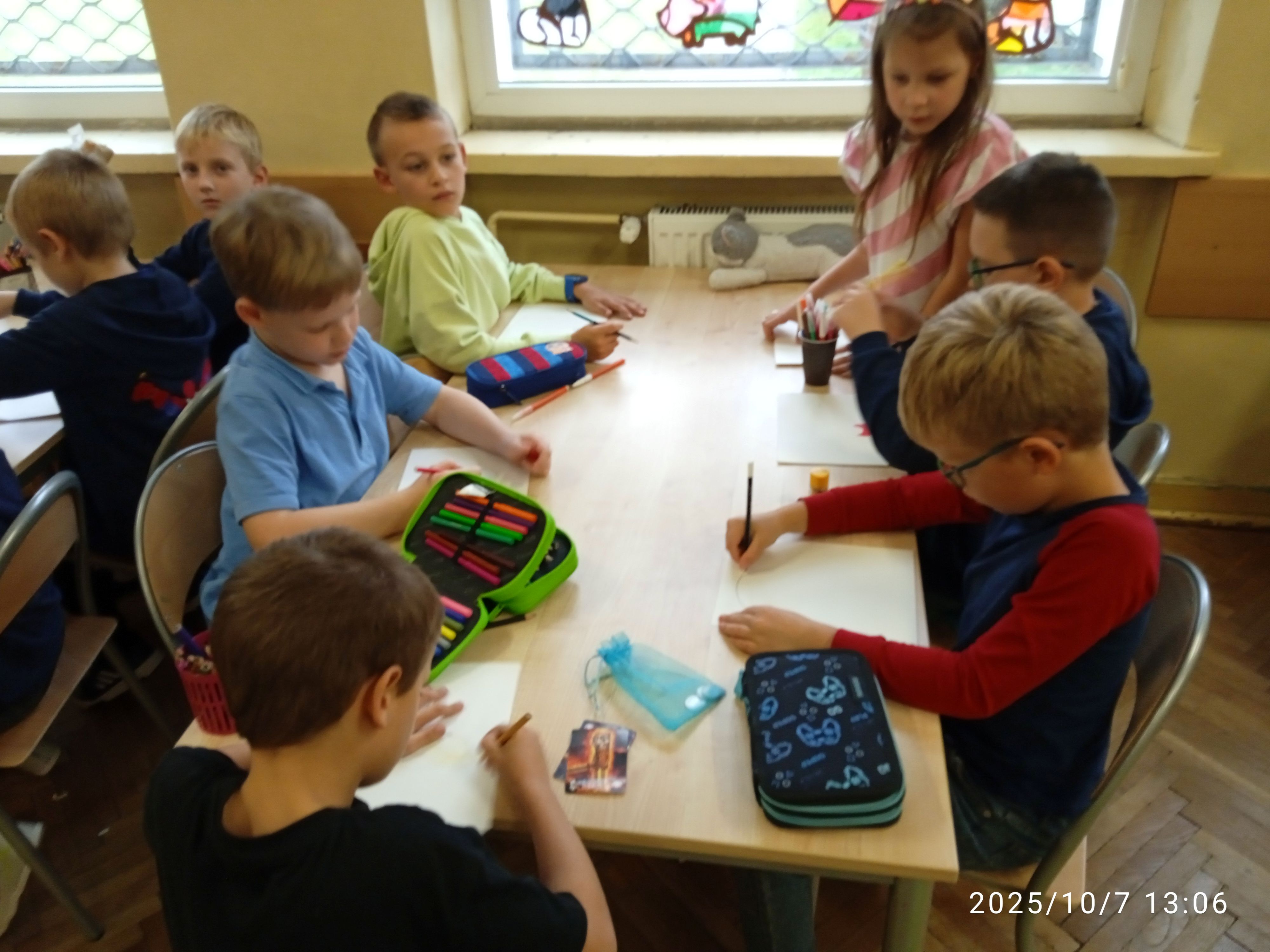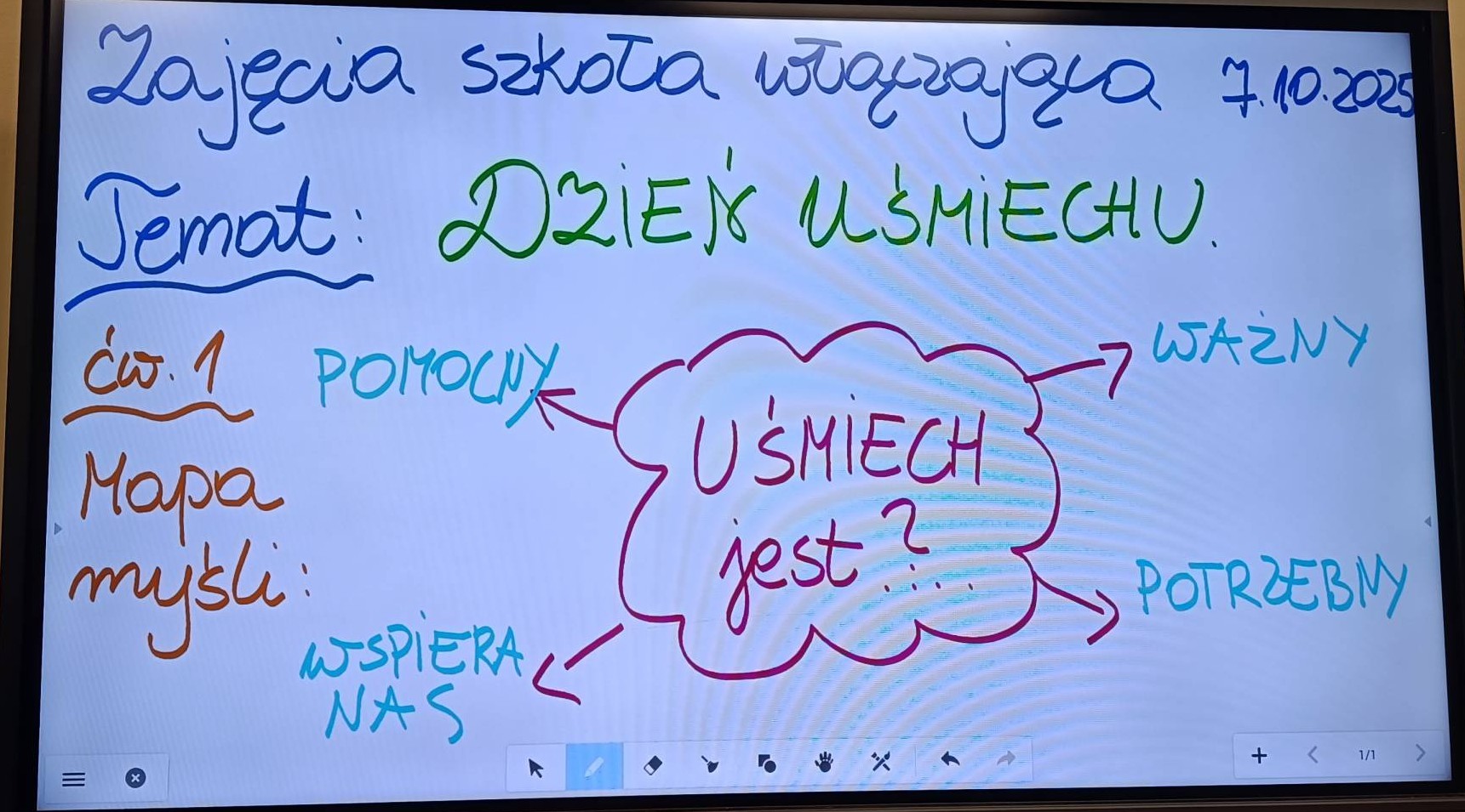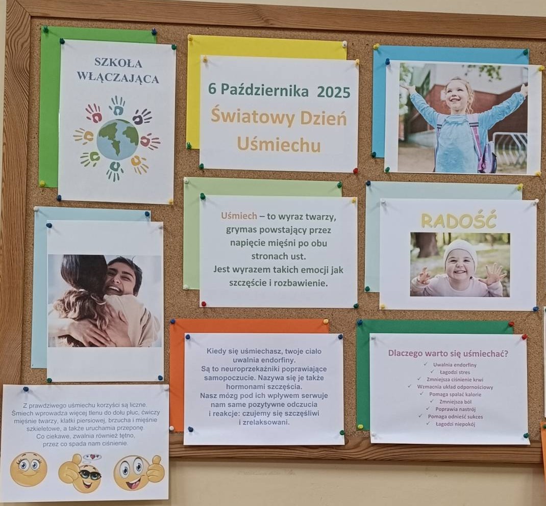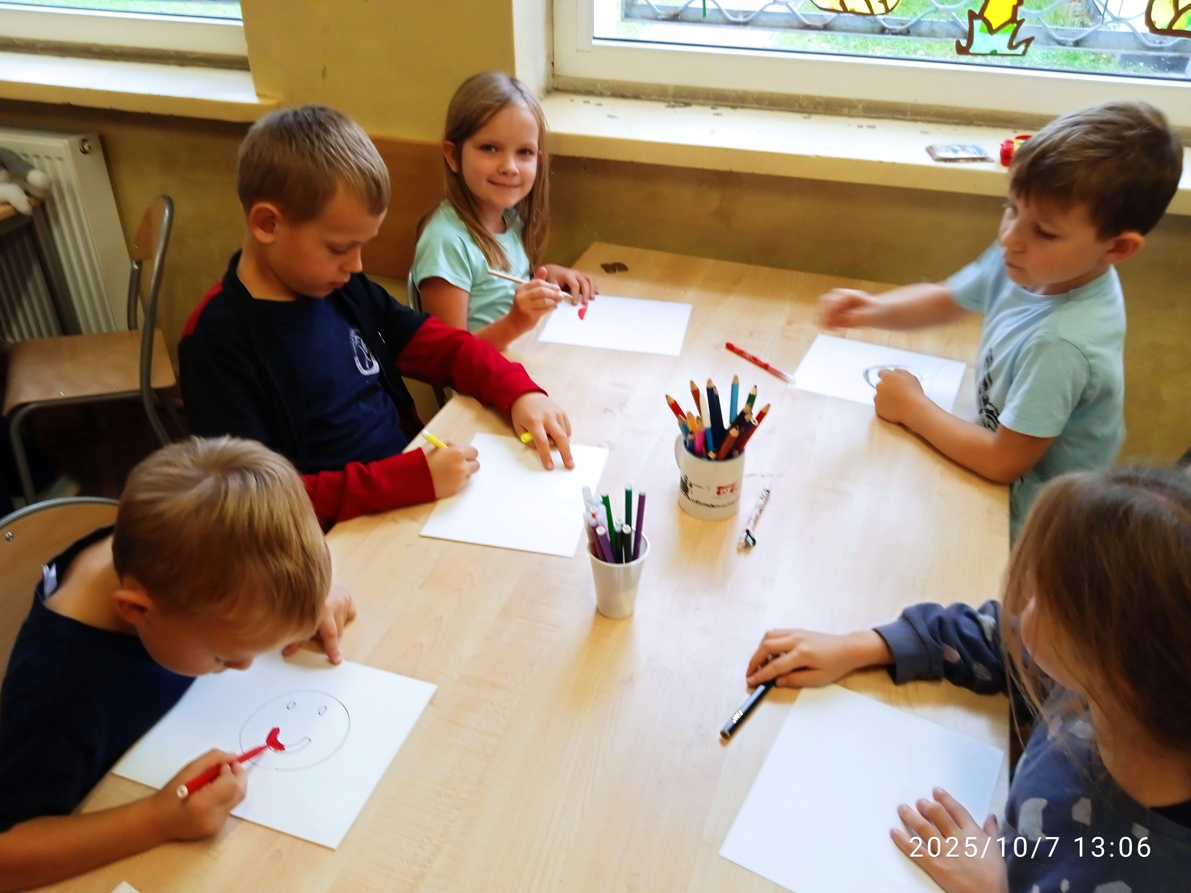 W dniu 7 października 2025 roku (wtorek) w naszej szkole odbyły się zajęcia świetlicowe o charakterze uspołeczniającym dla grupy uczniów z klas 2 i 3, dotyczące działań w ramach szkoły włączającej z okazji Światowego Dnia Uśmiechu pt. „Warto się uśmiechać do kolegów i koleżanek” . Dzieci wykonywały ciekawe ćwiczenia na kreatywność i pomysłowość. Wykonując te ćwiczenia praktyczne dzieci słuchały wybranych utworów muzyki relaksacyjnej, która miała pobudzić ich wyobraźnie oraz kreatywność. Dzieci tworzyły mapę myśli do słowa – „Uśmiech” podając własne skojarzenia. Uczniowie brali udział w zabawie pt. „Kto tak jak ja lubi …, to” wykonując gest lub ruch. Uczniom bardzo podobały się te ćwiczenia kreatywne. Zajęcia nie tylko miały uwrażliwić uczniów na tematykę ważności przyjaźni w życiu człowieka, pobudzić ich kreatywność w działaniu praktycznym, ale przede wszystkim miały zwrócić ich uwagę na współpracę w grupie rówieśniczej.
