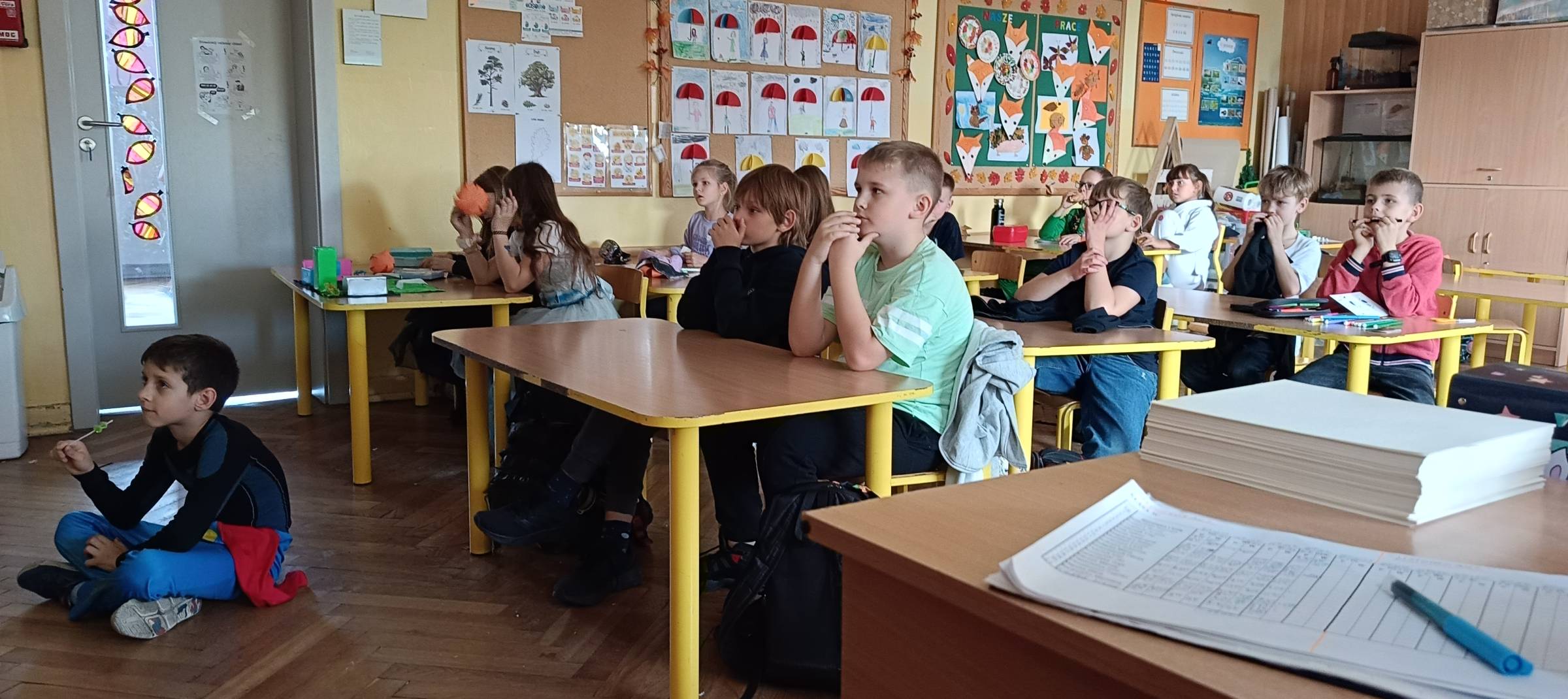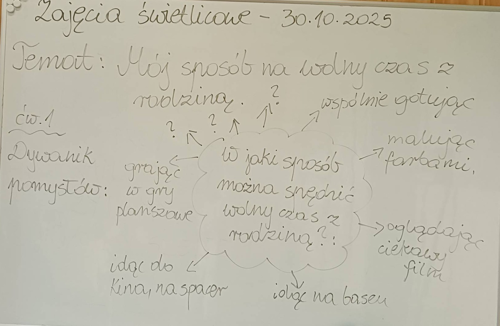 W dniu 30 października 2025 roku (czwartek) w naszej szkole odbyły się zajęcia świetlicowe z elementami muzykoterapii dla uczniów z klas 2 i 3 pt. „W jaki sposób możemy spędzić wolny czas z rodziną?”. Uczniowie zostali wprowadzeni w tematykę wolnego czasu. Mieli narysować siebie i swoją rodzinę jak wspólnie mogą spędzić wolny czas i opisać za co lubią wspólnie rysować, malować, spacerować, chodzić do kina w domu z najbliższymi. Wykonując to ćwiczenie plastyczne dzieci słuchały wybranych utworów muzyki relaksacyjnej, która miała pobudzić ich wyobraźnie oraz kreatywność.