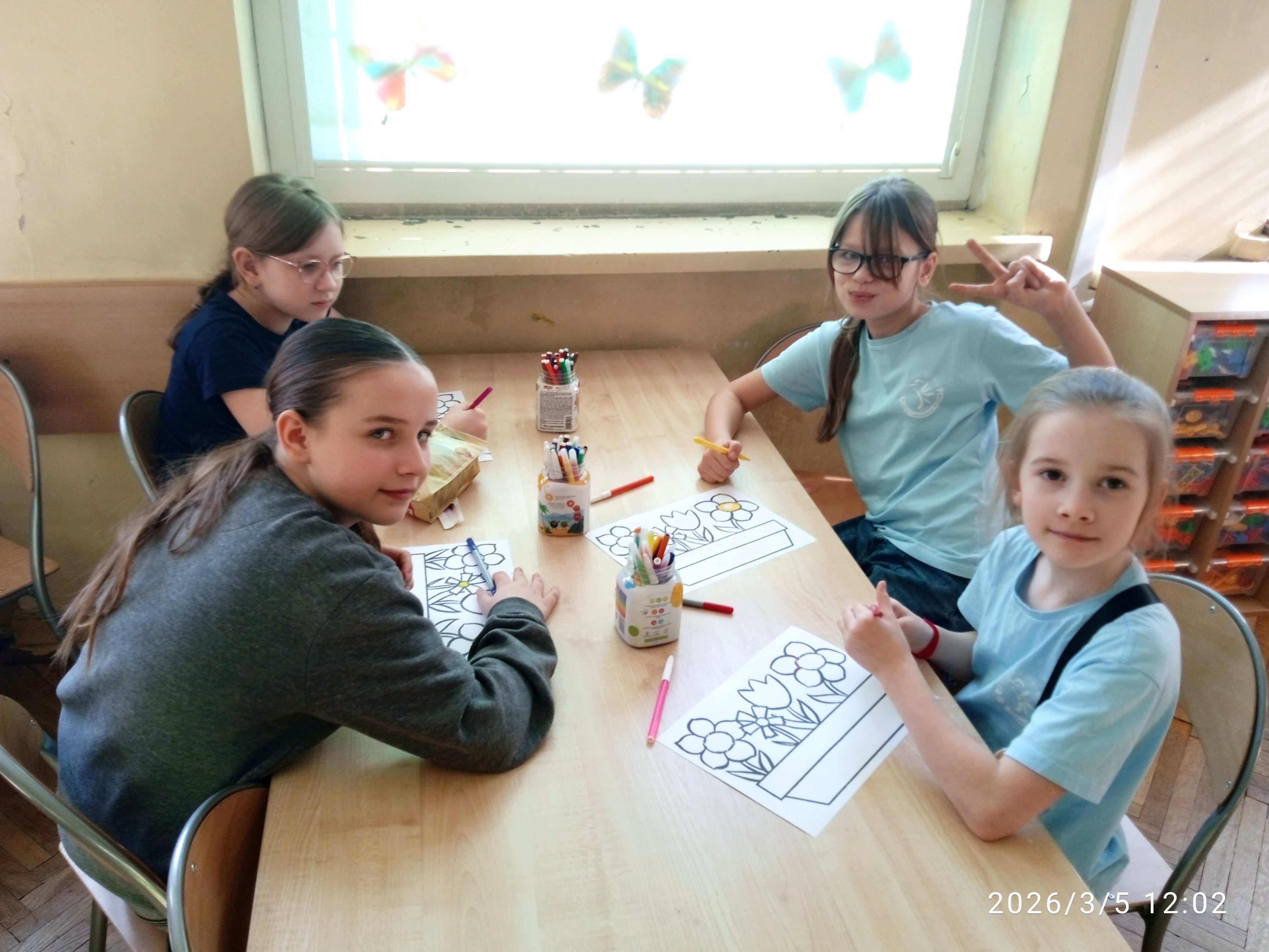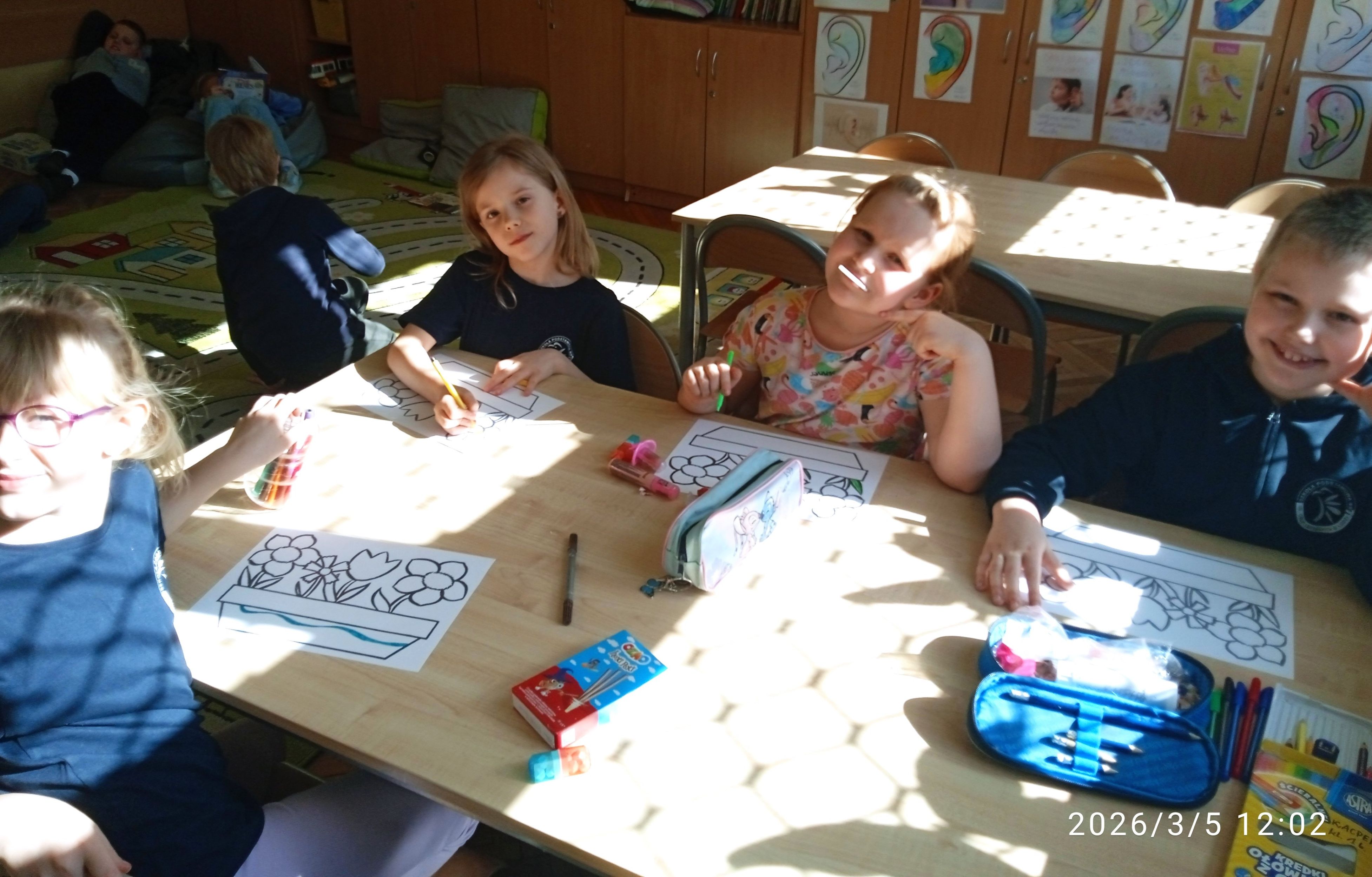 05.03.2026r. chętne dzieci z klasy 1b i 3d dekorowały naszą świetlicę. Stworzyły piękne, kolorowe, wiosenne kwiaty, które zakwitły na tablicy w sali 29. Mamy nadzieję, że wiosna szybko do nas zawita.