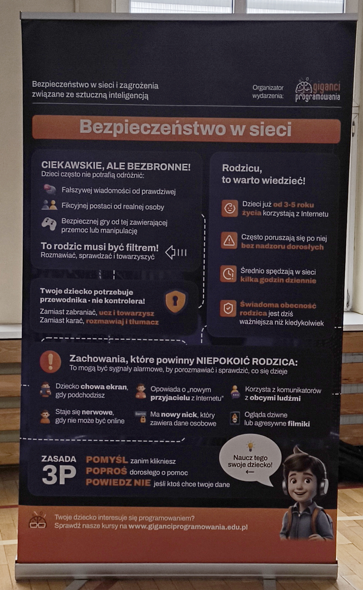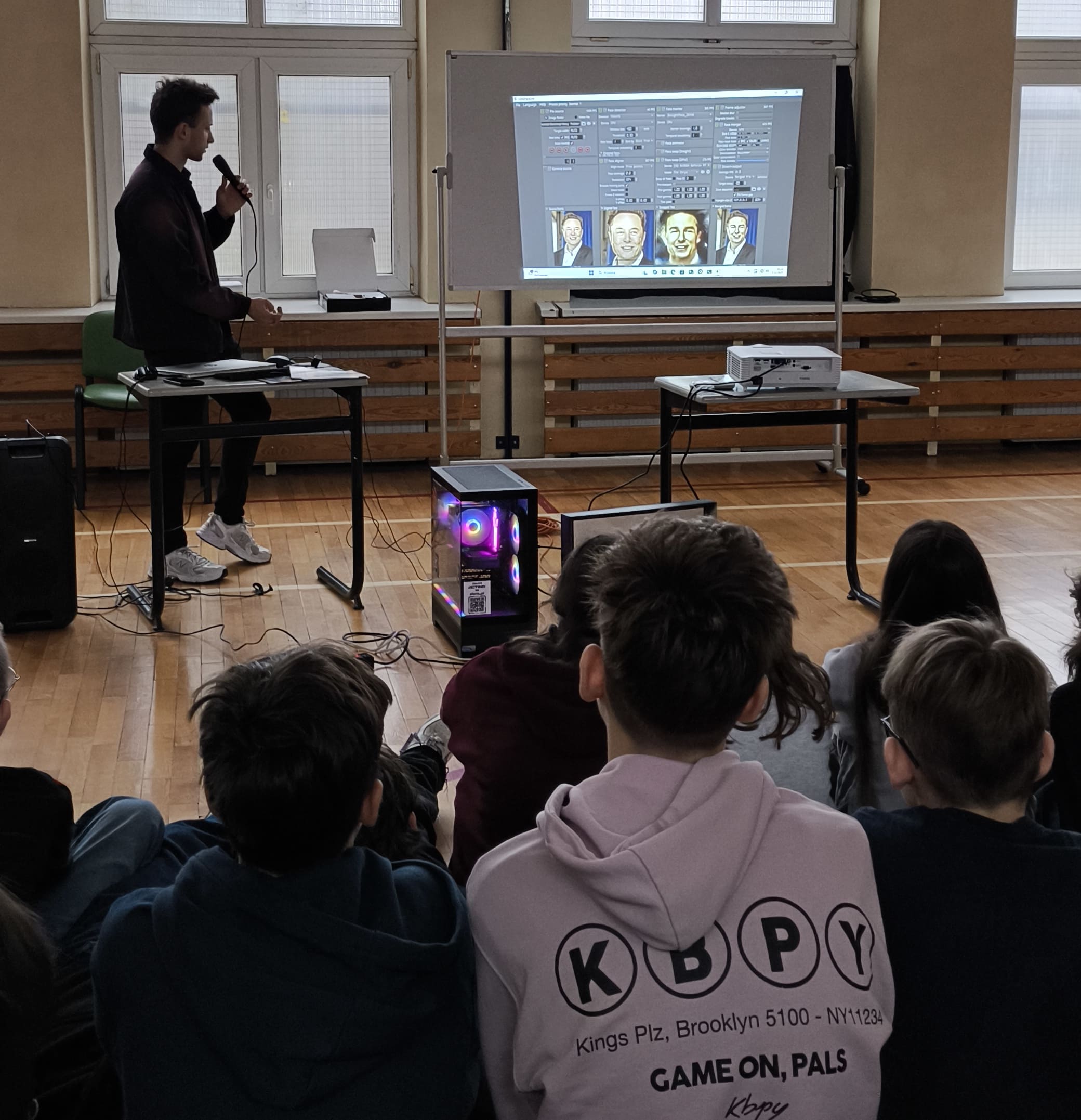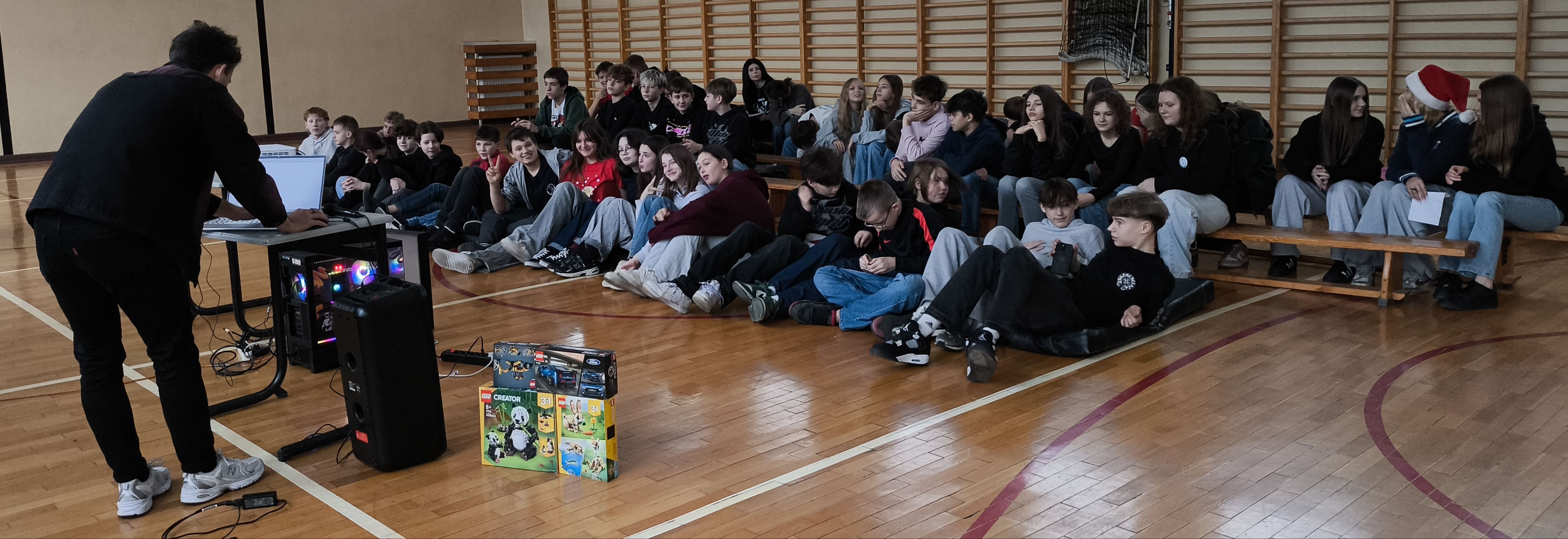 W naszej szkole odbyły się bezpłatne warsztaty edukacyjne pod hasłem „Bezpieczeństwo w sieci i zagrożenia związane ze sztuczną inteligencją” dzięki współpracy ze szkołą Giganci programowania. Zajęcia zostały przeprowadzone przez specjalistów zajmujących się edukacją cyfrową i skierowane były do uczniów klas 4–8. Uczniowie dowiedzieli się czym jest współczesna sztuczna inteligencja, a także zobaczyli że pokaz technologii deepfake, podczas którego mieli okazję zaobserwować na żywo, jak łatwo można zmienić obraz i twarz człowieka dzięki nowym narzędziom. Były krótkie dyskusje i ćwiczenia dotyczące odpowiedzialnego korzystania z internetu i rozpoznawania cyfrowych zagrożeń. Uczniowie dowiedzieli się m.in., jak chronić swoje dane, jak reagować na niepokojące sytuacje w sieci oraz jak krytycznie podchodzić do treści, które widzą w internecie. Prowadzący podkreślał znaczenie ostrożności, ale także możliwości, jakie daje odpowiedzialne korzystanie z nowych technologii.