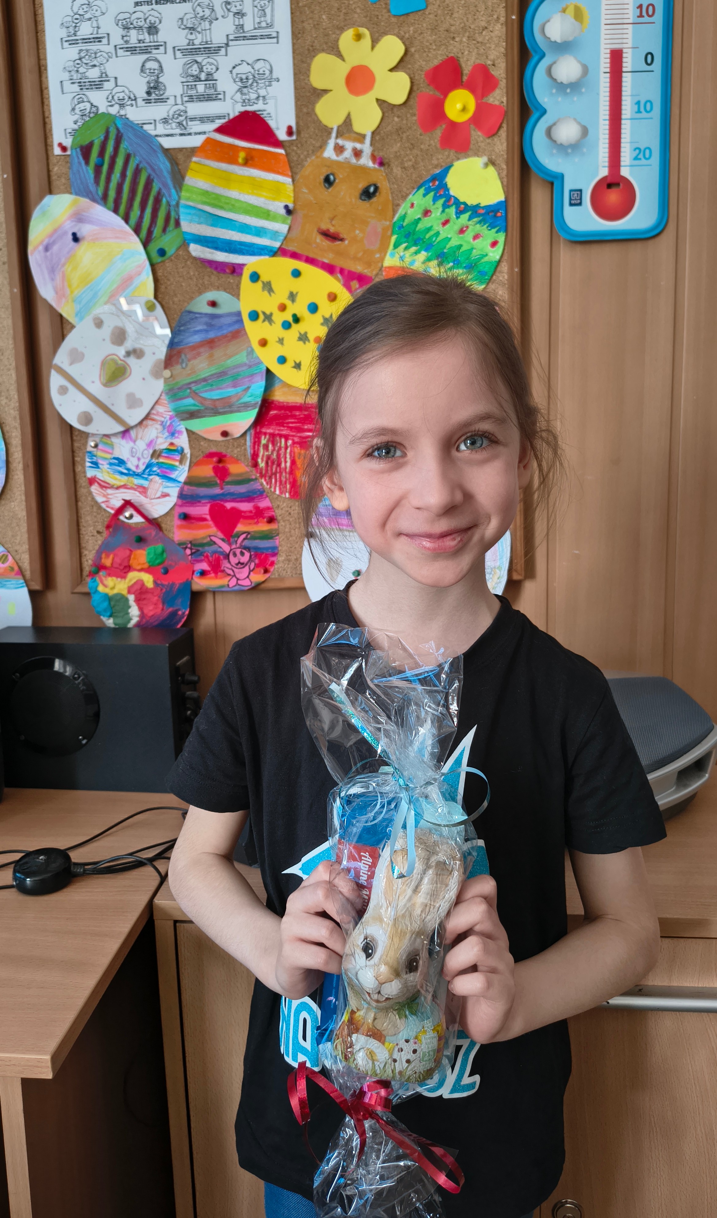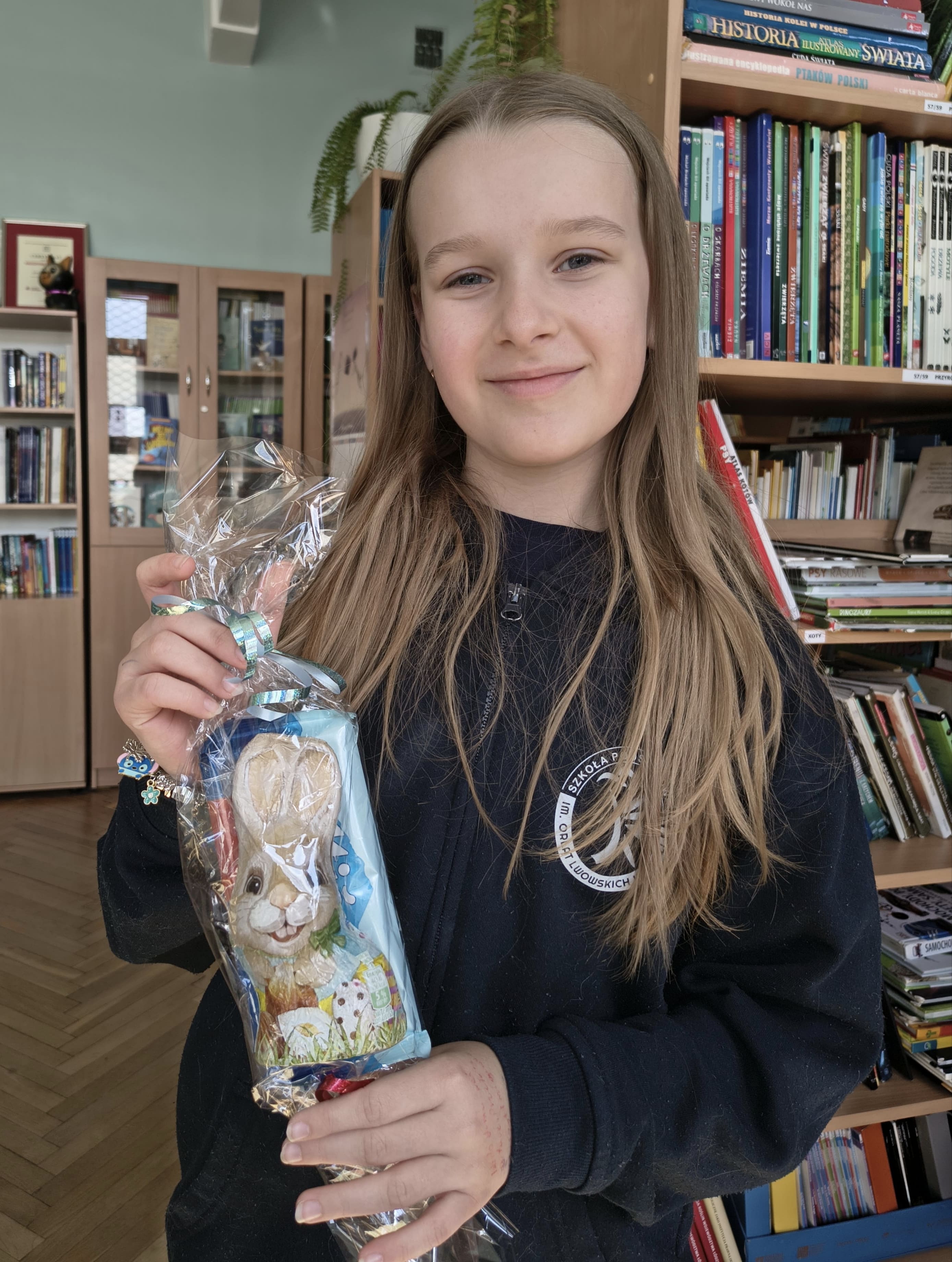 W ostatnich dniach poprzedzających święta wielkanocne uczniowie, którzy odwiedzili bibliotekę szkolną mogli wziąć udział w wielkanocnej zabawie bibliotecznej. Należało oszacować, ile czekoladowych jajeczek i słodkości zmieściło się w naszym szklanym zajączku. A było ich aż 41! Spośród 133 odpowiedzi 4 osoby wytypowały poprawną. W wyniku ponownego losowania zająca ze słodkościami wygrała Adrianna Patuszko z kl. III b, zaś nagrodę pocieszania otrzymali: Wiktoria Ziemba kl. V d, Zuzanna Majewska kl. VI a i Emilia Owczarek kl. I b.