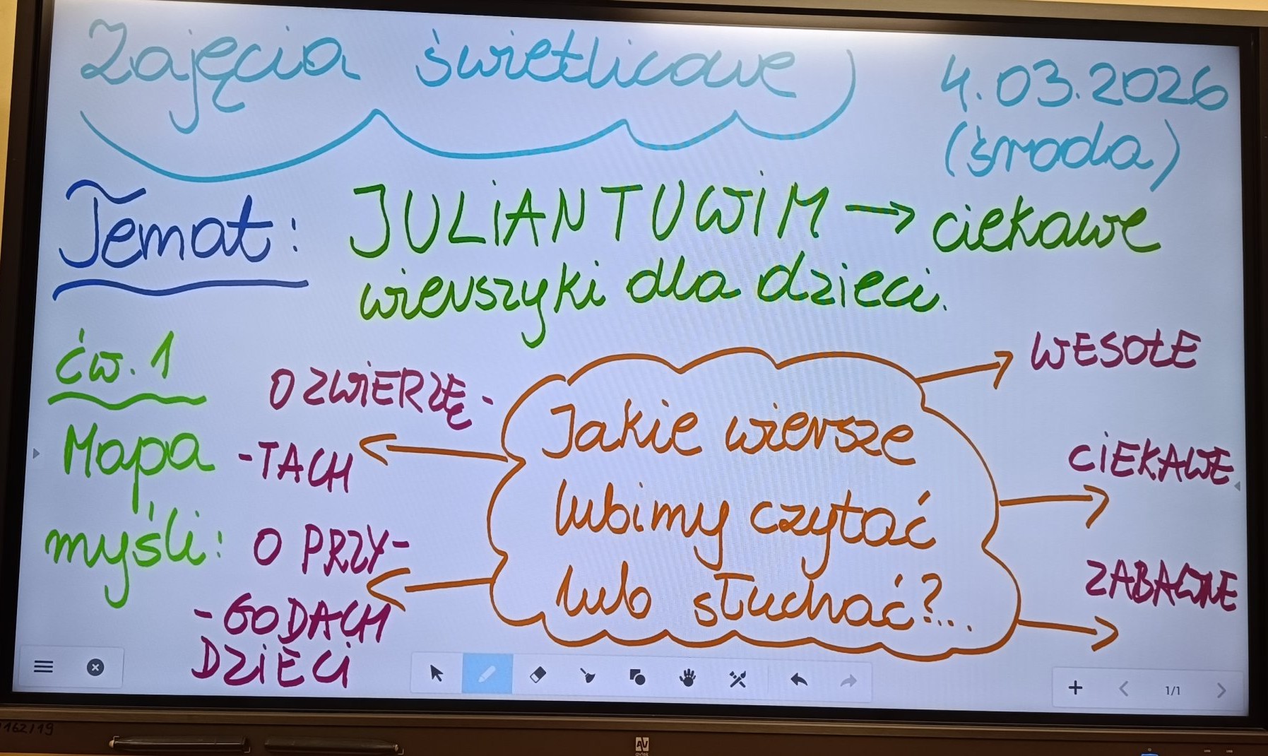 W dniu 4 marca 2026 roku (środa) w naszej szkolnej świetlicy odbyły się zajęcia świetlicowe poświęcone tematyce poezji dla dzieci Juliana Tuwima. Uczniowie zostali wprowadzeni w tematykę wyjaśnienia słowa „poezja”, poznali sylwetkę poety. Dzieci obejrzały wybrane wiersze oglądając zbiór wierszy wypożyczonej ze szkolnej biblioteki. Każde dziecko miało powiedzieć jakie zna lub czytało już wiersze tego poety – mapa myśli. Dzieci wzięły udział w zabawach ruchowo – muzycznych integrujących społeczność świetlicową min: tor zagadek, czarodziejskie pudełko, kto tak jak ja? Uczniowie mieli za zadanie wcielić się w rolę aktorów i przeczytać fragment wybranego wierszyka. Uczniowie wykonując ćwiczenie na dykcję słuchali muzyki relaksacyjnej, która sprzyjała kreatywności i skupieniu dzieci. Uczniom bardzo ta forma pracy plastycznej się podobała, z dużym zaangażowaniem przystąpili do pracy podczas zajęć świetlicowych. Wszystkie dzieci bardzo się starały wykonać swoją pracę pomysłowo.