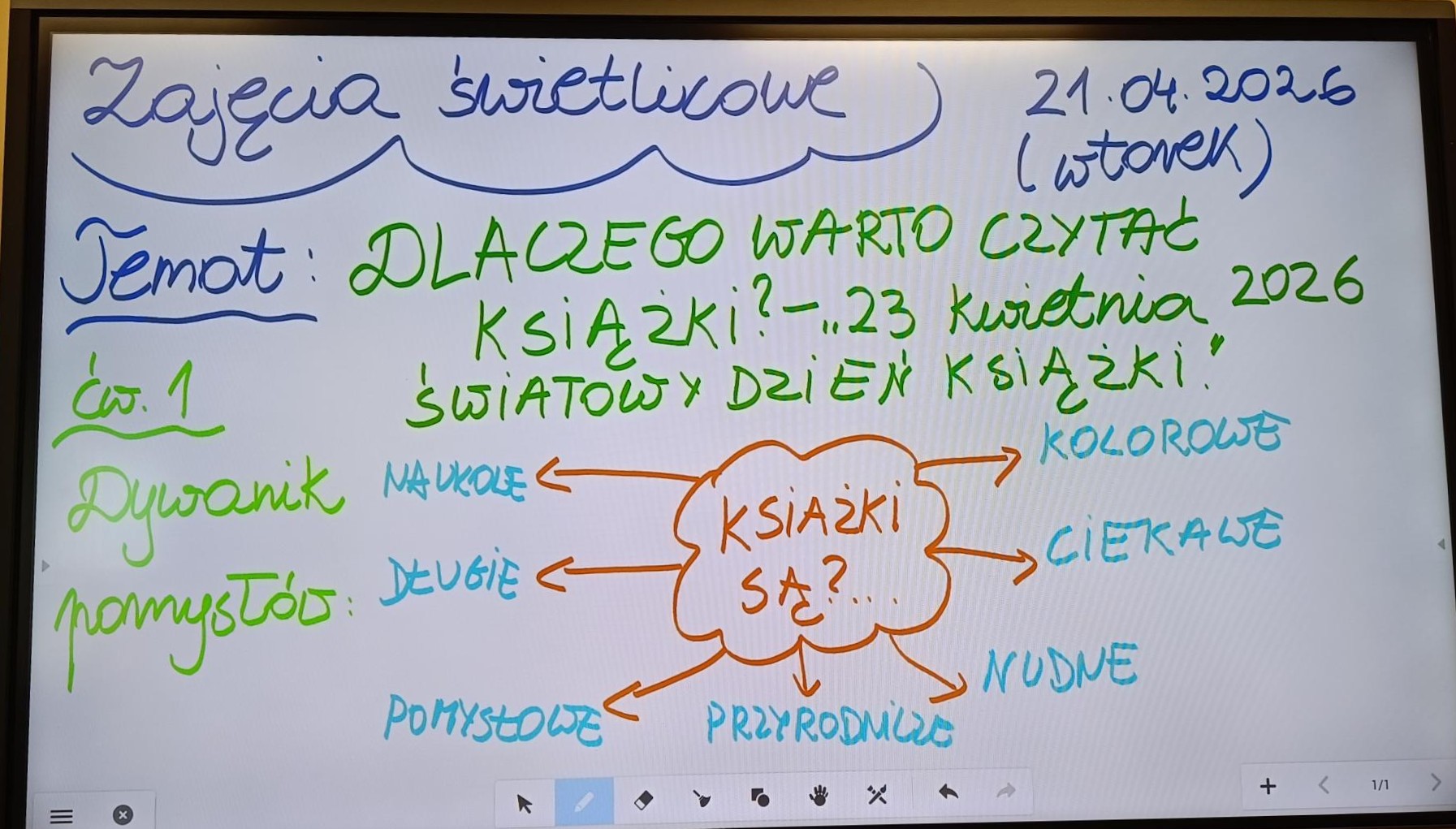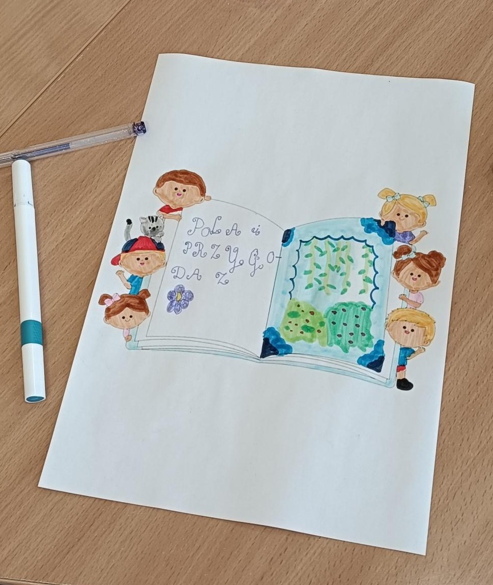 W dniu 21 kwietnia 2026 roku (wtorek) w naszej szkolnej świetlicy odbyły się zajęcia świetlicowe w ramach działań rozwijających kreatywne myślenie pt. „Dlaczego warto czytać książki?”. Uczniowie zostali wprowadzeni w tematykę pojęcia „książka”, „czytanie”, ”pasja czytania”, „przygody”, „wielozmysłowe wyobrażenie sobie - wizualizacja”, ”dbanie o książki”. Dzieci obejrzały film edukacyjny o hobby jakim jest pasja do czytania książek. Każde dziecko miało powiedzieć z czym kojarzy mu się słowo „książka”. Dzieci wzięły udział w zabawach ruchowo – muzycznych integrujących. Uczniowie mieli za zadanie wymyśleć własny element książki, mieli wcielić się w rolę autora książki dla dzieci i wymyśleć jej tytuł. Uczniowie wykonując to ćwiczenie na pomysłowość słuchali muzyki relaksacyjnej, która sprzyjała kreatywności i skupieniu dzieci na wykonywanym zadaniu na wyobraźnię. Uczniom bardzo ta forma pracy się podobała, z dużym zaangażowaniem przystąpili do pracy podczas zajęć świetlicowych. Wszystkie dzieci bardzo się starały wykonać to ćwiczenie samodzielnie, brawo. Uczniowie wykonali pracę plastyczną (kredki, mazaki, pastele suche) obrazek do własnej książki.