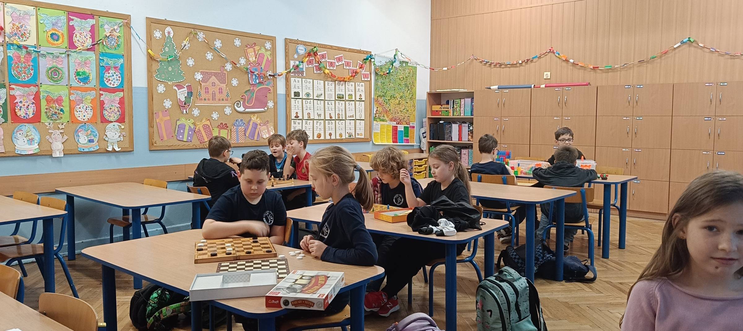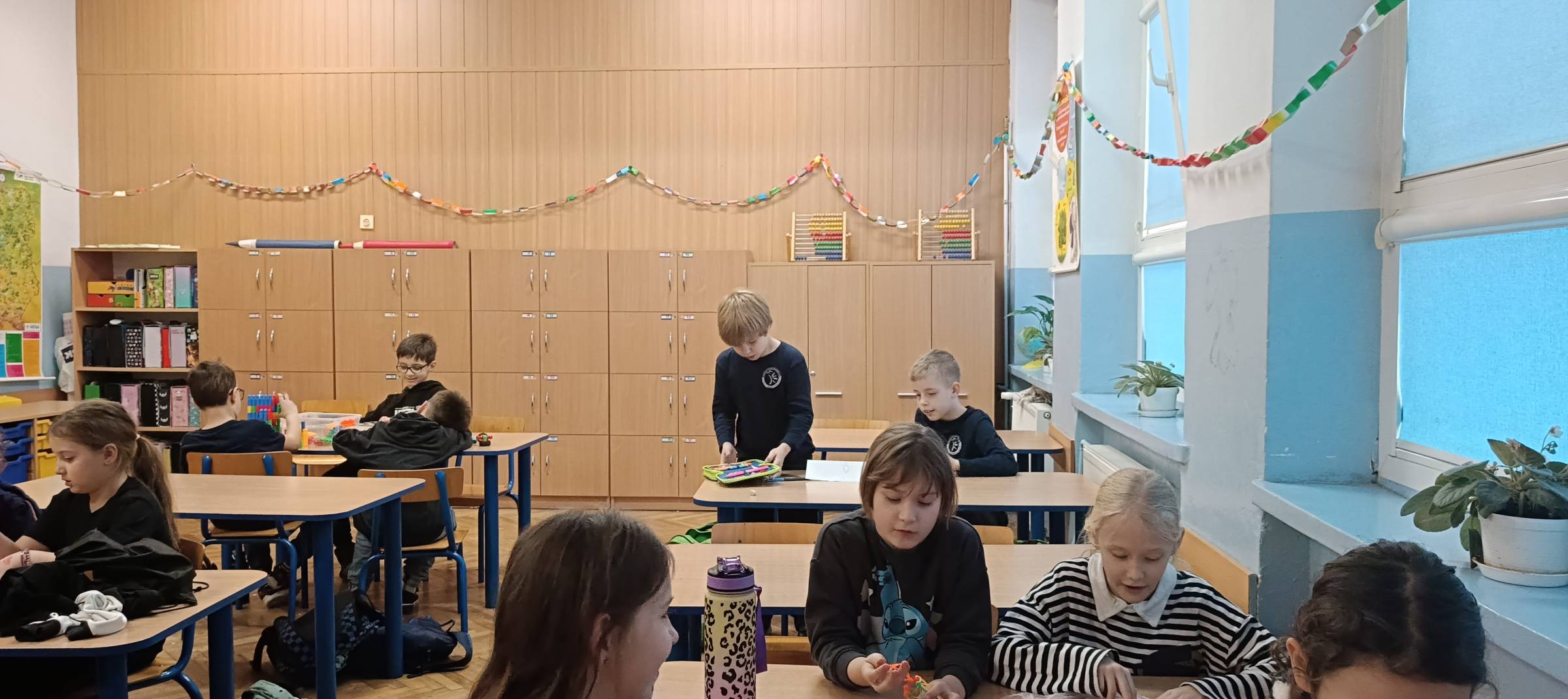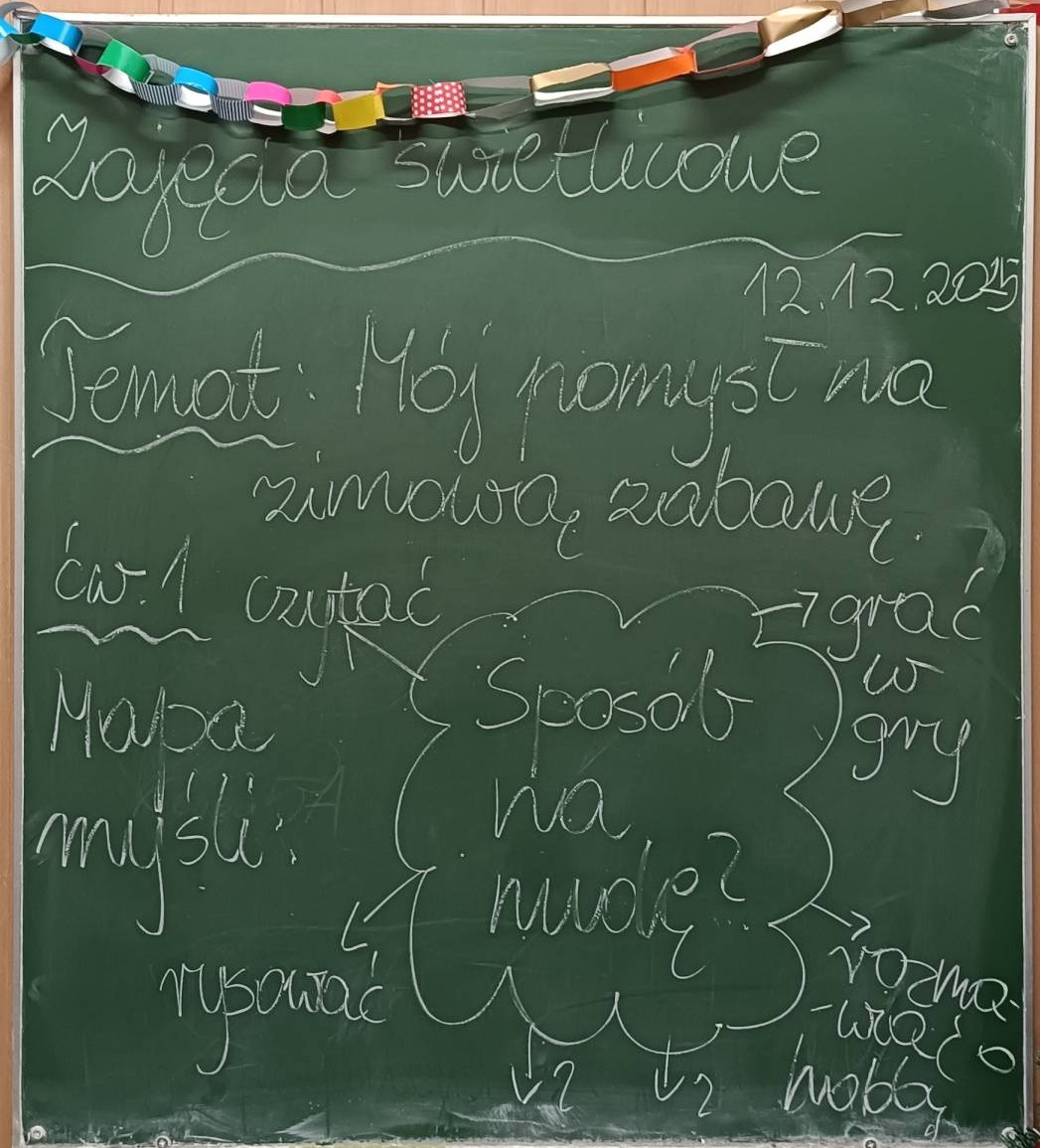 W dniu 12 grudnia 2025 roku (piątek) w naszej szkolnej świetlicy odbyły się zajęcia świetlicowe w ramach działań rozwijających kreatywne myślenie pt. „Mój sposób na zimową zabawę”. Uczniowie zostali wprowadzeni w tematykę pojęcia „zabawa”, „spędzanie kreatywne wolnego czasu z kolegami”. Dzieci obejrzały film edukacyjny o różnych zainteresowaniach np. grą w szachy, warcaby, chińczyka, układanie puzzli, układanie lego, układanie klocków. Każde dziecko miało powiedzieć jaki ma swój sposób na zimową zabawę w domu i ją narysować. Dzieci wzięły udział w zabawach ruchowo – muzycznych integrujących społeczność świetlicową min: czarodziejskie pudełko, spacer sensoryczny – ścieżka. Uczniowie mieli za zadanie wymyślić nowe prawa jakie mogliby stworzyć, gdyby mieli taką możliwość. Uczniowie wykonując pracę plastyczną słuchali muzyki relaksacyjnej, która sprzyjała kreatywności i skupieniu dzieci na wykonywanym zadaniu plastycznym. Uczniom bardzo ta forma pracy plastycznej się podobała, z dużym zaangażowaniem przystąpili do pracy podczas zajęć świetlicowych. Wszystkie dzieci bardzo się starały wykonać swoją pracę plastyczną pomysłowo i kolorowo.