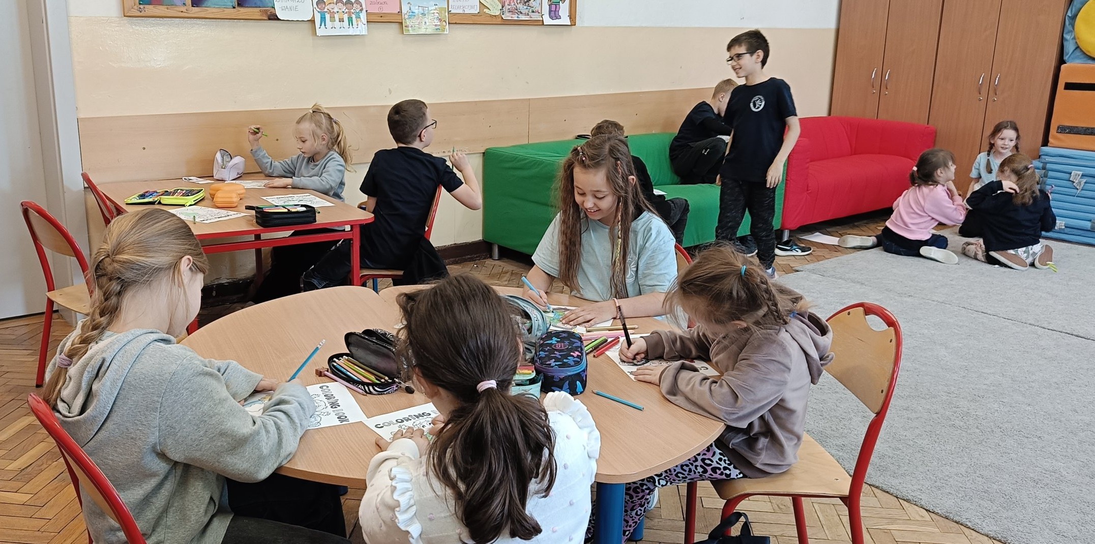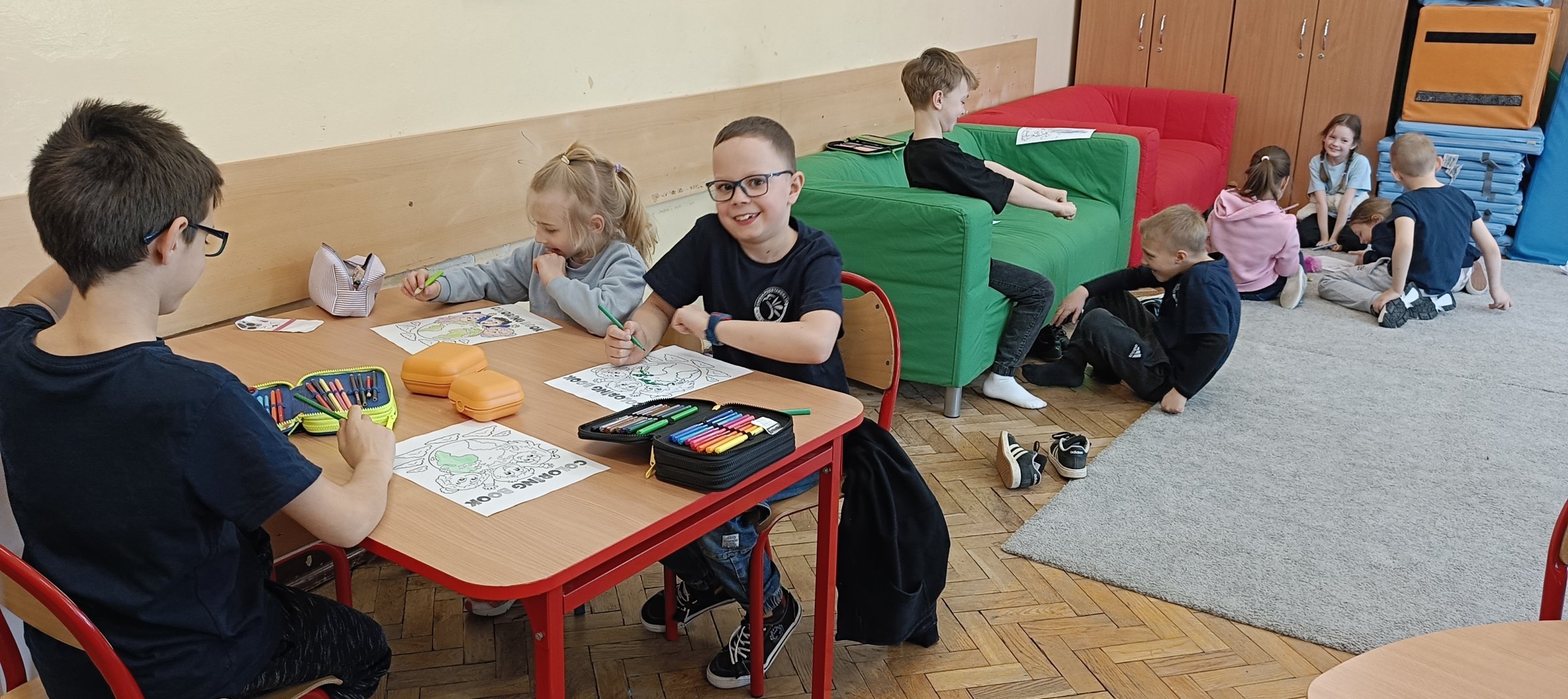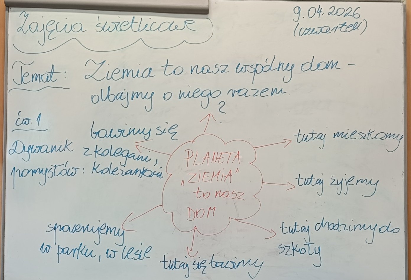 W dniu 9 kwietnia 2026 roku (czwartek) w naszej szkolnej świetlicy odbyły się zajęcia świetlicowe w ramach działań rozwijających kreatywne myślenie pt. „Ziemia nasz dom”. Uczniowie zostali wprowadzeni w tematykę pojęcia „planeta”, „Ziemia”, ”krajobraz”, „ekologia”, „przyroda naturalna”, ”dbanie o planetę”. Dzieci obejrzały film edukacyjny o zmianach w przyrodzie pod wpływem działań człowieka. Każde dziecko miało powiedzieć z czym kojarzy mu się słowo „Ziemia nasz dom”. Dzieci wzięły udział w zabawach ruchowo – muzycznych integrujących. Uczniowie mieli za zadanie wymyśleć własny element ekologiczny krajobrazu jaki można zobaczyć za oknem (uruchomienie własnej wyobraźni i kreatywności przestrzennej). Uczniowie wykonując to ćwiczenie na pomysłowość słuchali muzyki relaksacyjnej, która sprzyjała kreatywności i skupieniu dzieci na wykonywanym zadaniu na wyobraźnię. Uczniom bardzo ta forma pracy się podobała, z dużym zaangażowaniem przystąpili do pracy podczas zajęć świetlicowych. Wszystkie dzieci bardzo się starały wykonać to ćwiczenie samodzielnie, brawo. Uczniowie wykonali pracę plastyczną (kredki, mazaki, pastele suche) obrazek planety Ziemi.