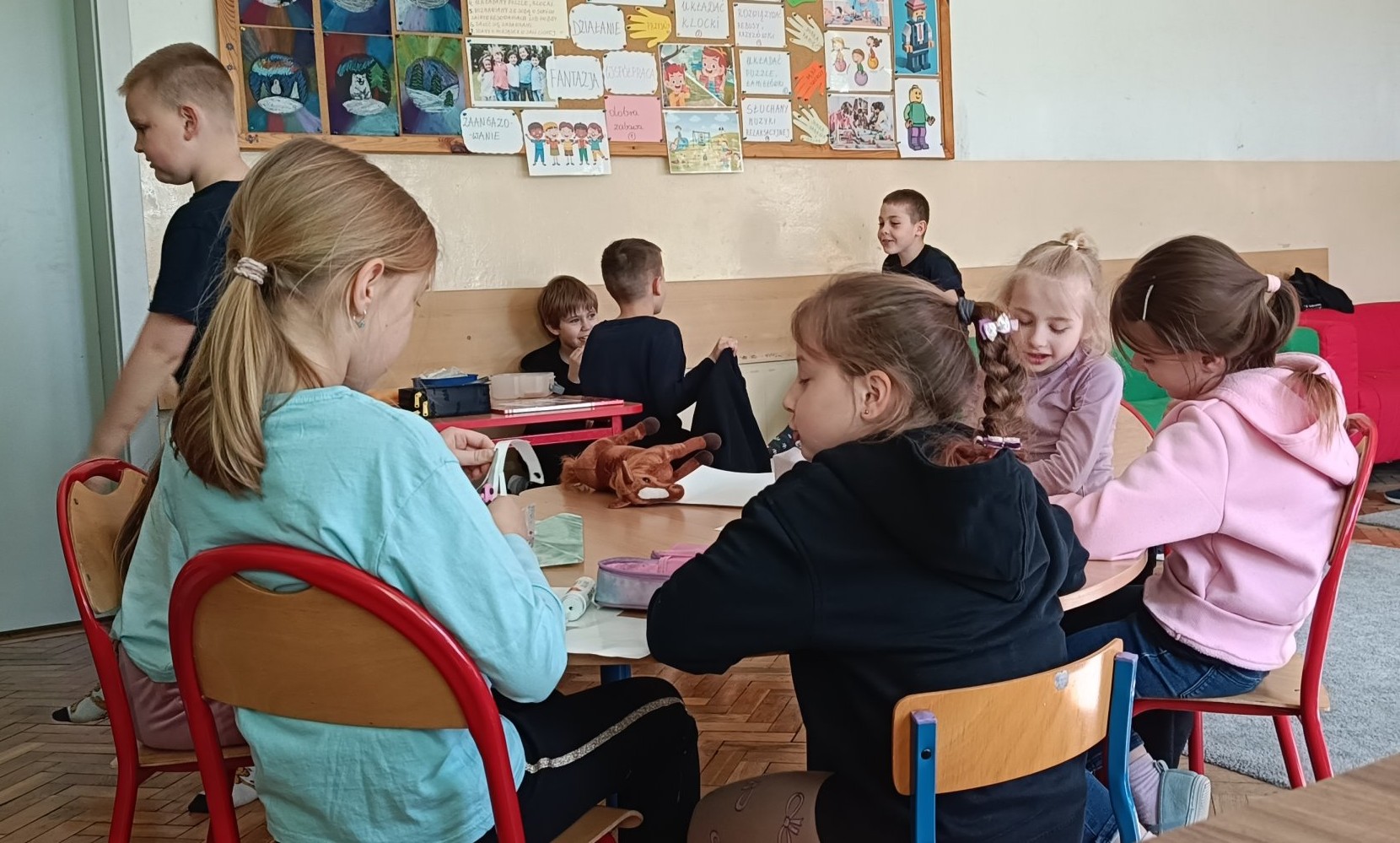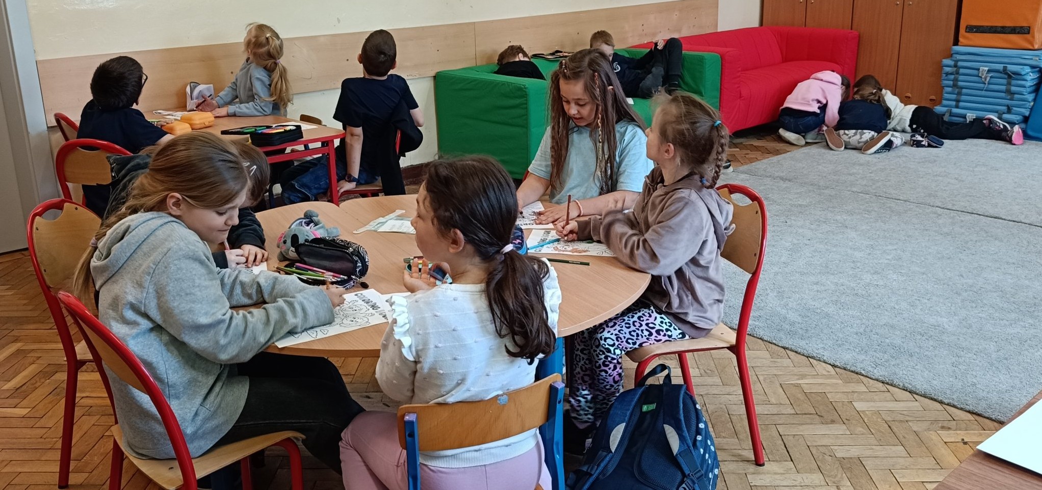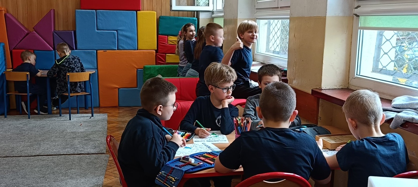 W dniu 9 kwietnia 2026 roku (czwartek) w naszej szkolnej świetlicy odbyły się zajęcia świetlicowe w ramach działań rozwijających kreatywne myślenie pt. „Ziemia nasz dom”. Uczniowie zostali wprowadzeni w tematykę pojęcia „planeta”, „Ziemia”, ”krajobraz”, „ekologia”, „przyroda naturalna”, ”dbanie o planetę”. Dzieci obejrzały film edukacyjny o zmianach w przyrodzie pod wpływem działań człowieka. Każde dziecko miało powiedzieć z czym kojarzy mu się słowo „Ziemia nasz dom”. Dzieci wzięły udział w zabawach ruchowo – muzycznych integrujących. Uczniowie mieli za zadanie wymyśleć własny element ekologiczny krajobrazu jaki można zobaczyć za oknem (uruchomienie własnej wyobraźni i kreatywności przestrzennej). Uczniowie wykonując to ćwiczenie na pomysłowość słuchali muzyki relaksacyjnej, która sprzyjała kreatywności i skupieniu dzieci na wykonywanym zadaniu na wyobraźnię. Uczniom bardzo ta forma pracy się podobała, z dużym zaangażowaniem przystąpili do pracy podczas zajęć świetlicowych. Wszystkie dzieci bardzo się starały wykonać to ćwiczenie samodzielnie, brawo. Uczniowie wykonali pracę plastyczną (kredki, mazaki, pastele suche) obrazek planety Ziemi.