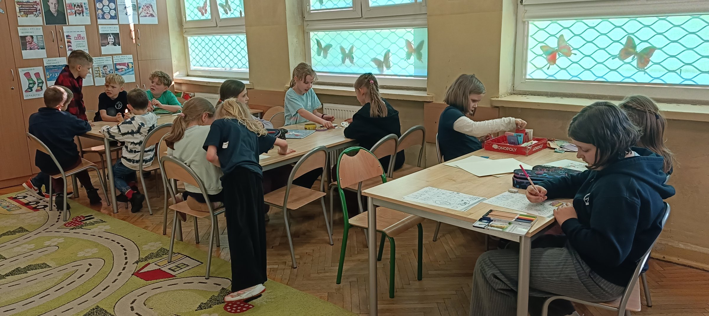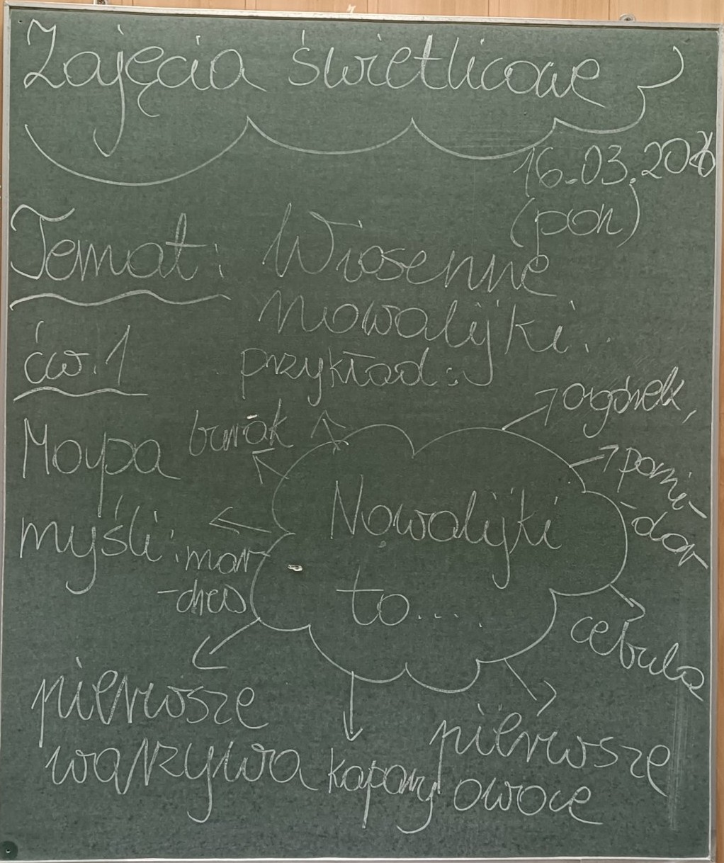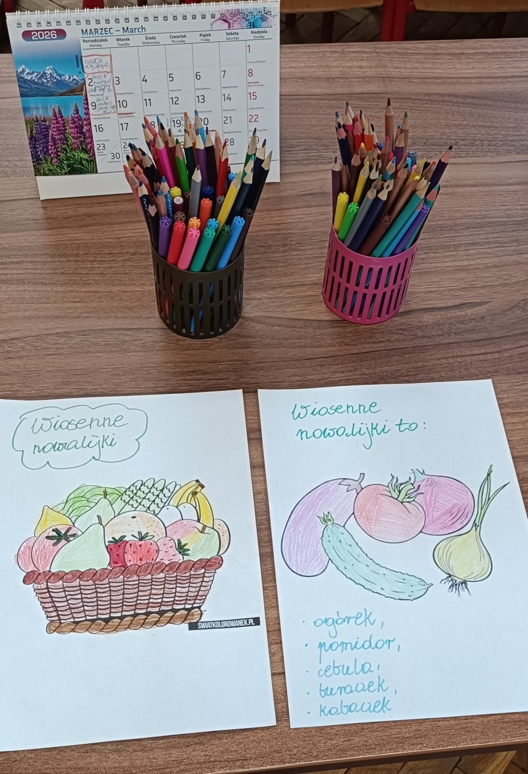 W dniu 16 marca 2026 roku(poniedziałek) w naszej szkolnej świetlicy odbyły się zajęcia świetlicowe pt. „Wiosenne nowalijki” dla uczniów z klasy 1a i 2c, 2a. Uczniowie z klasy 1a i 2c, 2a zostali wprowadzeni w tematykę zdrowego odżywiania. Uczniowie z klas 1 i 2 podczas zajęć świetlicowych mieli za zadanie wcielić się w rolę twórcy zdrowego soku z owoców lub warzyw wymyśleć własny sok. Zabawa plastyczna mające na celu poszerzenie własnej wyobraźni i pomysłowości oraz współpracy w grupie pomogły dzieciom otworzyć się na własną twórczość plastyczną. Dzieci uważanie i z dużą empatią uczestniczyły w tych zajęciach, były bardzo ciekawe i z chęcią wykonały zaproponowane ćwiczenia praktyczne. Uczniowie z zaangażowaniem uczestniczyli w zaproponowanych zajęciach świetlicowych. Powstały ciekawe obrazki wiosennych nowalijek.