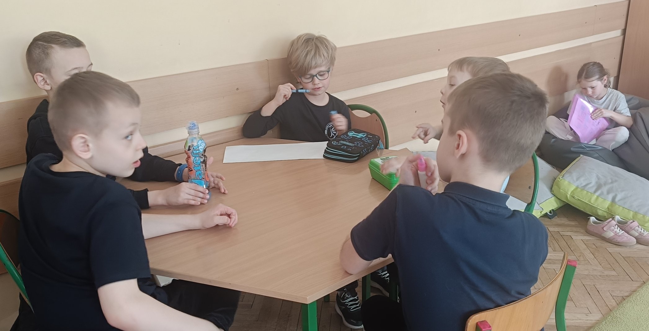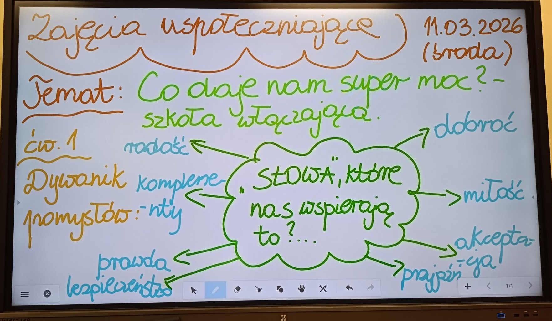 W dniu 11 marca 2026 roku (środa) w naszej szkole odbyły się zajęcia świetlicowe o charakterze uspołeczniającym dla grupy uczniów z klas 1a i 2a,3d dotyczące działań w ramach szkoły włączającej pt. „Co daje nam super moc?” Uczniowie zostali wprowadzeni w tematykę pojęć: „ słowo”, „bodźce”, „zmysły”, „emocje”, „siła”. Dzieci wykonywały ciekawe ćwiczenia na kreatywność i pomysłowość. Wykonując te ćwiczenia praktyczne dzieci słuchały wybranych utworów muzyki relaksacyjnej, która miała pobudzić ich wyobraźnie oraz kreatywność. Uczniom bardzo podobały się te ćwiczenia kreatywne. Zajęcia nie tylko miały uwrażliwić uczniów na tematykę wybranych utworów, pobudzić ich kreatywność w działaniu praktycznym, ale przede wszystkim miały zwrócić ich uwagę na współpracę w grupie rówieśniczej. To działanie bardzo je zaciekawiło.