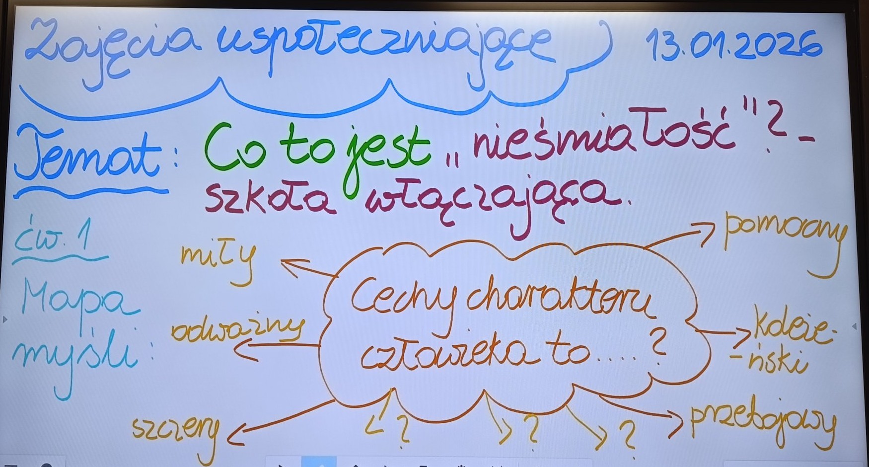 W dniu 13 stycznia 2026 roku (wtorek) w naszej szkolnej świetlicy odbyły się zajęcia psychoedukacyjne z elementami socjoterapii poświęcone tematyce z okazji Międzynarodowego Dnia Osób Nieśmiałych w ramach działań szkoły włączającej. Uczniowie z klas młodszych 1a, 2c, zostali wprowadzeni w tematykę pojęcia „emocji”, „akceptacja”, „nieśmiałości”, „integracja”, „przyczyn nieśmiałości”. Uczniowie z klas 1 i 2 podczas zajęć uczestniczyli w zabawach integracyjnych polegających na wcieleniu się w różne sytuacje społeczne, odgadywanie haseł związanych z różnicami związanymi z nieśmiałością. Zabawy mające na celu integrację, empatię, współpracę w grupie pomogły dzieciom zrozumieć, że nieśmiałość, jako cechę charakteru człowieka. Dzieci uważanie i z dużą empatią uczestniczyły w tych zajęciach, były bardzo ciekawe i z chęcią wykonały zaproponowane ćwiczenia praktyczne. Uczniowie z zaangażowaniem uczestniczyli w ćwiczeniu praktycznym – mapa myśli, gdzie mogli podawać cechy człowieka. Uczniowie w sposób praktyczny przy stolikach mieli możliwość wykazać się zrozumieniem wobec kolegów nieśmiałych w trakcie zabaw min: gry planszowej czy układaniu klocków.