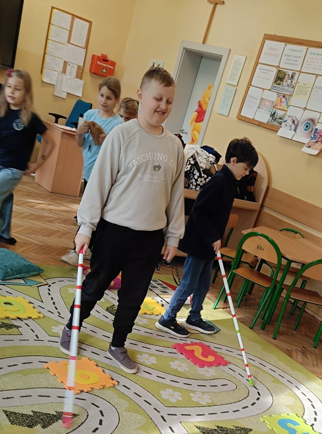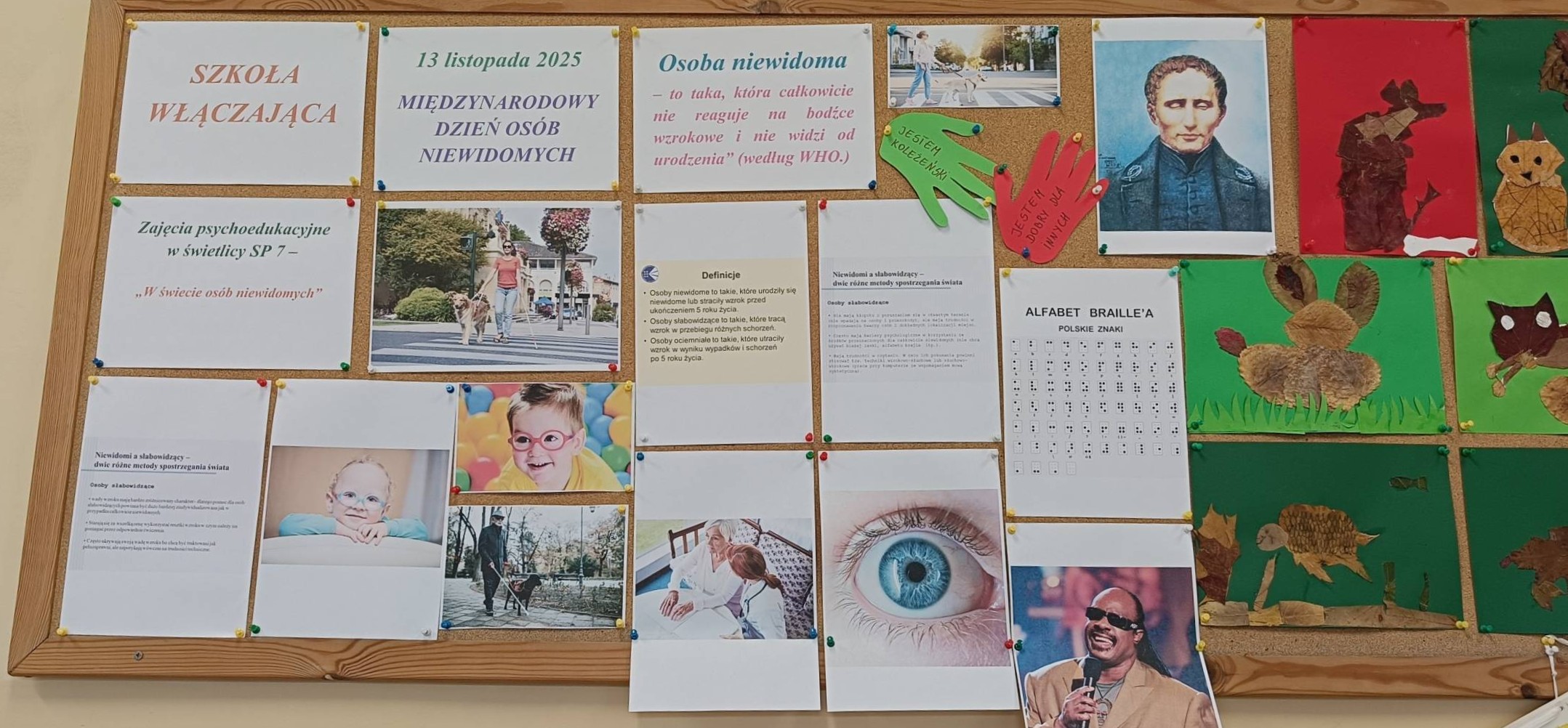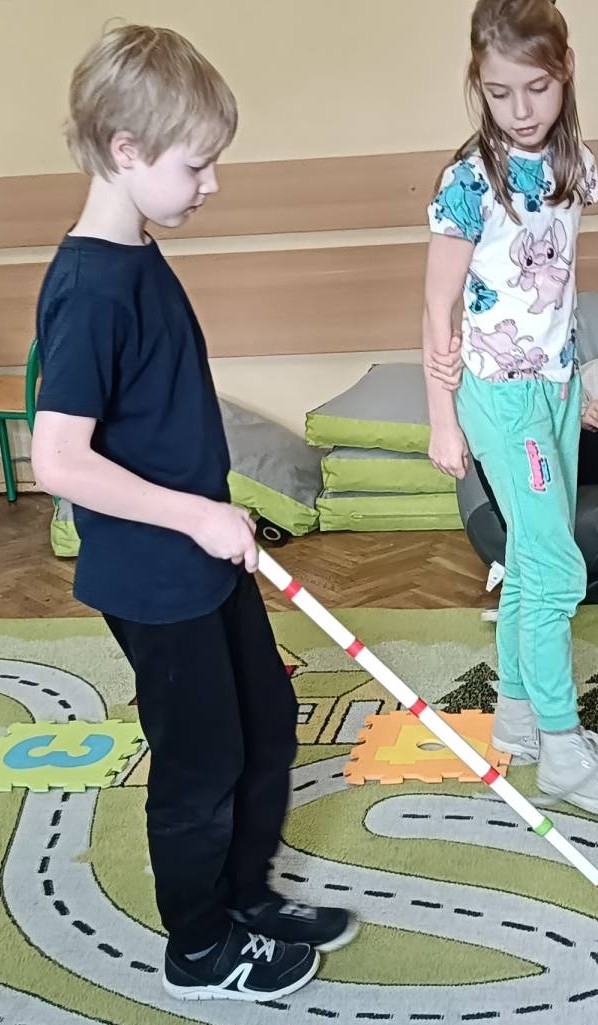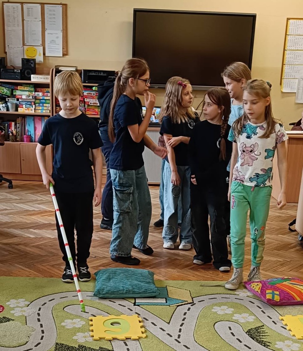 W dniu 12 listopada 2025 roku (środa) w naszej szkolnej świetlicy odbyły się zajęcia psychoedukacyjne z elementami socjoterapii poświęcone tematyce z okazji Międzynarodowego Dnia Osób Niewidomych w ramach działań szkoły włączającej. Uczniowie z klas młodszych 2b, 3d, 3d zostali wprowadzeni w tematykę pojęcia „osoba niewidoma”, „osoba niedowidząca”, „wada wzroku”. Uczniowie z klas 2 i 3 podczas zajęć uczestniczyli w zabawach integracyjnych polegających na wcieleniu się w rolę osoby niewidomej, która prosi o pomoc w różnych sytuacjach. Zabawy mające na celu integrację, empatię, współpracę w grupie pomogły dzieciom zrozumieć, że pomoc osobie z niepełnosprawnością sprawia nam radość, ułatwia relację z innymi np. „Ślepiec”, „Makarena”, „Pociągi”, „Kto tak jak ja?”, „Lustro i mim”. Dzieci uważanie i z dużą empatią uczestniczyły w tych zajęciach, były bardzo ciekawe i z chęcią wykonały zaproponowane ćwiczenia praktyczne. Uczniowie z zaangażowaniem uczestniczyli w zaproponowanych zabawach integracyjnych. Dzieci wykonały pracę plastyczną wcielając się w rolę projektanta oprawek do okularów dla osoby niewidomej.