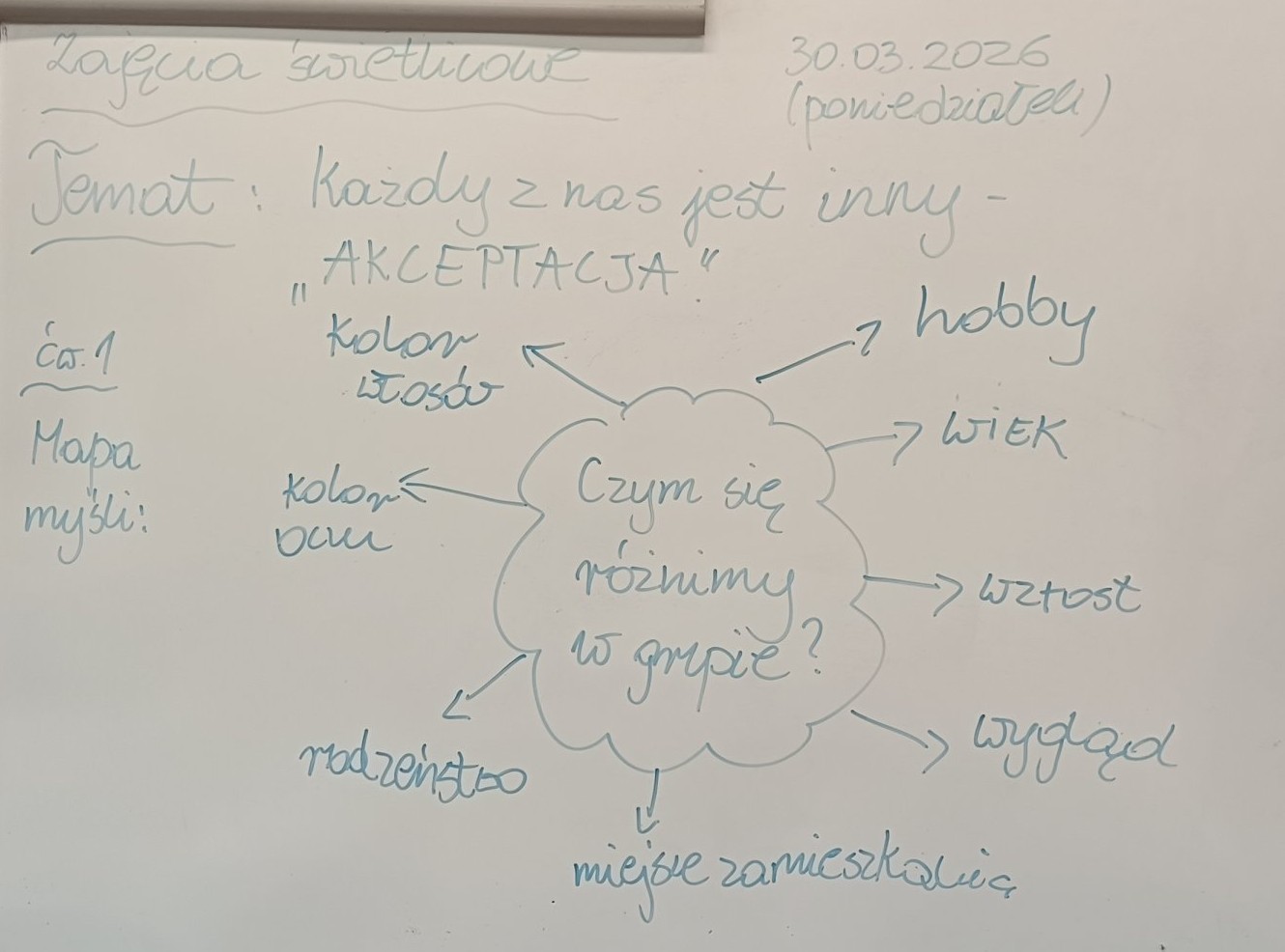 W dniu 30 marca 2026 roku (poniedziałek) w naszej szkole odbyły się zajęcia uspołeczniające w ramach działań szkoły włączającej z okazji Światowego DniaOsób Autystycznych z elementami muzykoterapii dla uczniów z klas 2 i 3 pt. „Każdy z nas jest inny – pojęcie akceptacji”. W ramach działań adaptacyjnych dla uczniów z klas 2 i 3 zostały zorganizowane zabawy ruchowe na kreatywność. Uczniowie zostali wprowadzeni w tematykę pojęć: „niepełnosprawność”, „osoba neuroróżnorodna”, „autyzm”. Dzieci miały powiedzieć z czym kojarzy im się fakt, że każdy z nas jest inny czyli czym się między sobą różnimy? Następnie już będąc w sali na zajęciach mieli podać przykład bycia życzliwym kolegą lub koleżanką wobec osoby autystycznej w grupie rówieśniczej. Wykonując to ćwiczenie na kreatywność dzieci słuchały wybranych utworów muzyki klasycznej, która miała pobudzić ich wyobraźnie oraz kreatywność. Uczniom bardzo podobały się te ćwiczenia kreatywne. Zajęcia nie tylko miały uwrażliwić uczniów na tematykę osób autystycznych, pobudzić ich kreatywność w zabawie w grupie rówieśniczej. Podczas zabaw ruchowych na świeżym powietrzu, dzieci mogły doświadczyć integracji w grupie rówieśniczej mimo różnorodności.