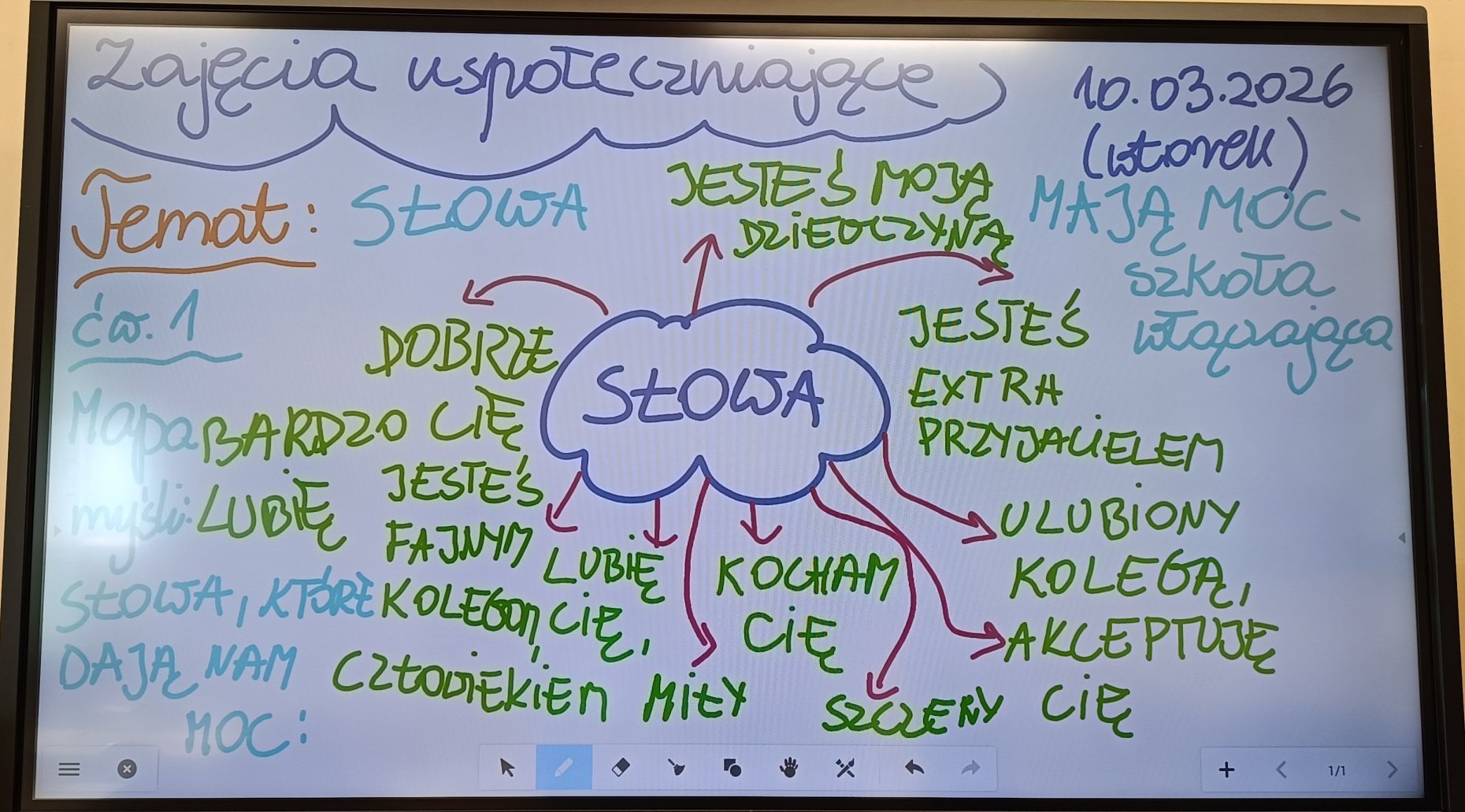 W dniu 10 marca 2026 roku (wtorek) w naszej szkolnej świetlicy odbyły się zajęcia świetlicowe pt. „Słowa mają moc” dla uczniów z klasy 1a, 2c w ramach działań szkoły włączającej. Uczniowie z klasy 2c i 1a zostali wprowadzeni w tematykę pojęcia „słowa”, „moc”, „pozytywne myślenie”. Uczniowie z klas 1a i 2c podczas zajęć świetlicowych mieli za zadanie wcielić się w rolę kreatora nowych słów i wymyśleć własny zestaw, który ich motywuje do działania. Zabawa plastyczna mające na celu poszerzenie własnej wyobraźni i pomysłowości oraz współpracy w grupie pomogły dzieciom otworzyć się na własną twórczość plastyczną. Dzieci uważanie i z dużą empatią uczestniczyły w tych zajęciach, były bardzo ciekawe i z chęcią wykonały zaproponowane ćwiczenia praktyczne. Uczniowie z zaangażowaniem uczestniczyli w zaproponowanych zajęciach świetlicowych. Uczniowie wykonali prace plastyczną na konkurs pod tym samym tytułem techniką dowolną.