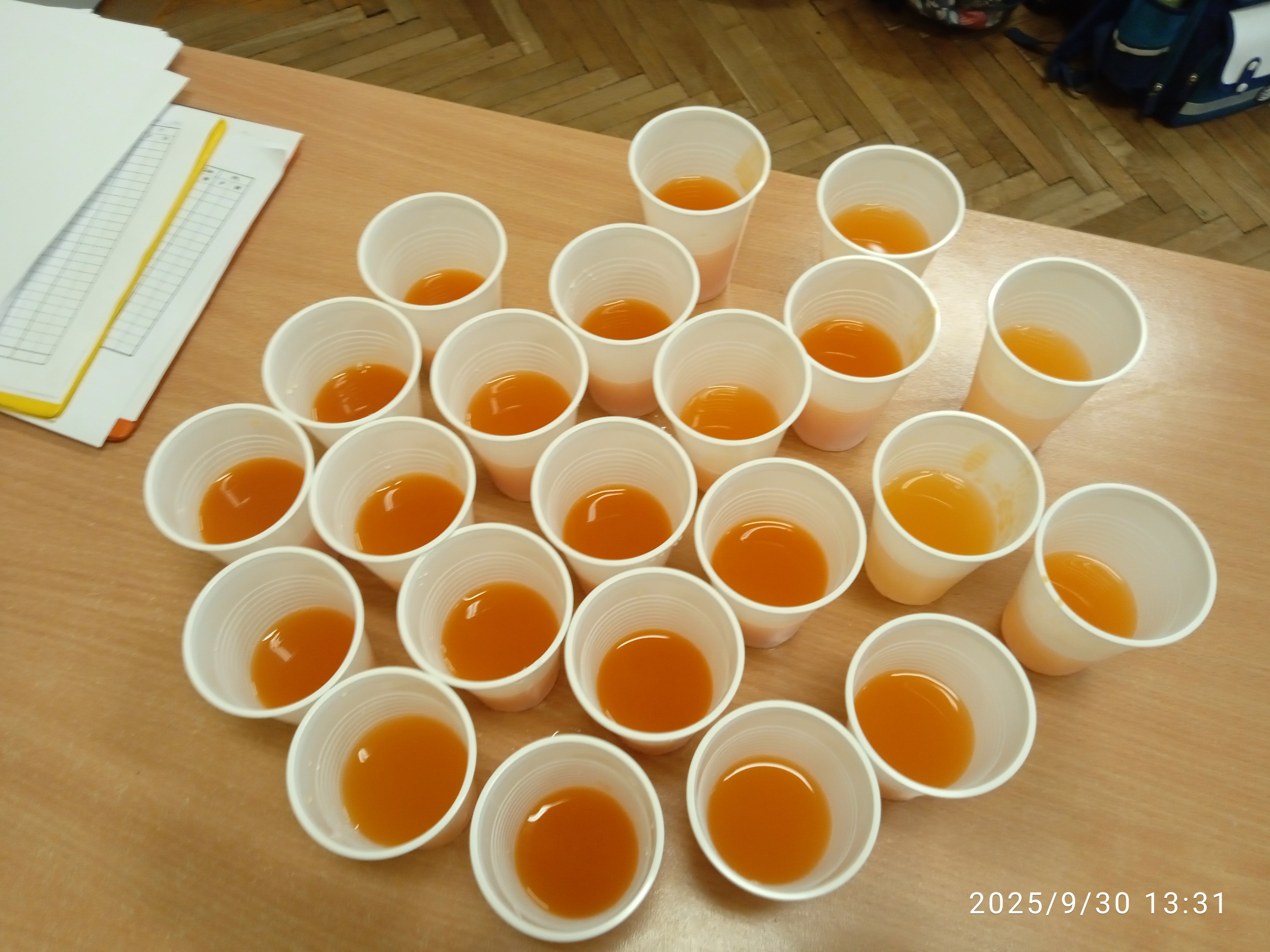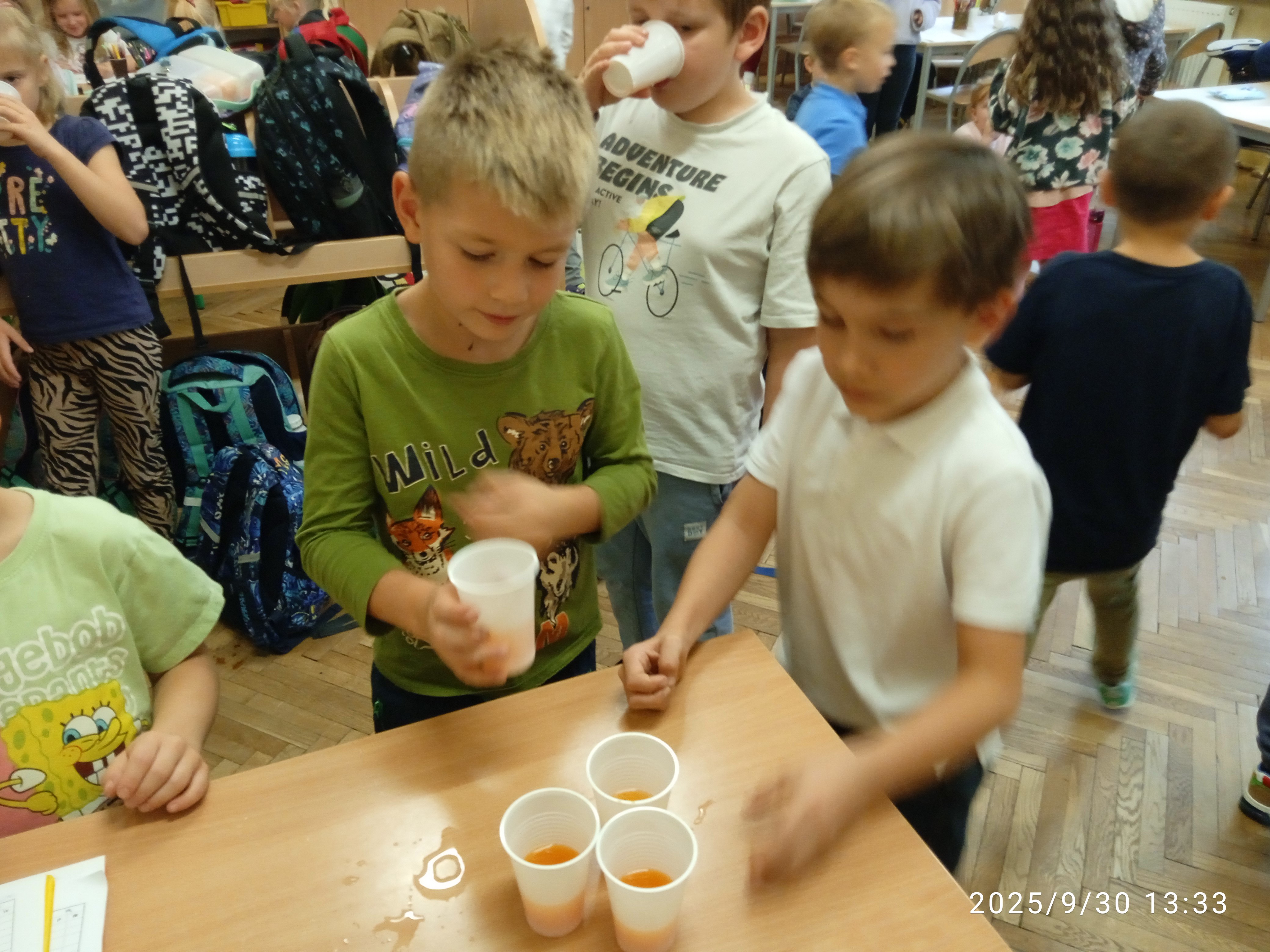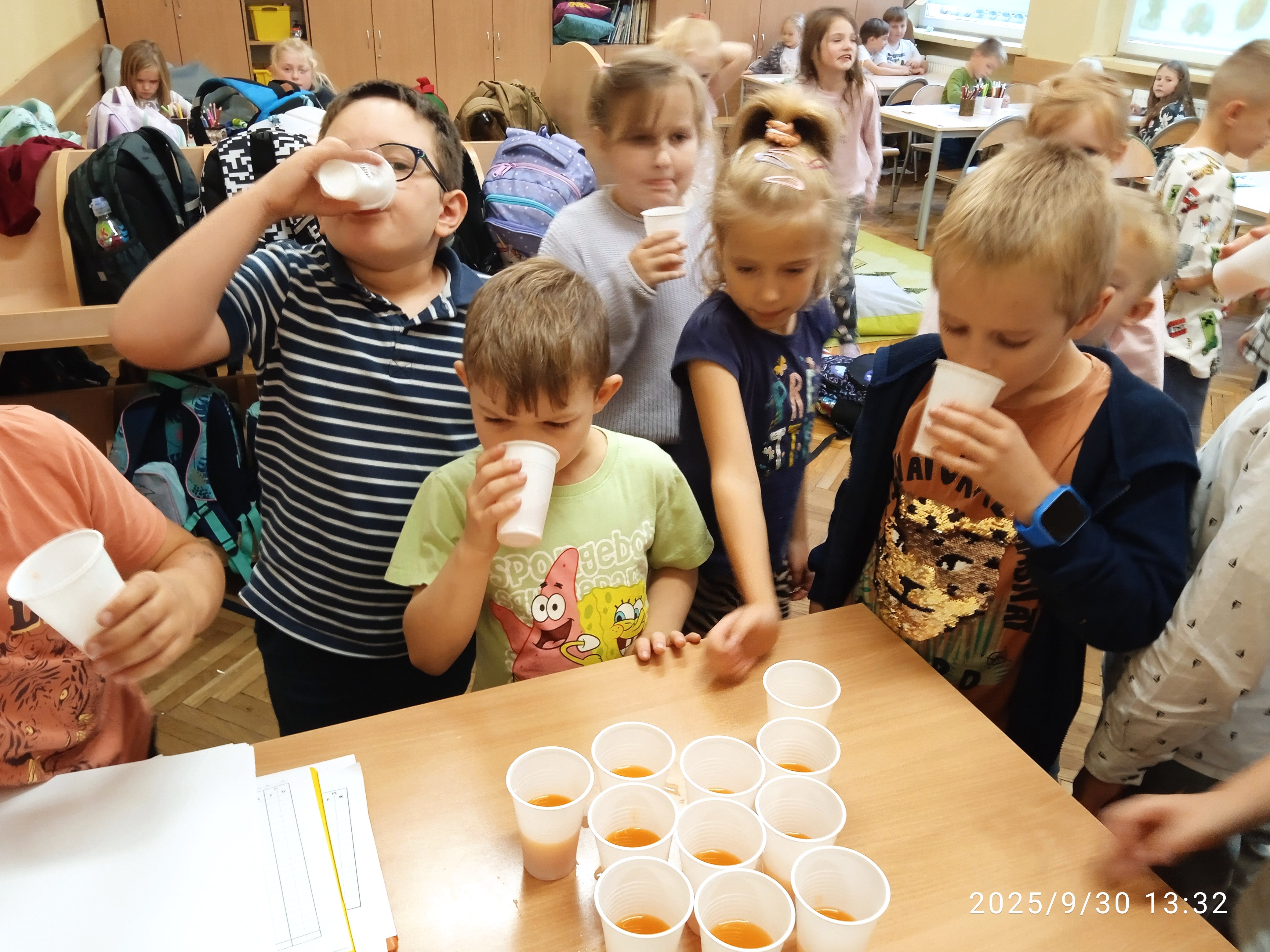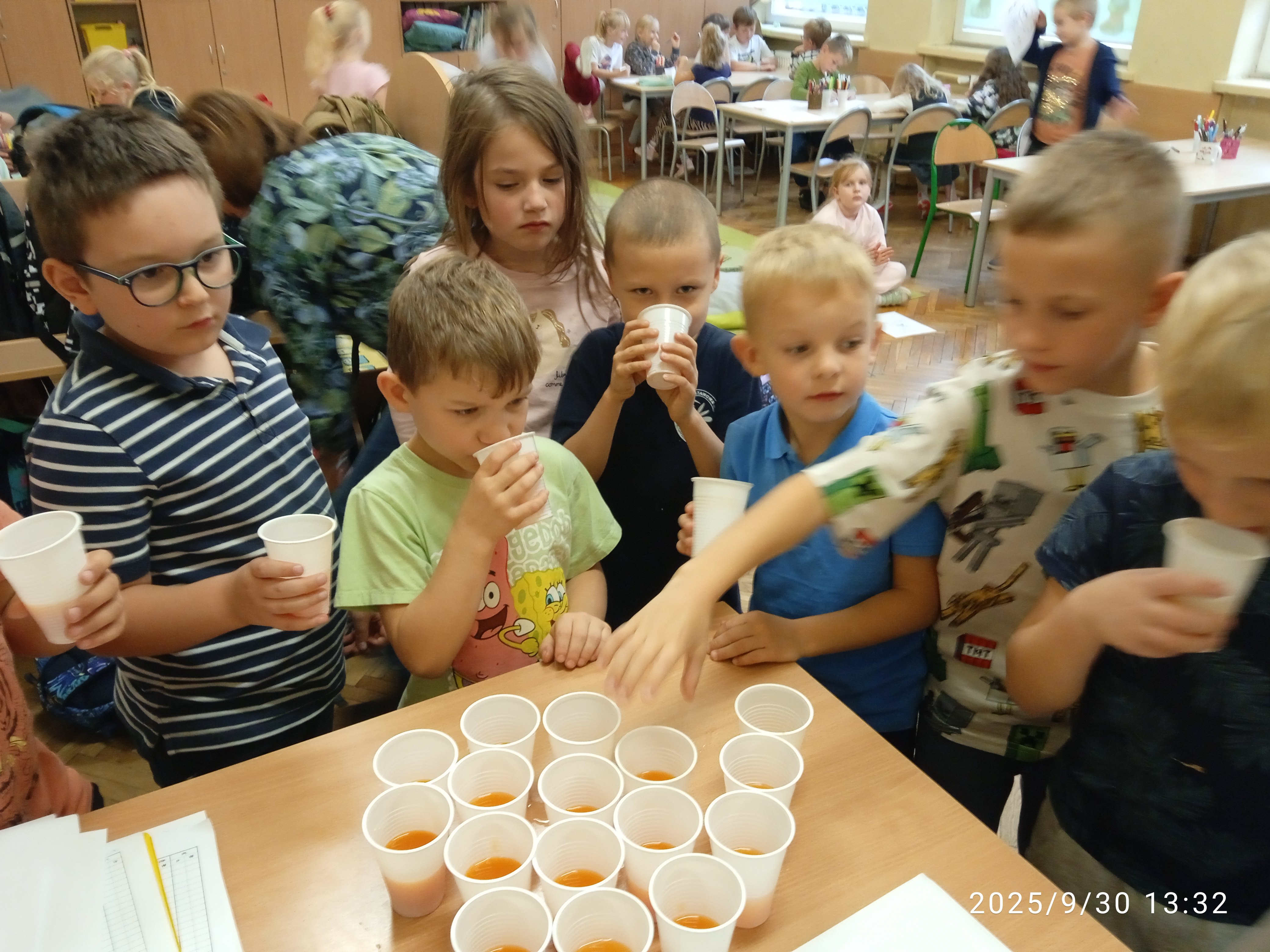 Podczas zajęć o skarbach i darach jesieni chętni uczniowie klasy 1a i 1b dzielili się propozycjami na pyszną i zdrową sałatkę owocową lub warzywną. Dzieci miały też okazję do degustacji soku marchewkowo- jabłkowego.