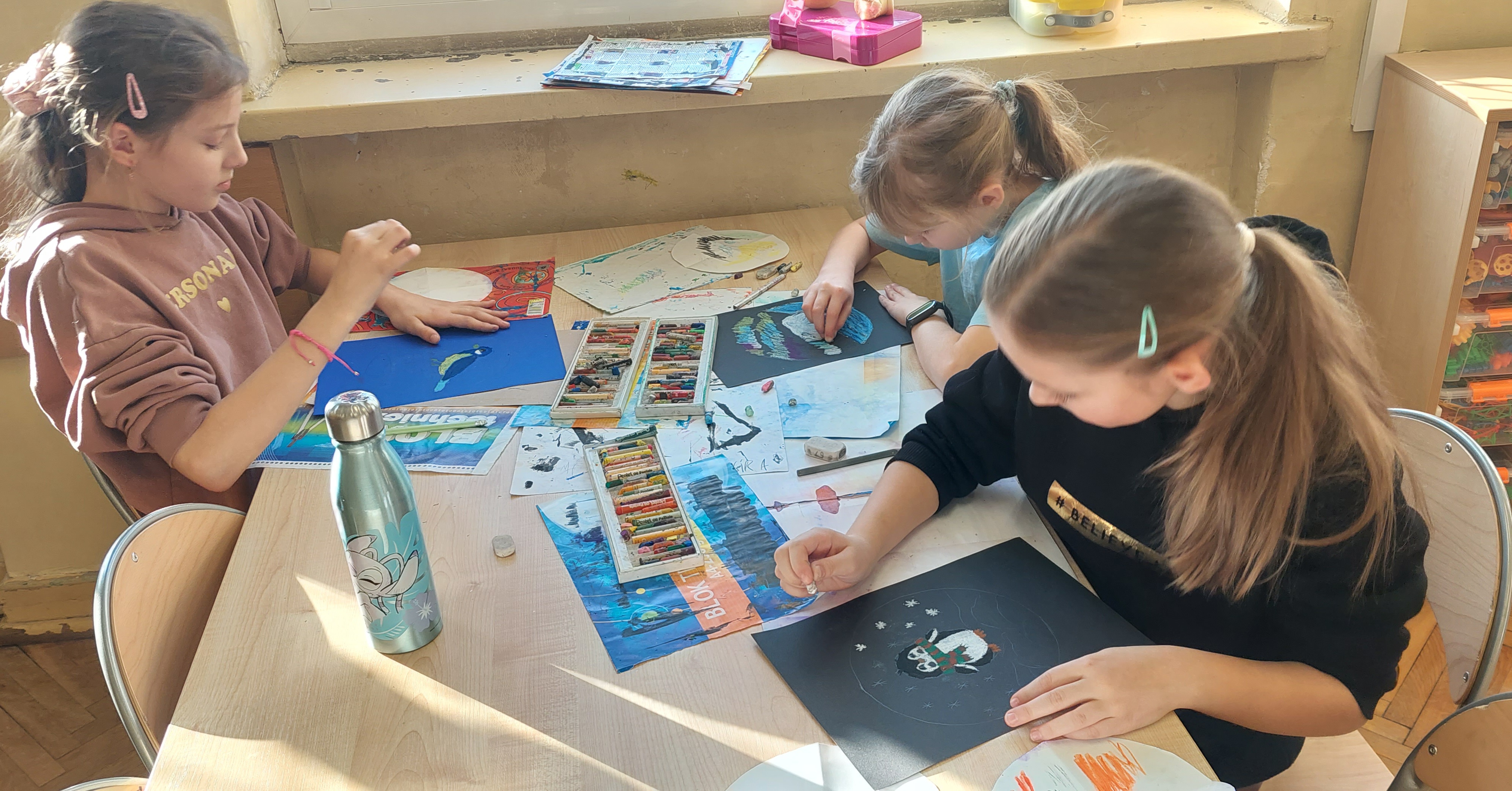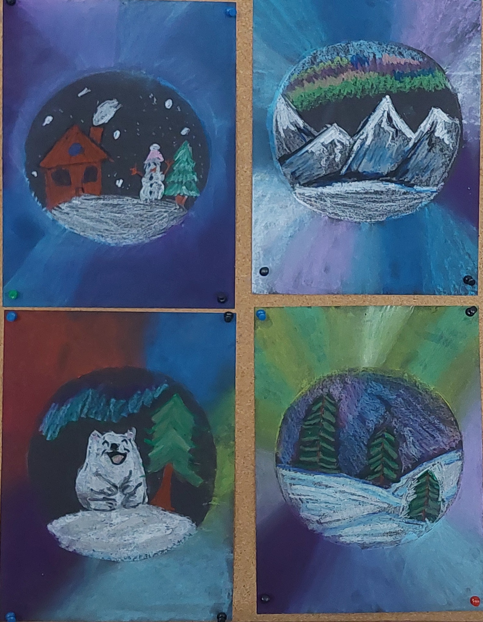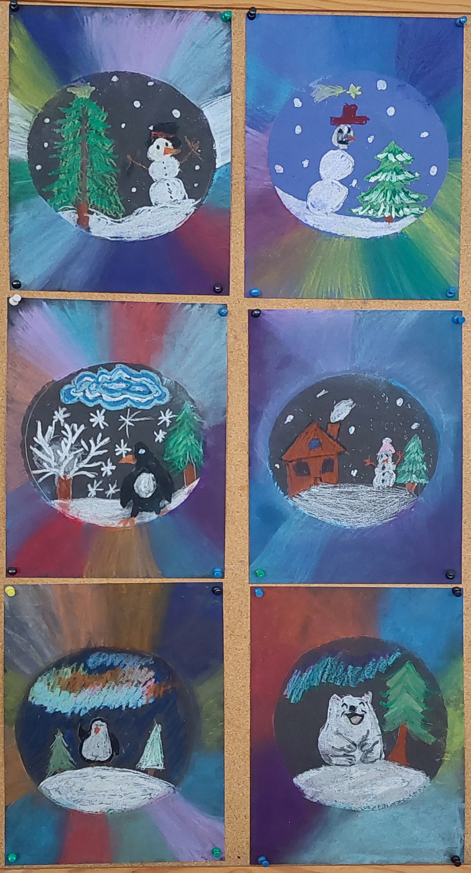 Głównym zadaniem było zaprojektowanie kuli śnieżnej. Uczniowie uruchomili swoją wyobraźnię i przy użyciu pasteli olejnych stworzyli zimowe krajobrazy. Na pracach pojawiły się góry, parki, niedźwiedzie, pingwiny oraz wiele innych ciekawych motywów. Aby wzbogacić kompozycje o dodatkowe kolory i efekty, dzieci wykonały kolorowe pasy suchymi pastelami, które nawiązywały do zorzy polarnej. Powstały barwne i bardzo pomysłowe prace.